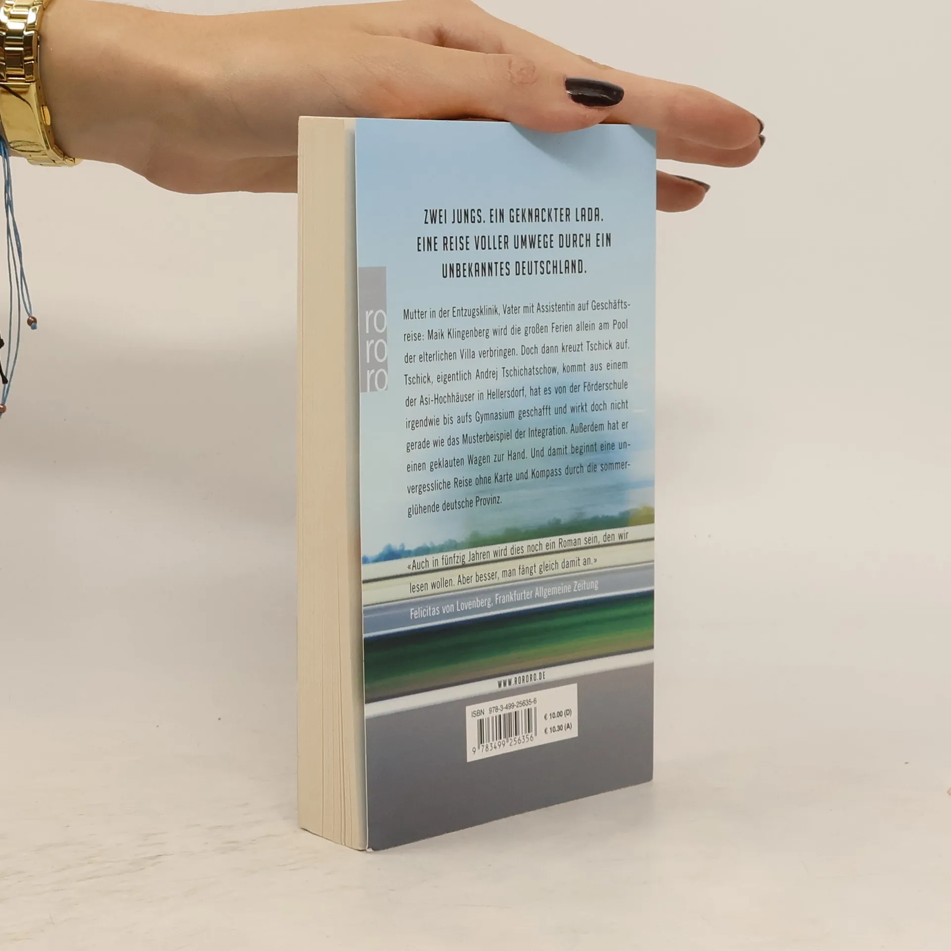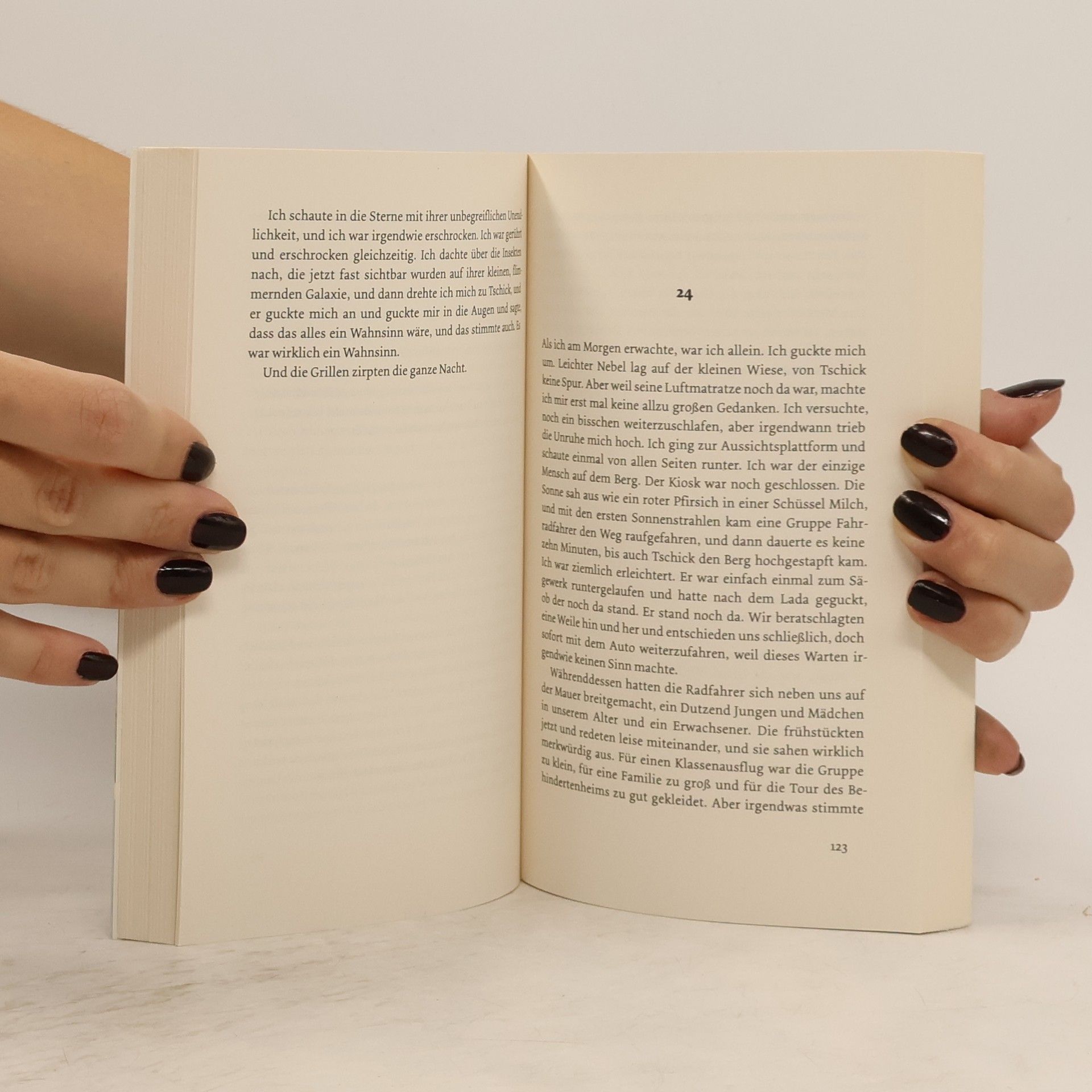 «Ein klappriges Auto kam die Straße runtergefahren. Es fuhr langsam auf unser Haus zu und bog in die Garagenauffahrt ein. Eine Minute stand der hellblaue Lada Niva mit laufendem Motor vor unserer Garage, dann wurde der Motor abgestellt. Die Fahrertür ging auf, Tschick stieg aus. Er legte beide Ellenbogen aufs Autodach und sah zu, wie ich den Rasen sprengte. ‹Ah›, sagte er, und dann sagte er lange nichts mehr. ‹Macht das Spaß?›» Mutter in der Entzugsklinik, Vater mit Assistentin auf Geschäftsreise: Maik Klingenberg wird die großen Ferien allein am Pool der elterlichen Villa verbringen. Doch dann kreuzt Tschick auf. Tschick, eigentlich Andrej Tschichatschow, kommt aus einem der Asi-Hochhäuser in Hellersdorf, hat es von der Förderschule irgendwie bis aufs Gymnasium geschafft und wirkt doch nicht gerade wie das Musterbeispiel der Integration. Außerdem hat er einen geklauten Wagen zur Hand. Und damit beginnt eine Reise ohne Karte und Kompass durch die sommerglühende deutsche Provinz, unvergesslich wie die Flussfahrt von Tom Sawyer und Huck Finn.