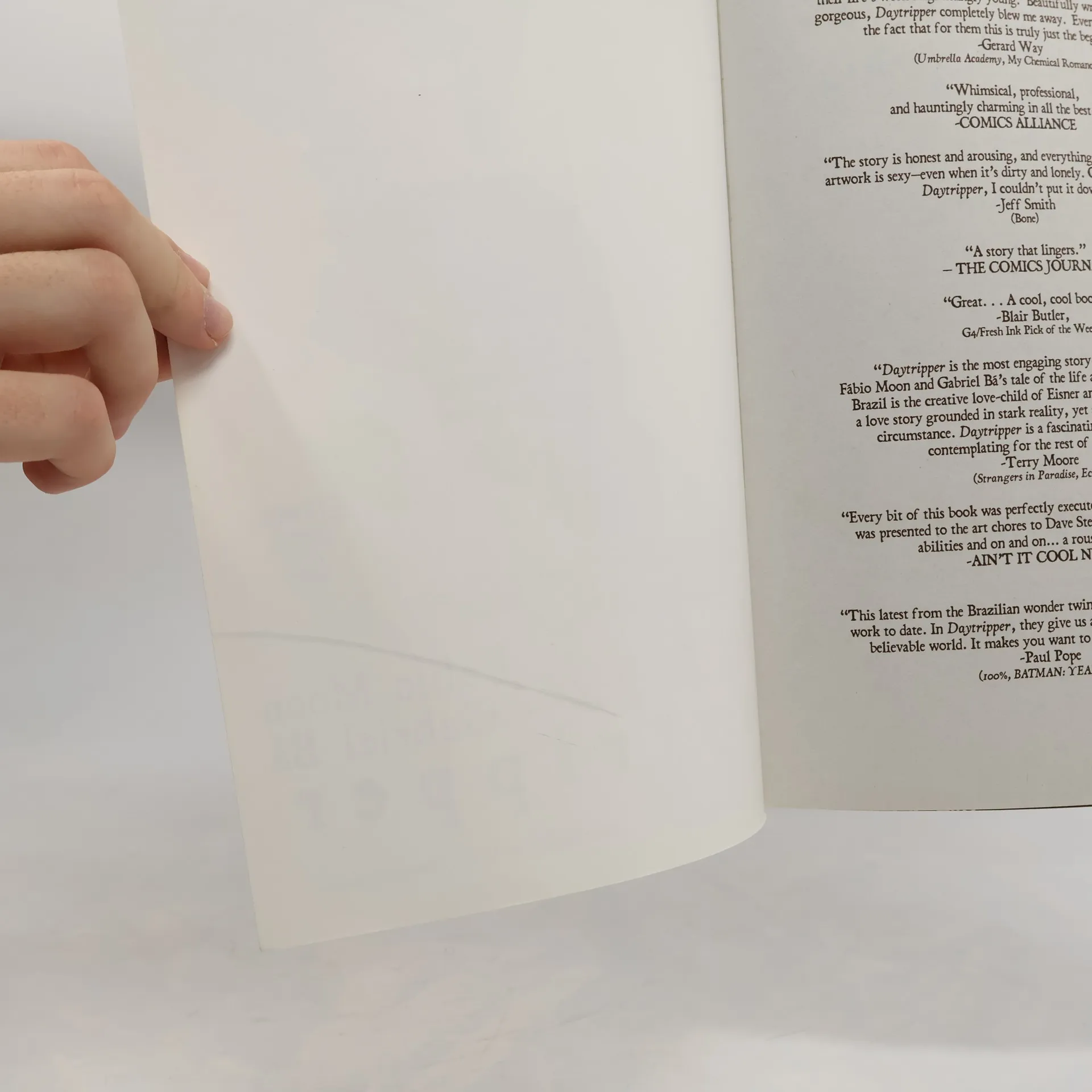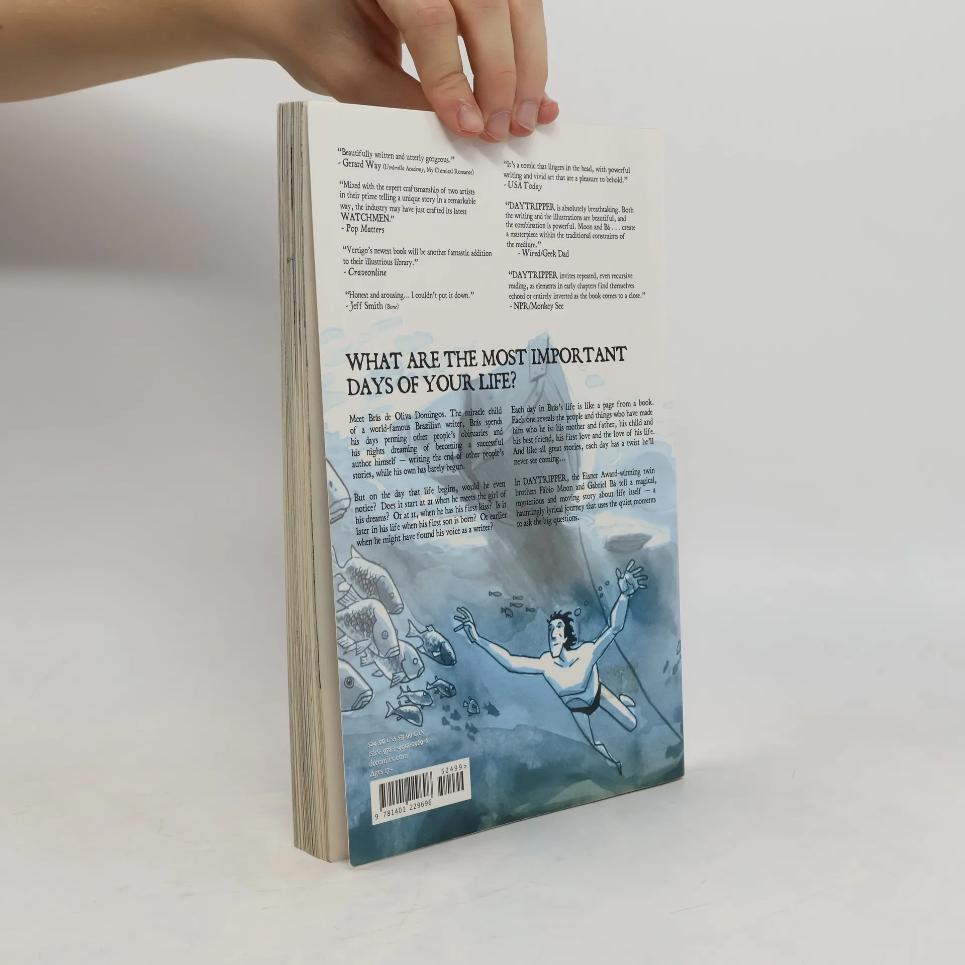 What are the most important days of your life?Meet Brás de Oliva Domingos. The miracle child of a world-famous Brazilian writer, Brás spends his days penning other people's obituaries and his nights dreaming of becoming a successful author himself—writing the end of other people's stories, while his own has barely begun.But on the day that life begins, would he even notice? Does it start at 21 when he meets the girl of his dreams? Or at 11, when he has his first kiss? Is it later in his life when his first son is born? Or earlier when he might have found his voice as a writer?Each day in Brás's life is like a page from a book. Each one reveals the people and things who have made him who he is: his mother and father, his child and his best friend, his first love and the love of his life. And like all great stories, each day has a twist he'll never see coming...In Daytripper, the Eisner Award-winning twin brothers Fábio Moon and Gabriel Bá tell a magical, mysterious and moving story about life itself—a hauntingly lyrical journey that uses the quiet moments to ask the big questions.