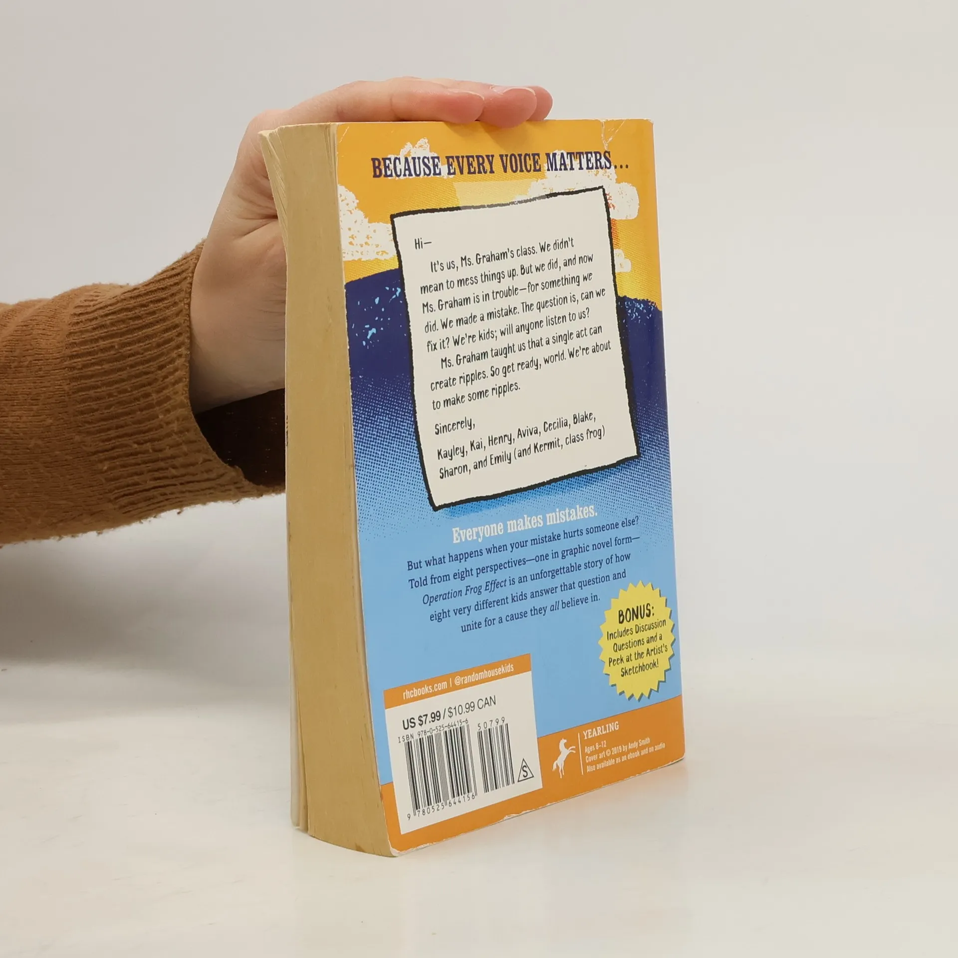 NOMINATED FOR MULTIPLE STATE AWARDS! If one small act can create a ripple across the universe . . . what happens when a whole group of kids join together and act? Told in eight perspectives--including one in graphic novel form--Operation Frog Effect is perfect for fans of Andrew Clements, Rob Buyea, and Sarah Weeks, and for anyone who wants to make a difference. Hi-- It's us, Ms. Graham's class. We didn't mean to mess things up. But we did. We took things too far, and now Ms. Graham is in trouble--for something we did. We made a mistake. The question is, can we fix it? Ms. Graham taught us that we get to choose the kind of people we want to be and that a single act can create ripples. So get ready, world--we're about to make some ripples. Sincerely, Kayley, Kai, Henry, Aviva, Cecilia, Blake, Sharon, Emily (and Kermit, class frog) Everyone makes mistakes. But what happens when your mistake hurts someone else? Told in eight perspectives--including one in graphic novel form, Operation Frog Effect celebrates standing up and standing together, and tells the unforgettable story of how eight very different kids take responsibility for their actions and unite for a cause they all believe in. "A heartfelt novel with complex characters who realize that to promote change in the world, they first have to change how they see each other."--John David Anderson, author of Ms. Bixby's Last Day