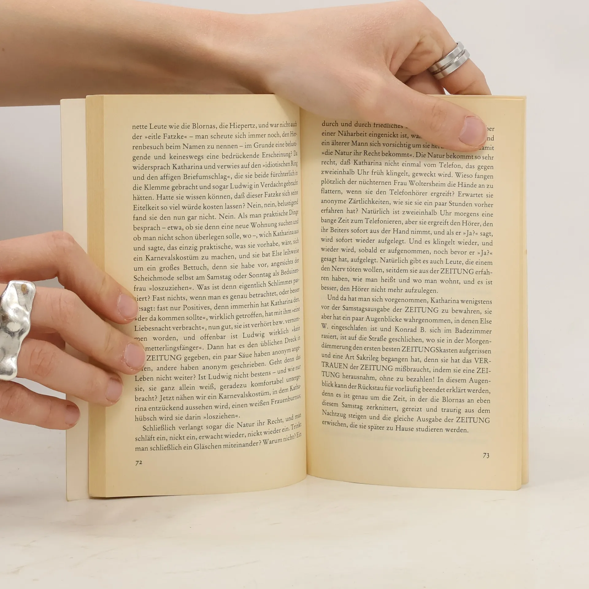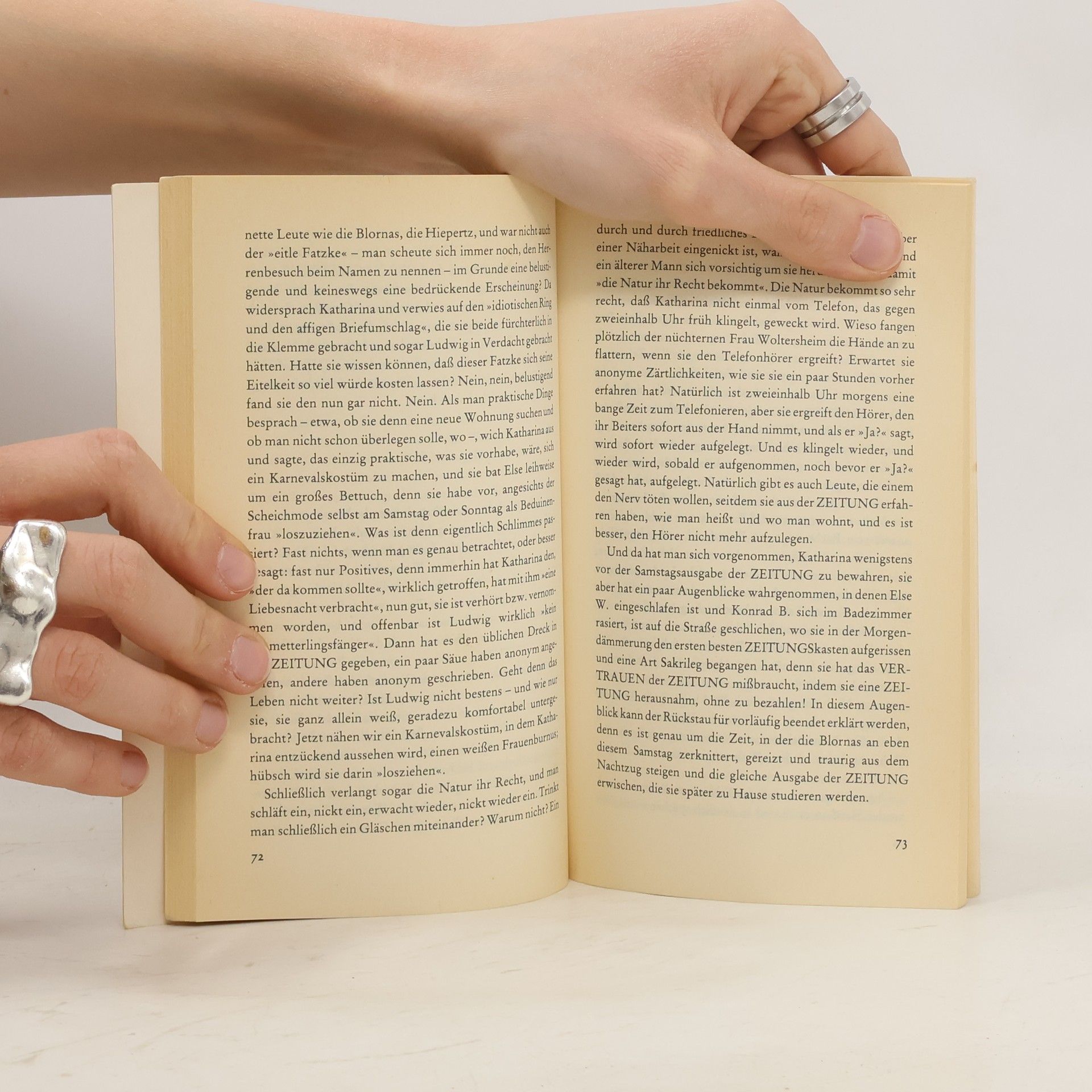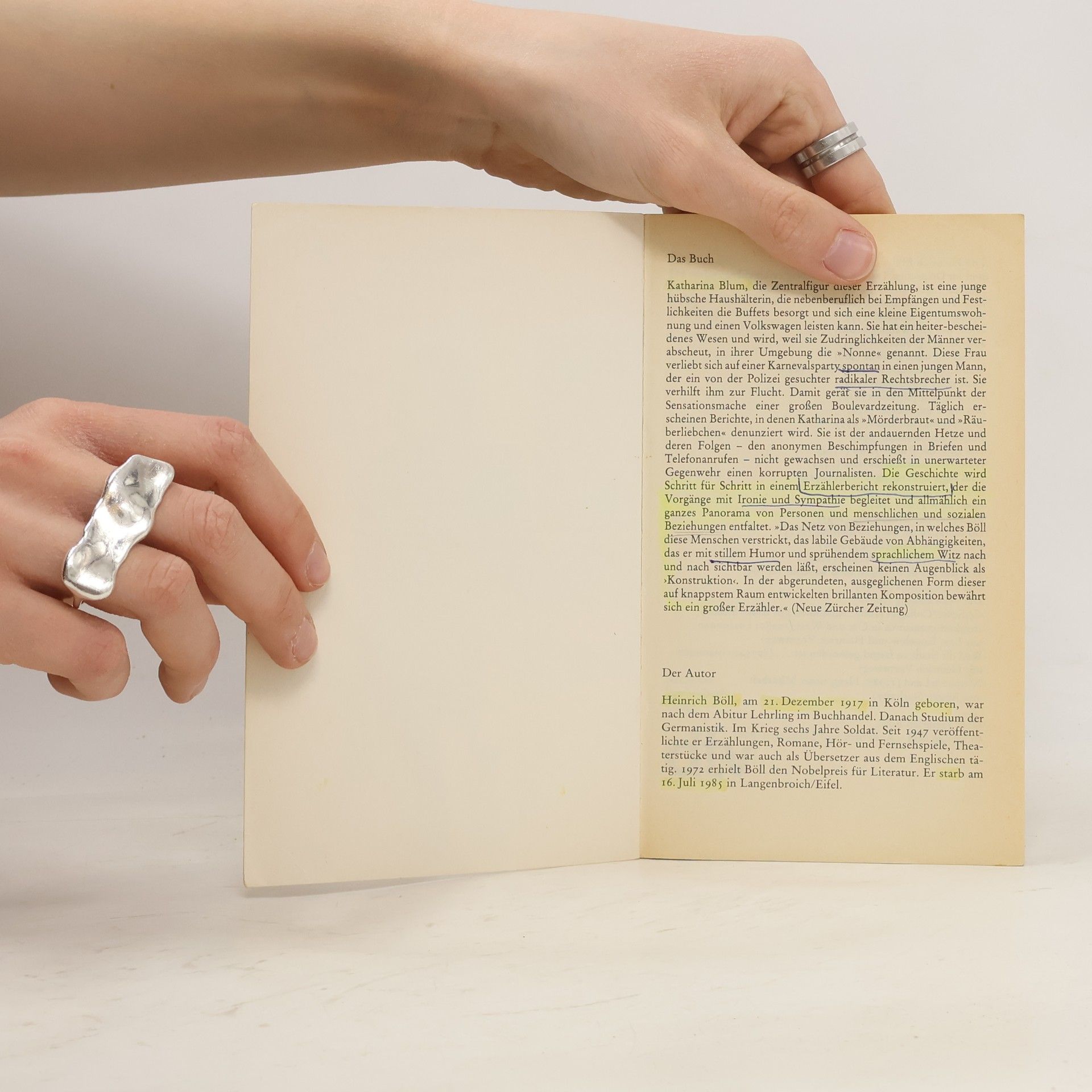 »Ähnlichkeiten mit den Praktiken der ›Bild‹-Zeitung [...] sind weder beabsichtigt noch zufällig, sondern unvermeidlich.« Aus dem Vorwort Bölls Katharina Blum ist eine junge hübsche Haushälterin, die sich eine kleine Eigentumswohnung und einen Volkswagen leisten kann. Sie hat ein heiter-bescheidenes Wesen und wird, weil sie Zudringlichkeiten der Männer verabscheut, in ihrer Umgebung die »Nonne« genannt. Diese Frau verliebt sich spontan in einen jungen Mann, einen von der Polizei gesuchten radikalen Rechtsbrecher. Sie verhilft ihm zur Flucht und gerät in den Mittelpunkt der Sensationsmache einer großen Boulevardzeitung. Die Situation eskaliert, als der Journalist Werner Tötges in ihre Wohnung kommt ...