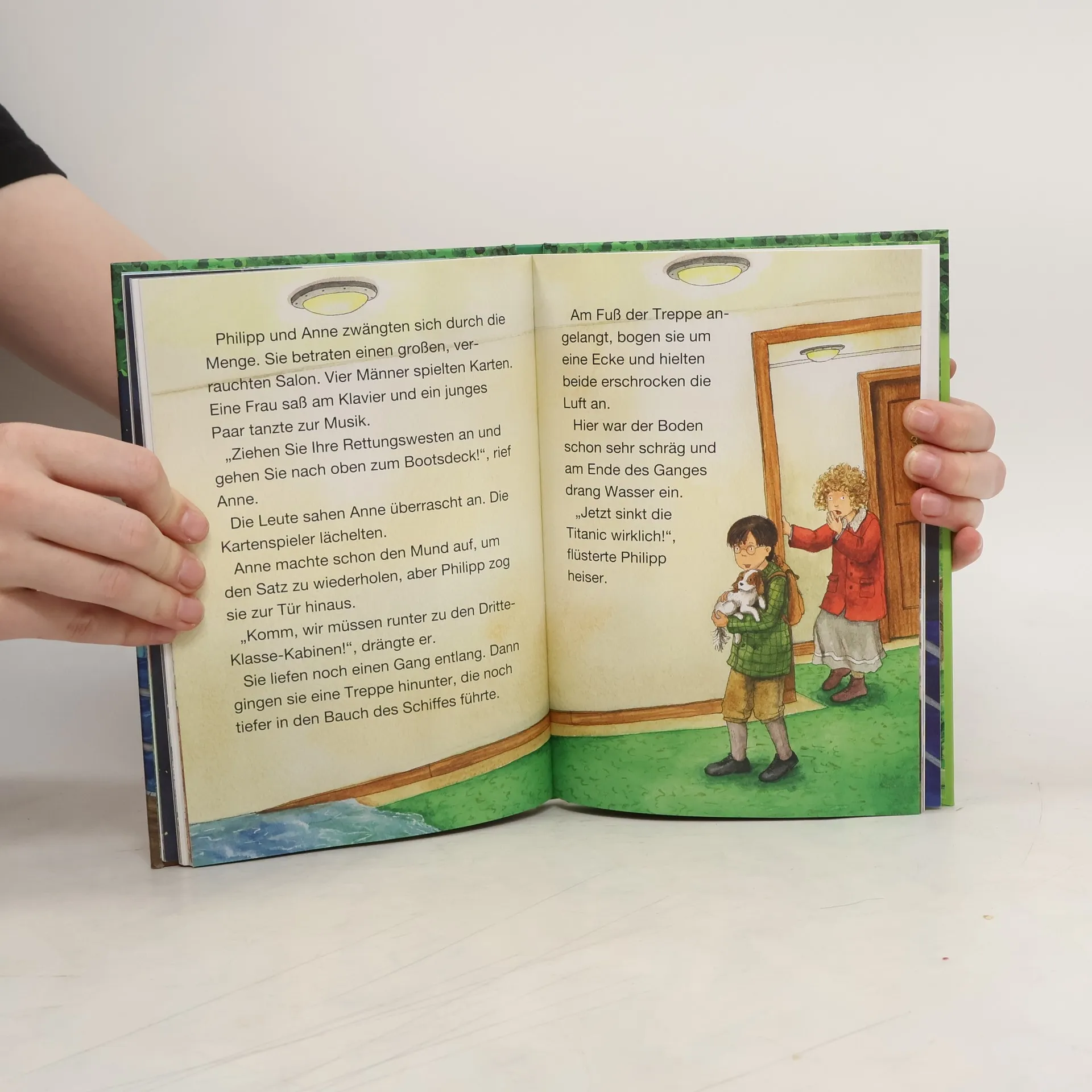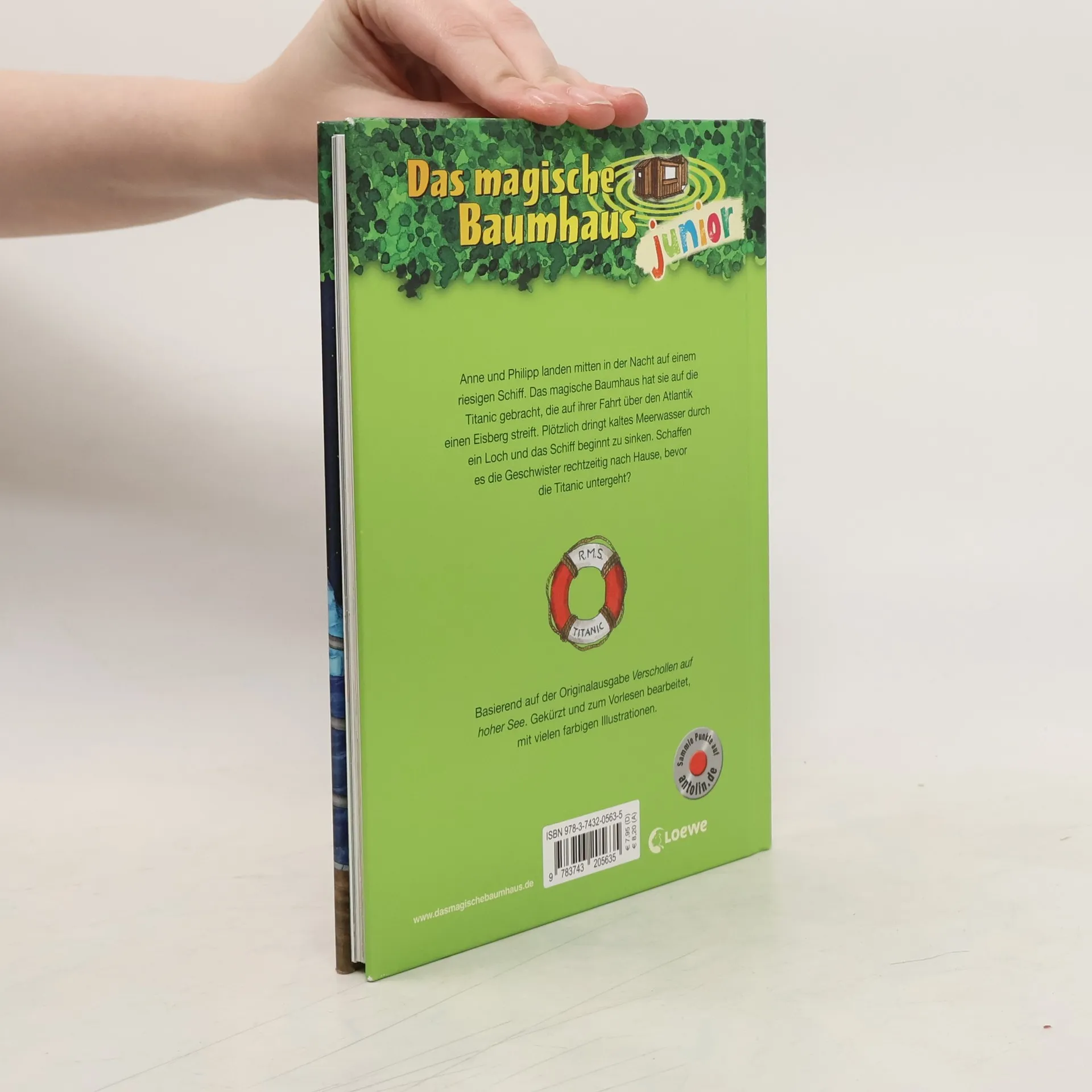Komm mit auf die Titanic!Anne und Philipp landen mitten in der Nacht auf einem riesigen Schiff. Das magische Baumhaus hat sie auf die Titanic gebracht, die auf ihrer Fahrt über den Atlantik einen Eisberg streift. Plötzlich läuft das Schiff mit kaltem Meerwasser voll und beginnt zu sinken. Schaffen es die Geschwister rechtzeitig nach Hause, bevor die Titanic untergeht?