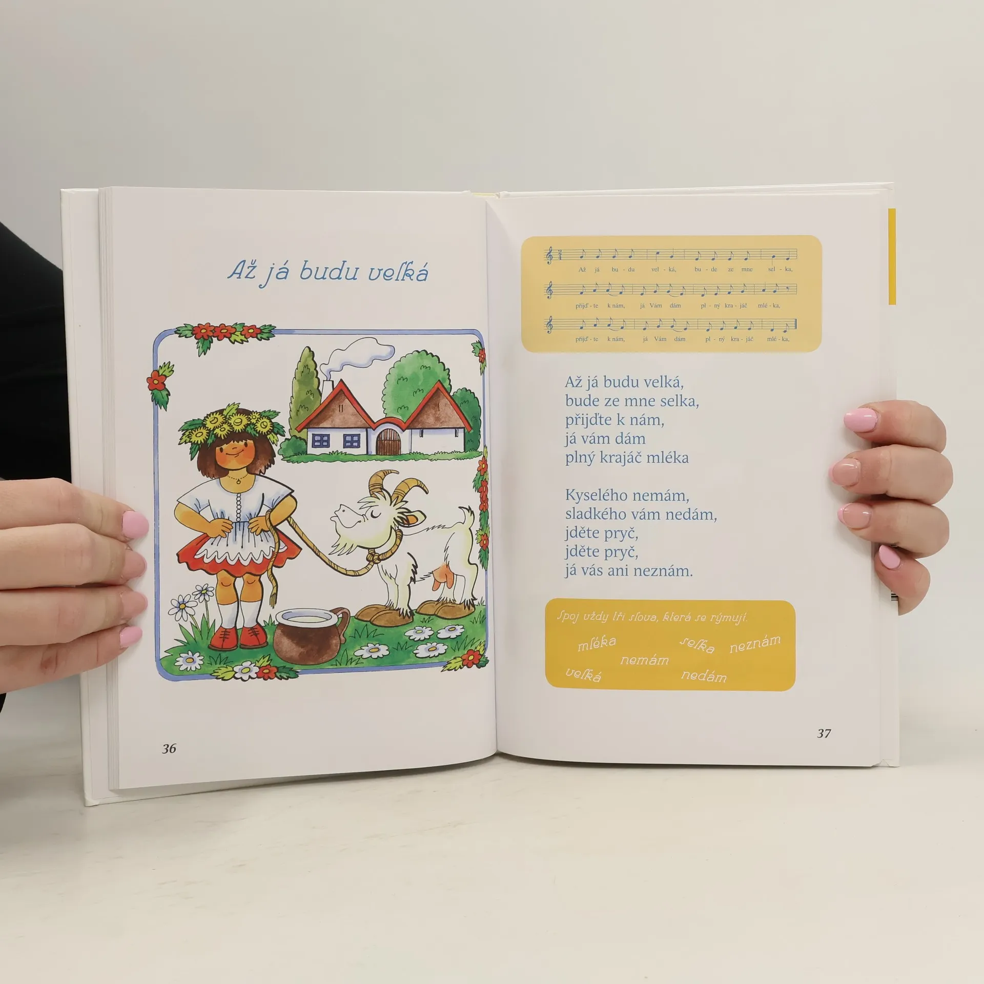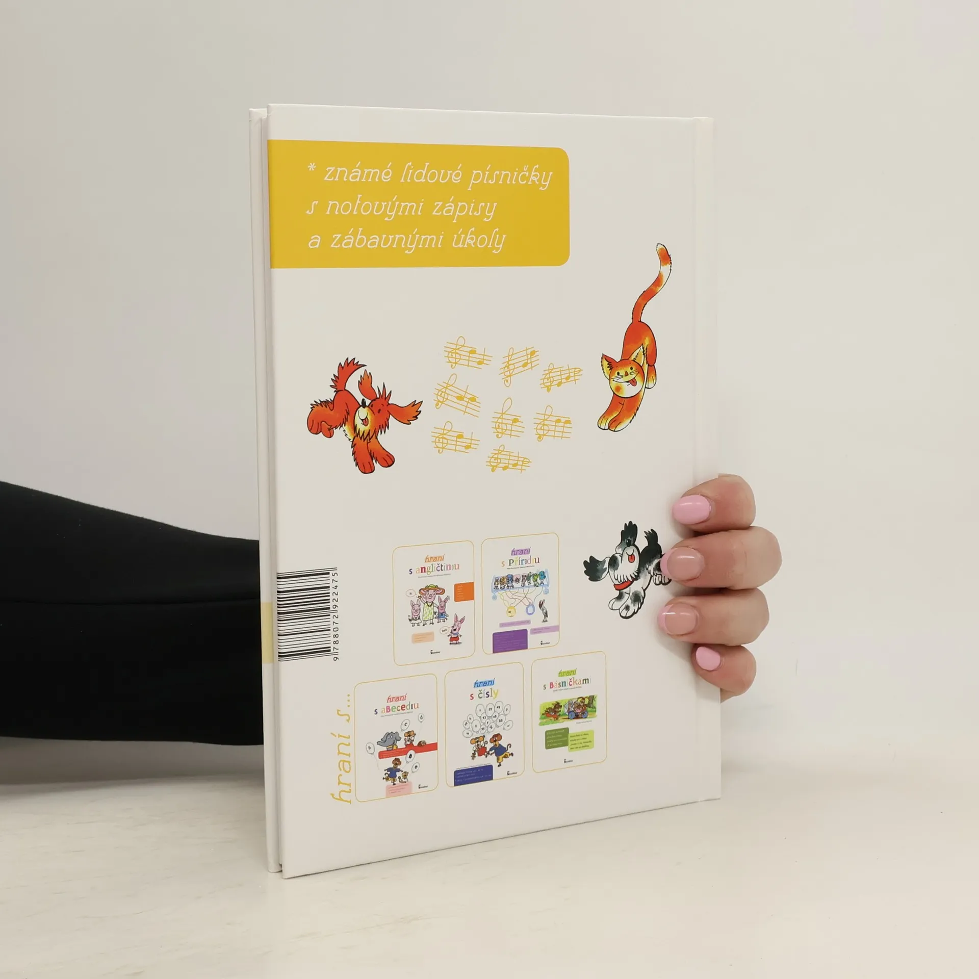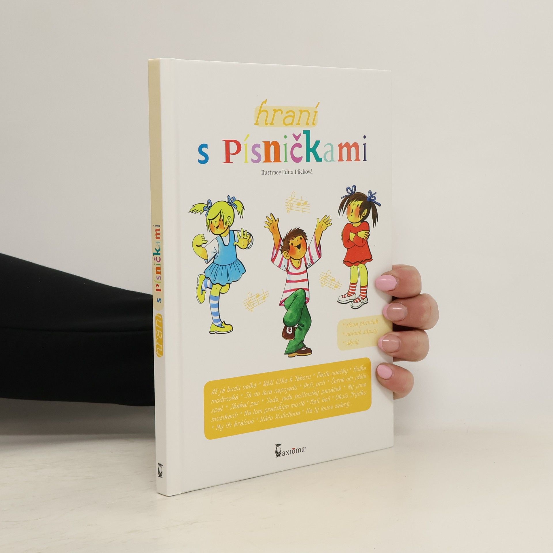 Známé lidové písničky se všemi slokami, jejich notovými zápisy a velkým barevným obrázkem a hudebním úkolem ke každé z nich.