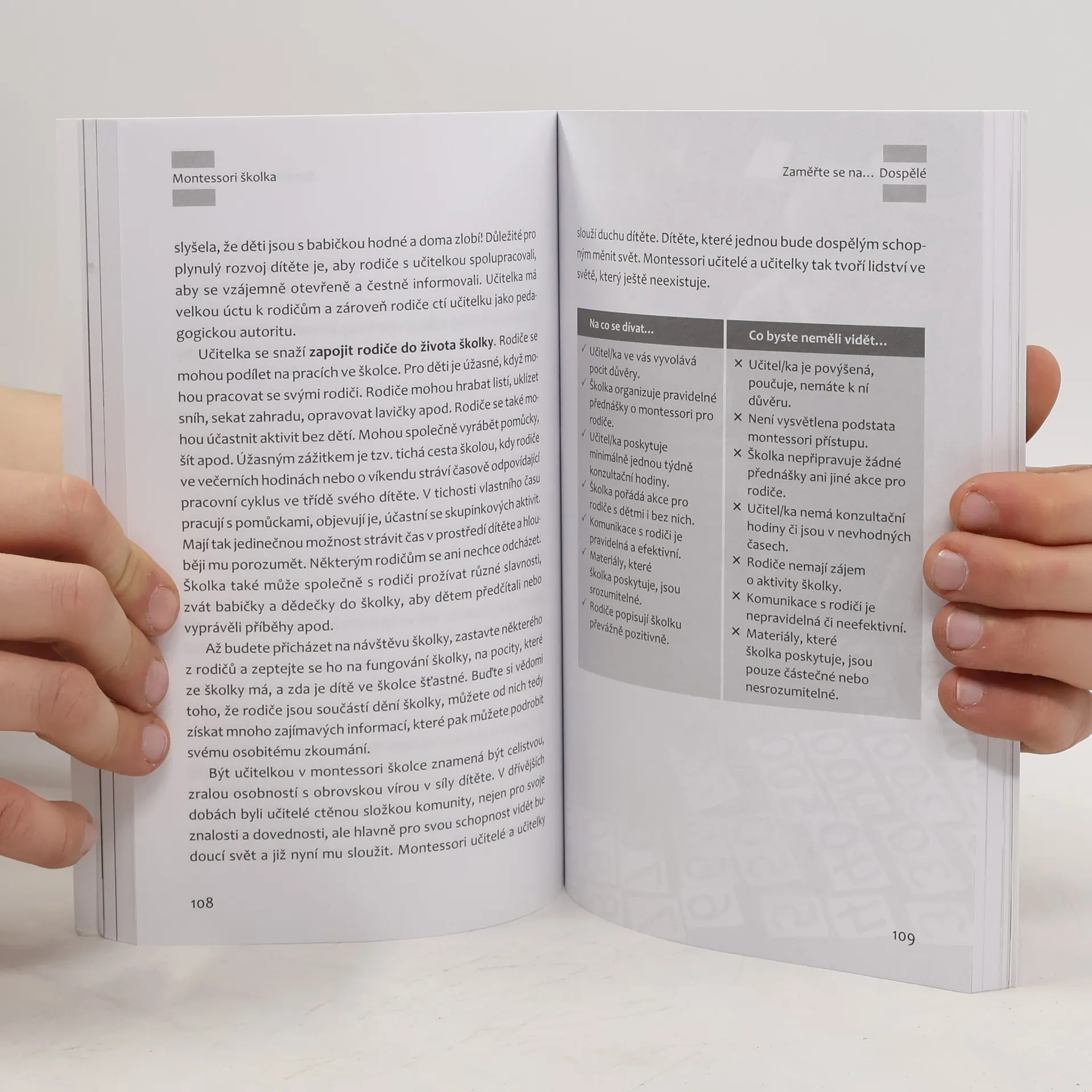 Montessori pedagogika se mezi rodiče stále více šíří, což vede k vzniku mnoha mateřských škol s tímto názvem. Rodiče však často nevědí, co od těchto zařízení očekávat, a mohou mít potíže s rozpoznáním kvalitní montessori školky, která skutečně dodržuje dané principy. Kniha má za cíl ukázat, jak autentická školka vypadá, a odpovědět na otázky, které rodiče při návštěvě montessori zařízení mají. Vysvětluje, proč se některé věci dějí, jako například absence sněhuláků na nástěnkách, pracovní ticho ve třídě, nebo proč se děti nesetkávají na společném kruhu. Rodiče se tak stávají informovanými partnery pedagogů, což jim umožňuje klást správné otázky a rozhodnout se, která školka je pro jejich dítě nejvhodnější. Autorka, Mgr. Hana Slabá, je zkušená lingvistka a pedagožka, která učila na Filosofické fakultě Univerzity Karlovy a absolvovala mezinárodní kurz pro učitele dětí ve věku 3-6 let. Vedla montessori mateřskou školu a má zkušenosti z různých zemí. Pracuje jako montessori metodička a odborná asistentka v Montessori Institutu Praha a vychovává tři děti v duchu montessori principů.