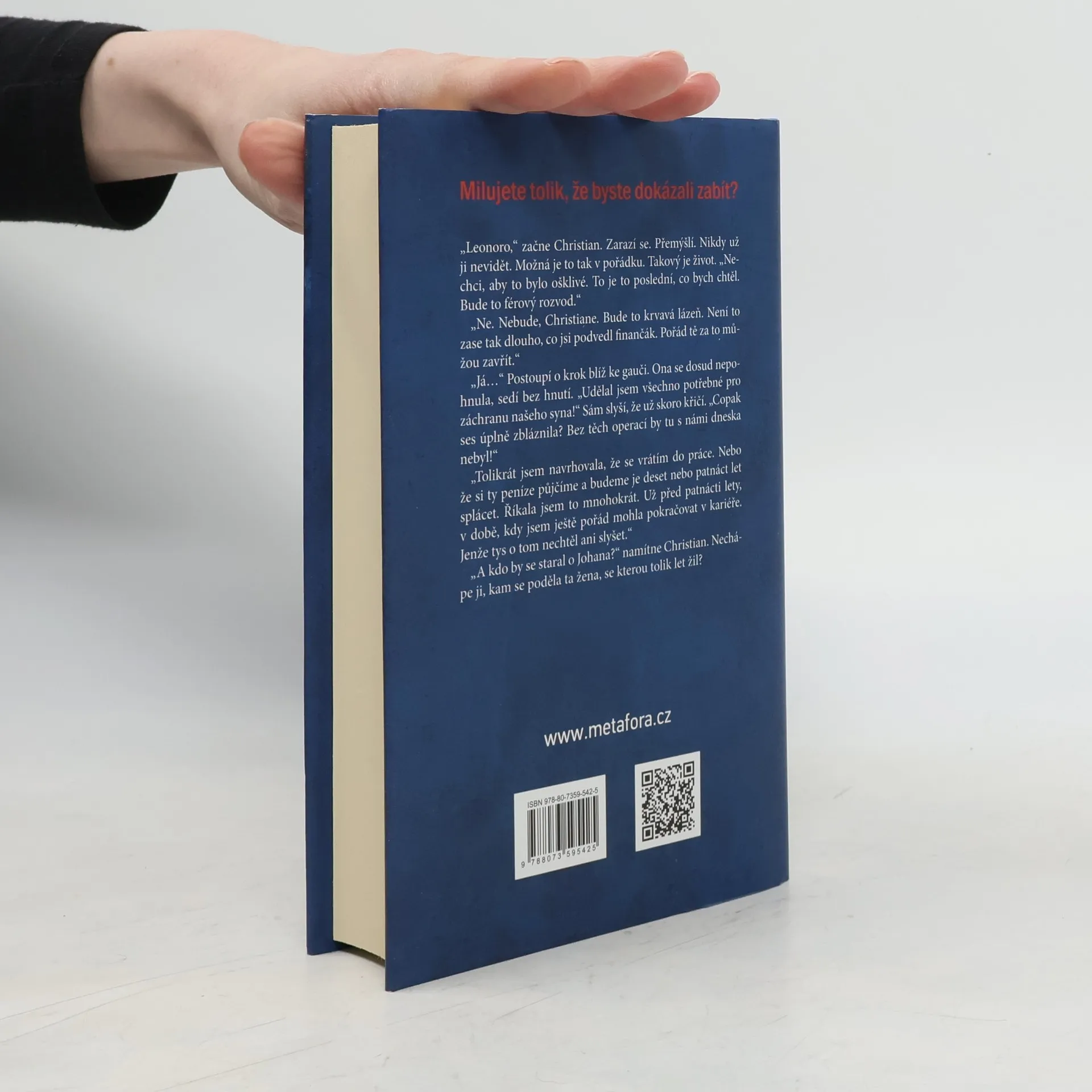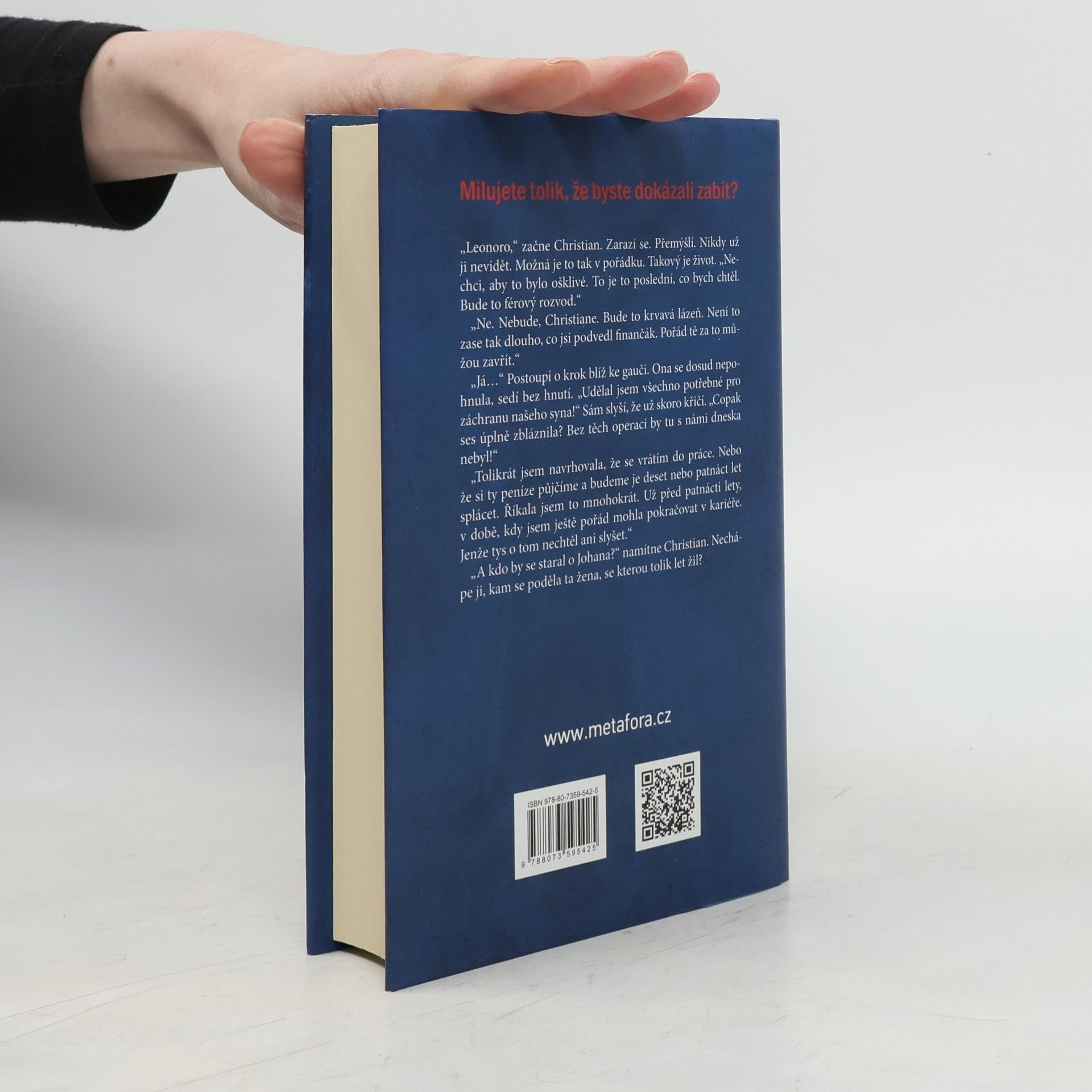 Dánský milostný thriller od autorského dua bestselleru Ztracená, píšící pod pseudonymem Anna Ekberg. Napínavý thriller o úkladné, dokonale naplánované vraždě. Dramatický příběh o majetnictví ve vztahu, o vášni, sexu a tajemstvích druhých. Pravdivá sonda do manželství, kde je i přes vnější dojem vše nakřivo. Christian a Leonora. Manželé kolem padesátky, přes dvacet let spolu. Měli by být šťastní. Mají všechno: peníze, krásný dům i společenské postavení. Zákeřná nemoc jejich osmnáctiletého syna, která je stála spoustu sil, je konečně na ústupu a před nimi se otevírá světlá budoucnost. Nebo snad ne? Jednou v noci Christian dostává SMS, a když odmítne Leonoře zprávu ukázat, vzbudí v ní podezření. Na Christianově pracovním večírku se její podezření potvrdí. Leonora přistihne manžela při sexu s kolegyní, mladou architektkou Zenií. Později Christiana konfrontuje, ten vše zapírá, je však rozhodnutý ji opustit. Leonora se s tím nechce smířit, vydírá Christiana kvůli finančnímu podvodu. Christian s ní musí zůstat. V bezvýchodné situaci se Christian rozhodne, že se jí musí zbavit. Počká si na Leonoru ve firemní dodávce na silnici v lese, kam Leonora chodí běhat, a srazí ji. Vrátí se domů, nalije si drink a vtom se objeví Leonora. Co to vlastně udělal?