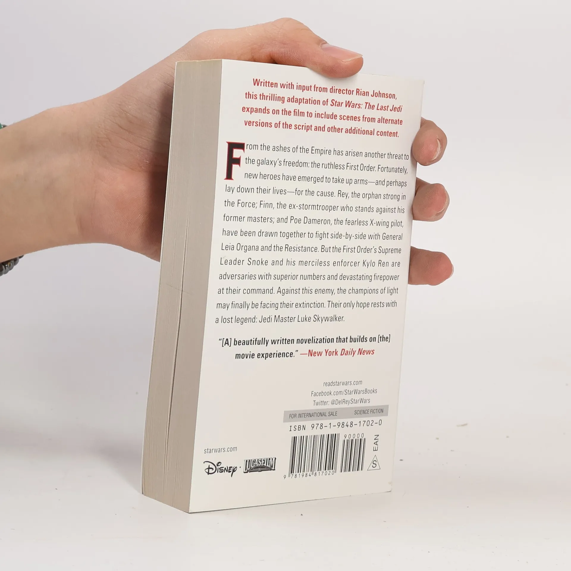 Written with input from director Rian Johnson, this official adaptation of Star Wars: The Last Jedi expands on the film to include scenes from alternate versions of the script and other additional content. From the ashes of the Empire has arisen another threat to the galaxy's freedom: the ruthless First Order. Fortunately, new heroes have emerged to take up arms--and perhaps lay down their lives--for the cause. Rey, the orphan strong in the Force; Finn, the ex-stormtrooper who stands against his former masters; and Poe Dameron, the fearless X-wing pilot, have been drawn together to fight side-by-side with General Leia Organa and the Resistance. But the First Order's Supreme Leader Snoke and his merciless enforcer Kylo Ren are adversaries with superior numbers and devastating firepower at their command. Against this enemy, the champions of light may finally be facing their extinction. Their only hope rests with a lost legend: Jedi Master Luke Skywalker.