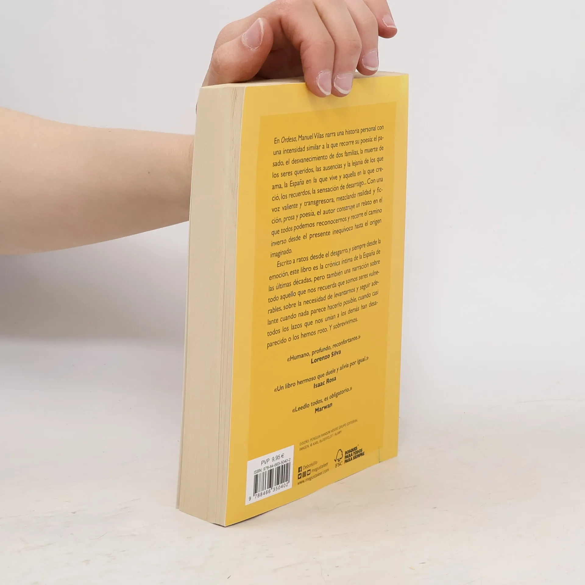 4e couv : "En "Ordesa", Manuel Vilas narra una historia personal con una intensidad similar a la que recorre su poesía: el pasado, el desvanecimiento de dos familias, la muerte de los seres queridos, las ausencias y la lejanía de los que ama, la España en la que vive y aquella en la que creció, los recuerdos, la sensación de desarraigo... Con una voz valiente y transgresora, mezclando realidad y ficción, prosa y poesía, el autor construye un relato en el que todos podemos reconocernos y recorre en él el camino inverso desde el presente inequívoco hasta el origen imaginado. Escrito a ratos desde el desgarro, y siempre desde la emoción, este libro es la crónica íntima de la España de las últimas décadas, pero también una narración sobre todo aquello que nos recuerda que somos seres vulnerables, sobre la necesidad de levantarnos y seguir adelante cuando nada parece hacerlo posible, cuando casi todos los lazos que nos unían a los demás han desaparecido o los hemos roto. Y sobrevivimos."