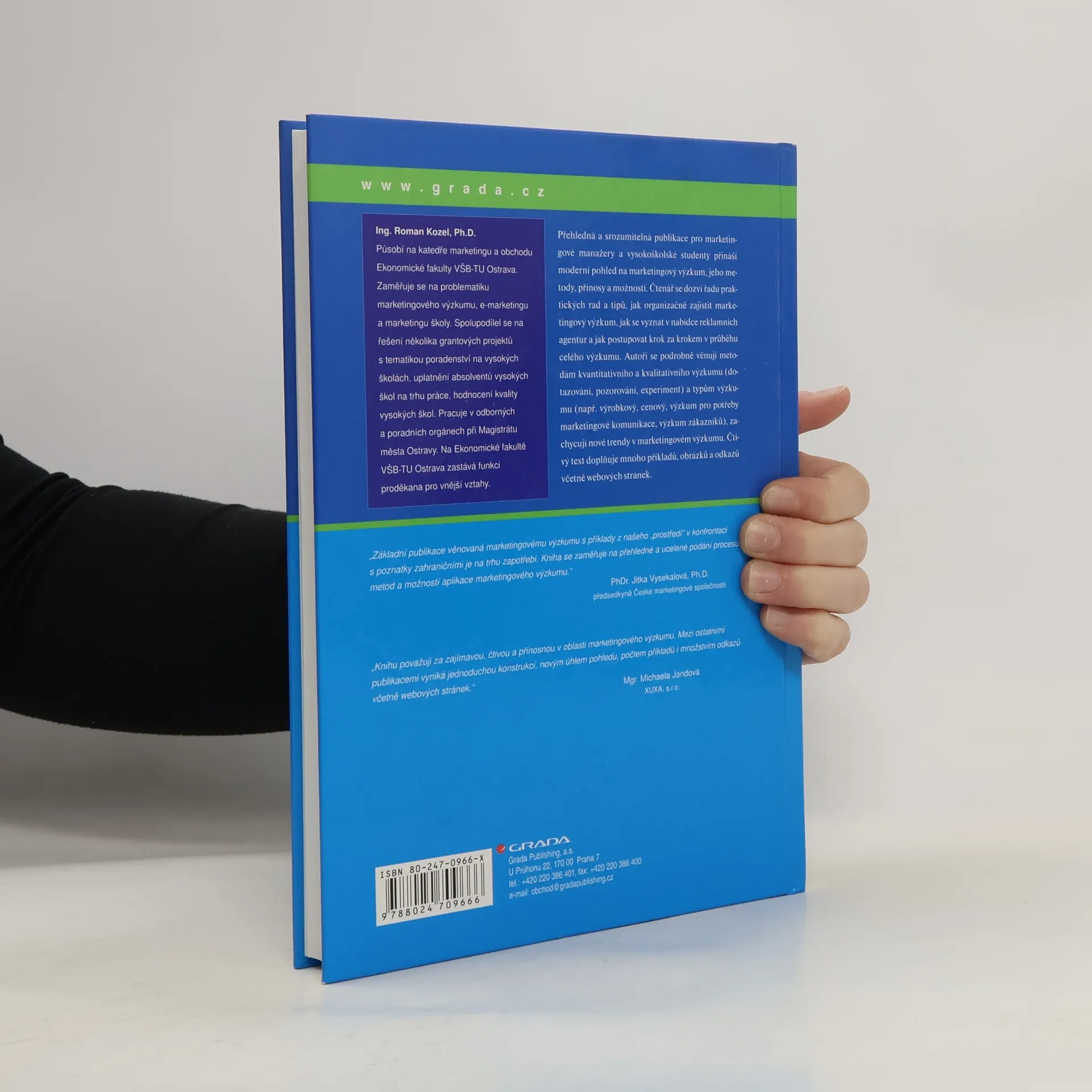 Přehledná a srozumitelná publikace pro marketingové manažery a vysokoškolské studenty přináší moderní pohled na marketingový výzkum, jeho metody, přínosy a možnosti. Čtenář se dozví řadu praktických rad a tipů, jak organizačně zajistit marketingový výzkum, jak se vyznat v nabídce reklamních agentur a jak postupovat krok za krokem v průběhu celého výzkumu. Autoři se podrobně věnují metodám kvantitativního a kvalitativního výzkumu (dotazování, pozorování, experiment) a typům výzkumu (např. výrobkový výzkum, cenový výzkumu, výzkum pro potřeby marketingové komunikace, výzkum zákazníků), zachycují nové trendy v marketingovém výzkumu. Čtivý text doplňuje mnoho příkladů, obrázků a odkazů včetně webových stránek.