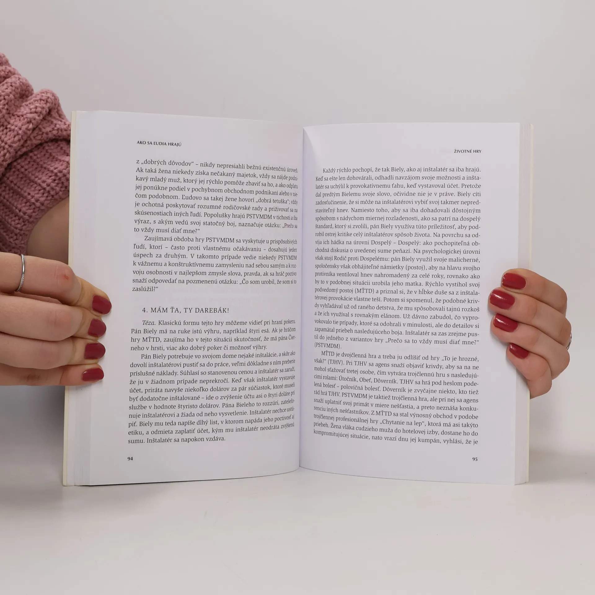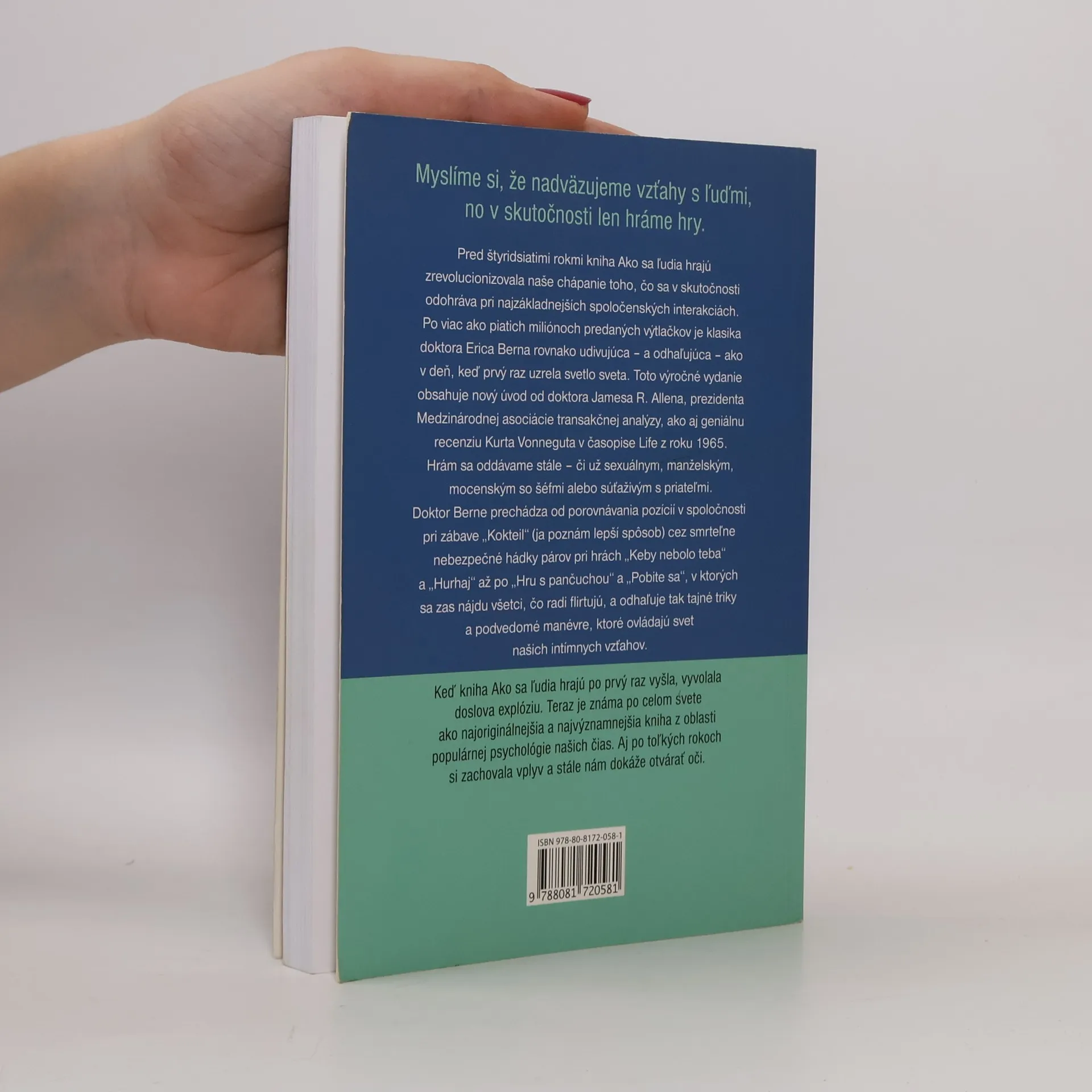 Myslíme si, že sa vzájomne spájame – ale v skutočnosti všetci hráme hry. Dr. Eric Berne vo svojej knihe odhaľuje, čo sa naozaj deje počas našich najzákladnejších sociálnych interakcií. Hráme hry neustále – sexuálne hry, manželské hry, mocenské hry s našimi nadriadenými a súťažné hry s priateľmi. Podrobne popisuje súťaže o status, ako sú „Martini“ (poznám lepší spôsob), až po smrteľné boje párov ako „Keby nebolo teba“ a „Pohroma“, či obľúbené flirtovacie hry ako „Hra s pančuchami“ a „Nech sa bijú on a ty“. Dr. Berne odhaľuje tajné triky a nevedomé manévre, ktoré ovládajú naše intímne životy. Kniha je považovaná za najoriginálnejšiu a najvplyvnejšiu populárnu psychológiu našej doby. Je rovnako silná a osvetľujúca ako kedykoľvek predtým.