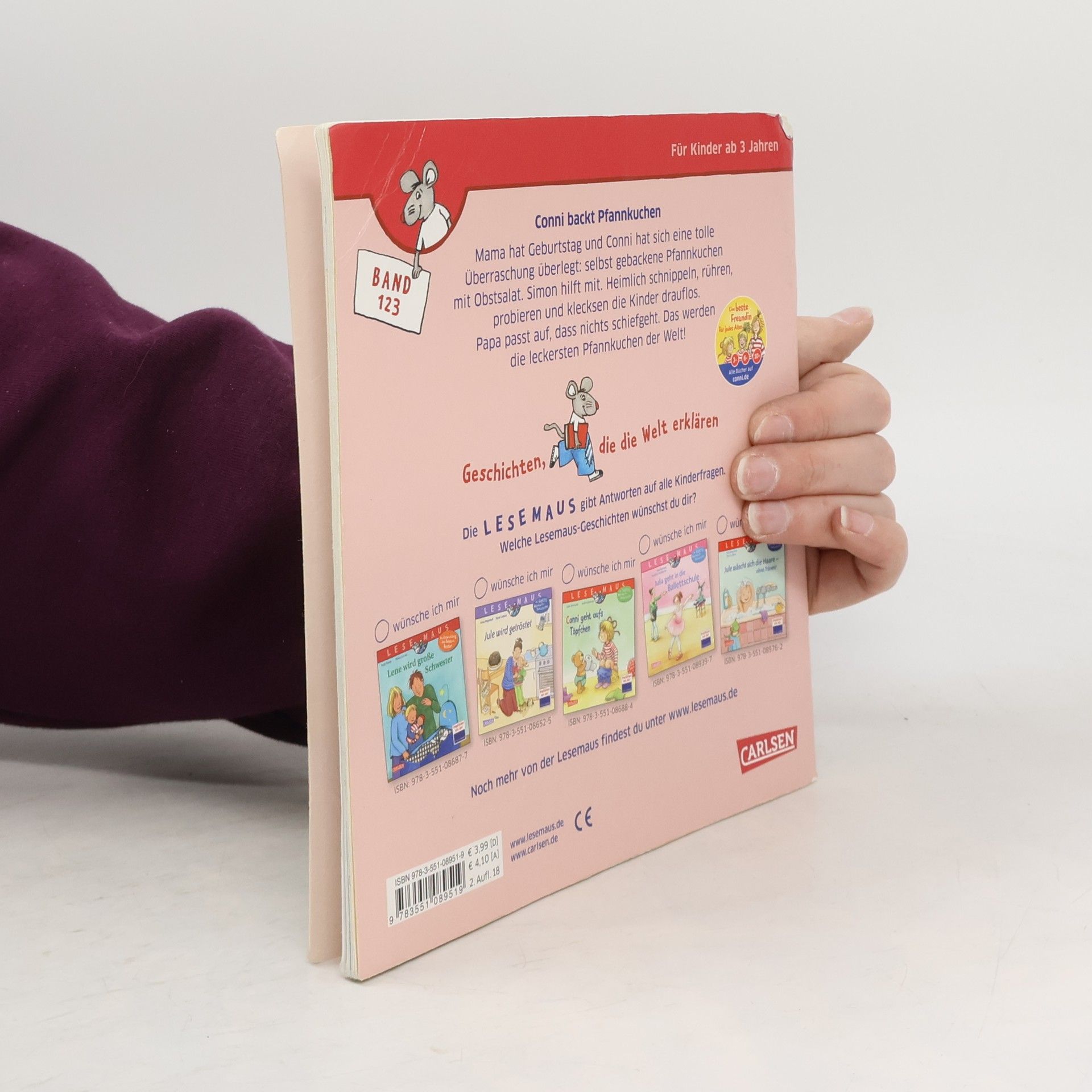 Mama hat Geburtstag und Conni hat sich eine tolle Überraschung überlegt: selbst gebackene Pfannkuchen mit Obstsalat. Simon hilft mit. Heimlich schnippeln, rühren, probieren und klecksen die Kinder was das Zeug hält. Papa passt auf, dass nichts schiefgeht. Als Mama nach Hause kommt, ist die Freude groß! Wer kann so leckeren Pfannkuchen schon widerstehen? Gemeinsam wird gegessen, gelacht und schließlich gekuschelt - bis alle satt und glücklich zu Bett gehen. Mit Connis kinderleichtem Rezept gelingen die leckeren Pfannkuchen garantiert auch anderen kleinen Feinschmeckern. LESEMAUS – Geschichten, die die Welt erklären! Die Bilderbücher für Kinder ab 3 Jahren sind ideal zum gemeinsamen Anschauen und Vorlesen. Verständliche Texte und hochwertige Illustrationen vermitteln erstes Sachwissen zu wichtigen Themen aus dem Kinderalltag. Empfohlen von der Stiftung Lesen.