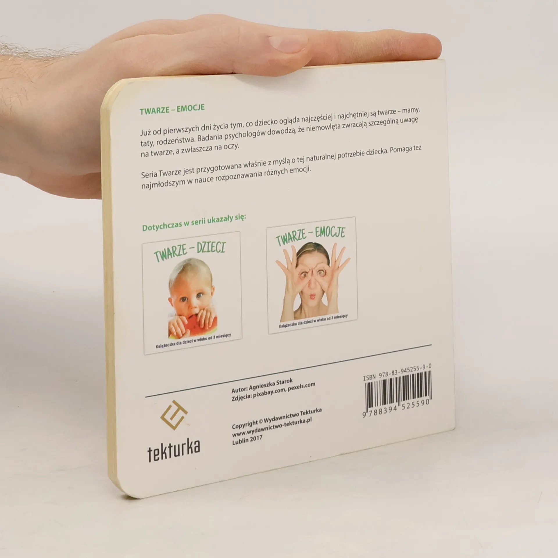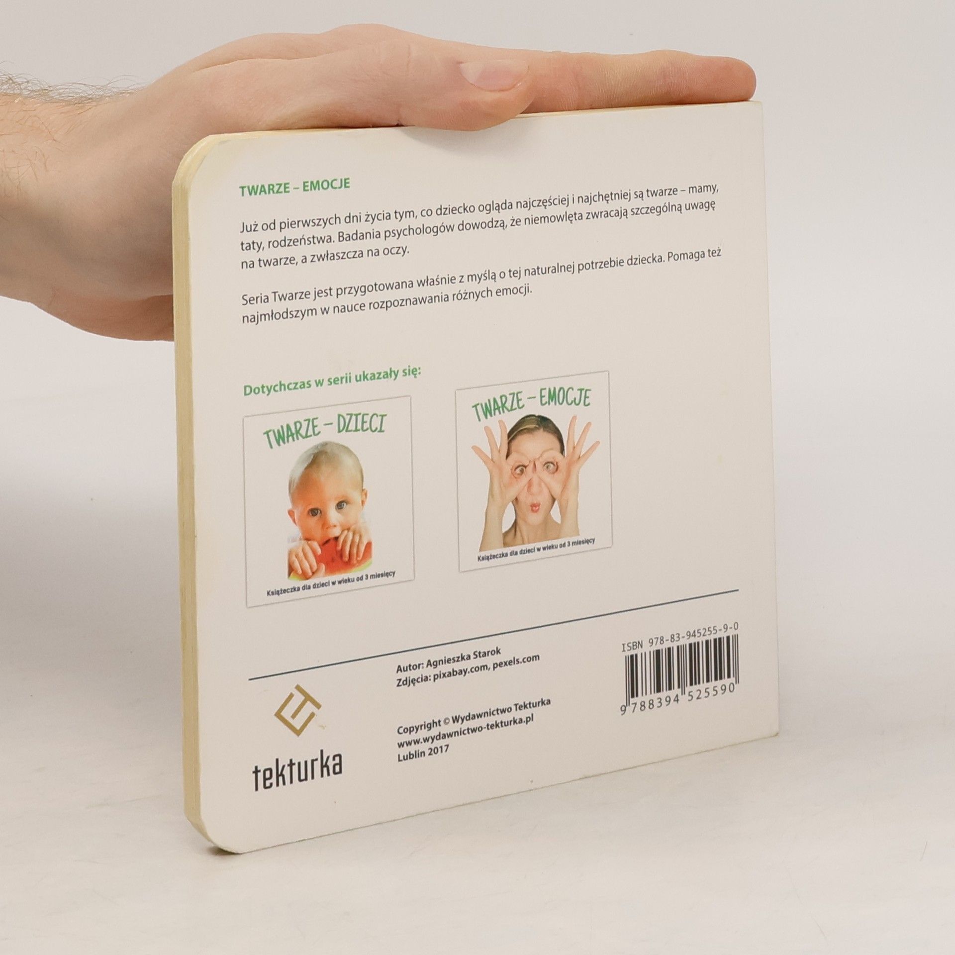 Książeczka zgodna z metodą M. Montessori, zawierająca zdjęcia ludzi wyrażających r�żne emocje.. Nowość na polskim rynku.Już od pierwszych dni życia tym, co dziecko ogląda najczęściej i najchętniej są twarze ? mamy, taty, rodzeństwa. Badania psycholog�w dowodzą, że niemowlęta zwracają szczeg�lną uwagę na twarze, a zwłaszcza na oczy. Seria Twarze jest przygotowana właśnie z myślą o tej naturalnej potrzebie dziecka. Pomaga też najmłodszym w nauce rozpoznawania r�żnych emocji.�