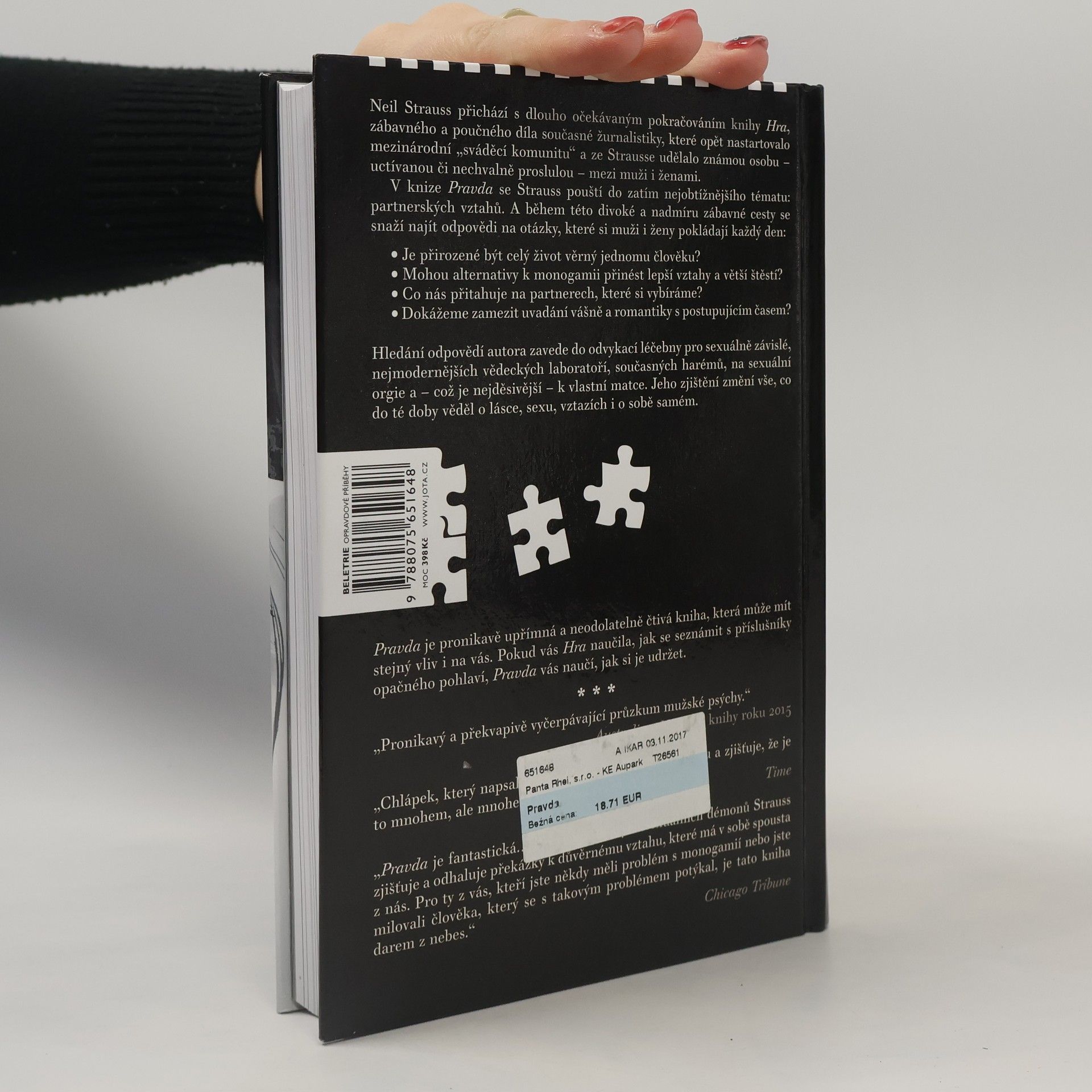V knize Pravda se Strauss pouští do zatím nejobtížnějšího tématu: partnerských vztahů. A během této divoké a nadmíru zábavné cesty se snaží najít odpovědi na otázky, které si muži i ženy pokládají každý den: Je přirozené být celý život věrný jednomu člověku? Mohou alternativy k monogamii přinést lepší vztahy a větší štěstí? Co nás přitahuje na partnerech, které si vybíráme? Dokážeme zamezit uvadání vášně a romantiky s postupujícím časem? Hledání odpovědí autora zavede do odvykací léčebny pro sexuálně závislé, nejmodernějších vědeckých laboratoří, současných harémů, na sexuální orgie a – což je nejděsivější – k vlastní matce. Jeho zjištění změní vše, co do té doby věděl o lásce, sexu, vztazích i o sobě samém. Pravda je pronikavě upřímná a neodolatelně čtivá kniha, která může mít stejný vliv i na vás. Pokud vás Hra naučila, jak se seznámit s příslušníky opačného pohlaví, Pravda vás naučí, jak si je udržet.