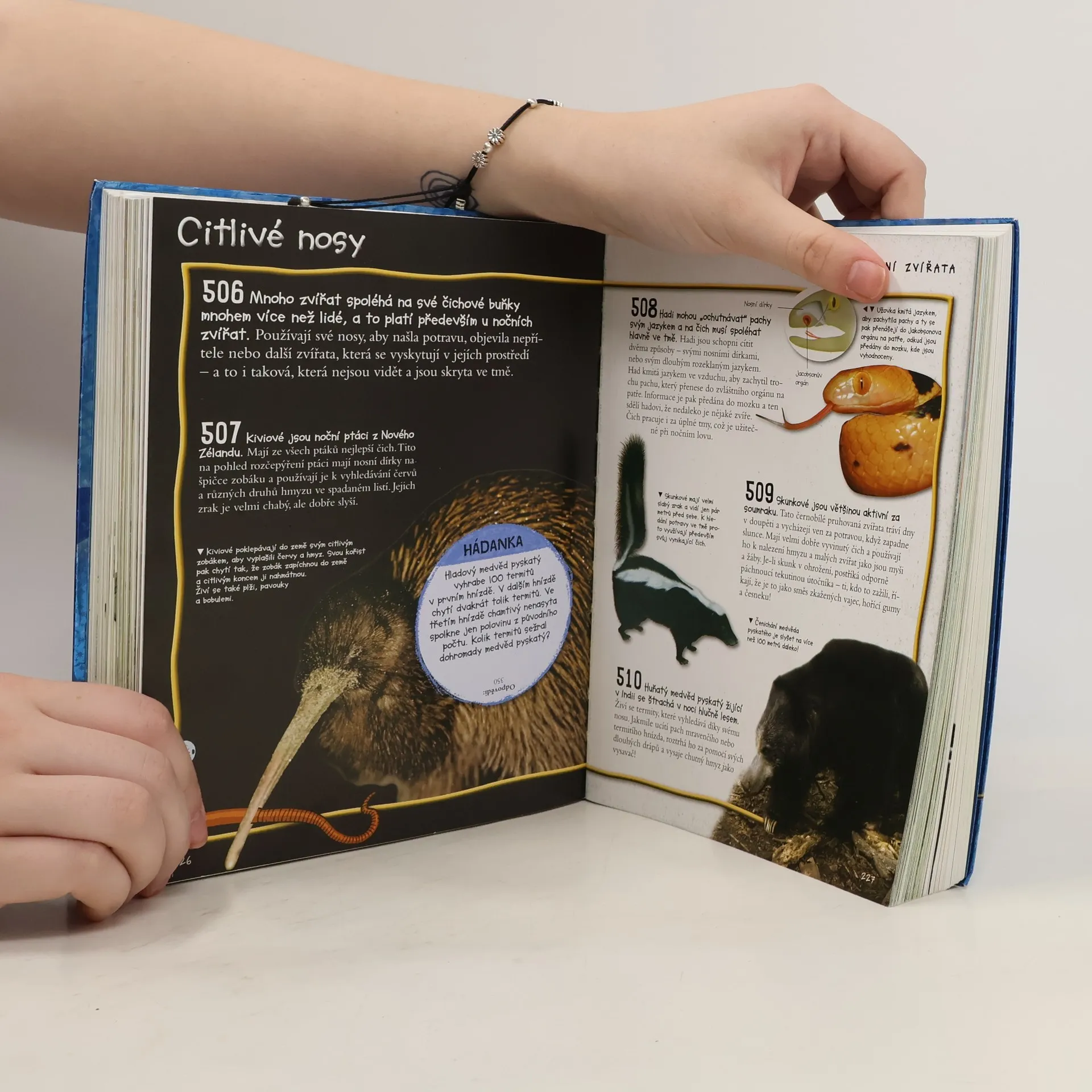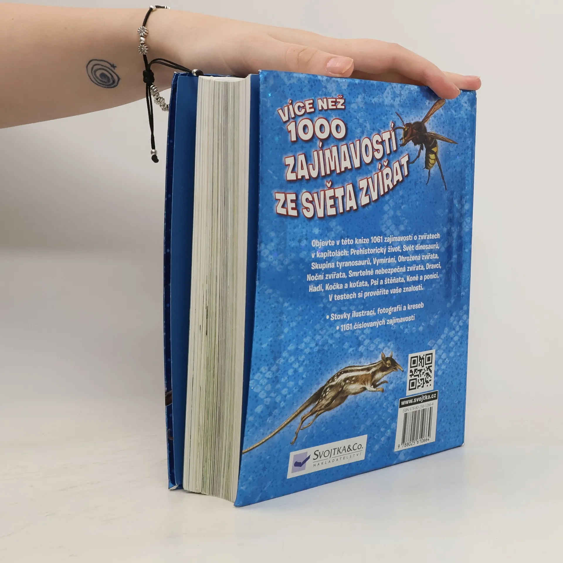 Objevte v této knize 1061 zajímavostí o zvířatech v kapitolách: Prehistorický život, Svět dinosaurů, Skupina tyranosaurů, Vymírání, Ohrožená zvířata, Noční zvířata, Smrtelně nebezpečná zvířata, Dravci, Hadi, Kočka a koťata, Psi a štěňata, Koně a poníci. V testech si prověříte vaše znalosti. • Stovky ilustrací, fotografií a kreseb • 1161 číslovaných zajímavostí
