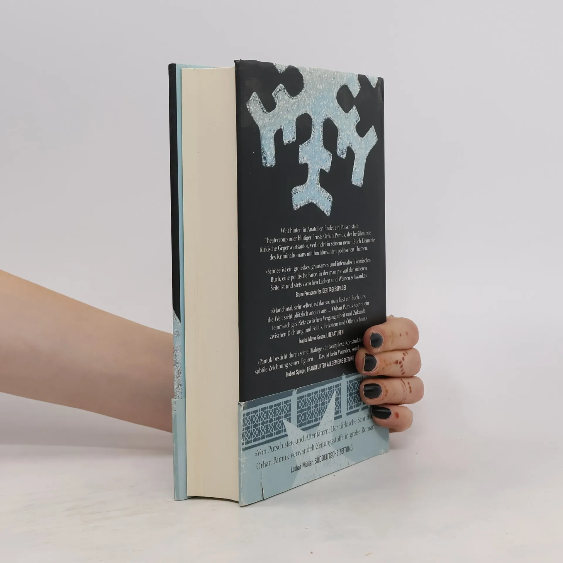 Ein Fremder kommt nach Kars, eine türkische Provinzstadt, um eine merkwürdige Serie von Selbstmorden zu untersuchen: Junge Mädchen haben sich umgebracht, weil man sie zwang, das Kopftuch abzulegen. Plötzlich kommt es zu einem Putsch, inszeniert von einem Schauspieler. Ein Theatercoup? Doch es fließt echtes Blut, es intervenieren echte Soldaten, keiner kann die Stadt verlassen, weil es unaufhörlich schneit ... Ein aktueller Roman, in dessen Zentrum die Frage nach der Identität der Türkei zwischen „Verwestlichung“ und Islamismus steht.