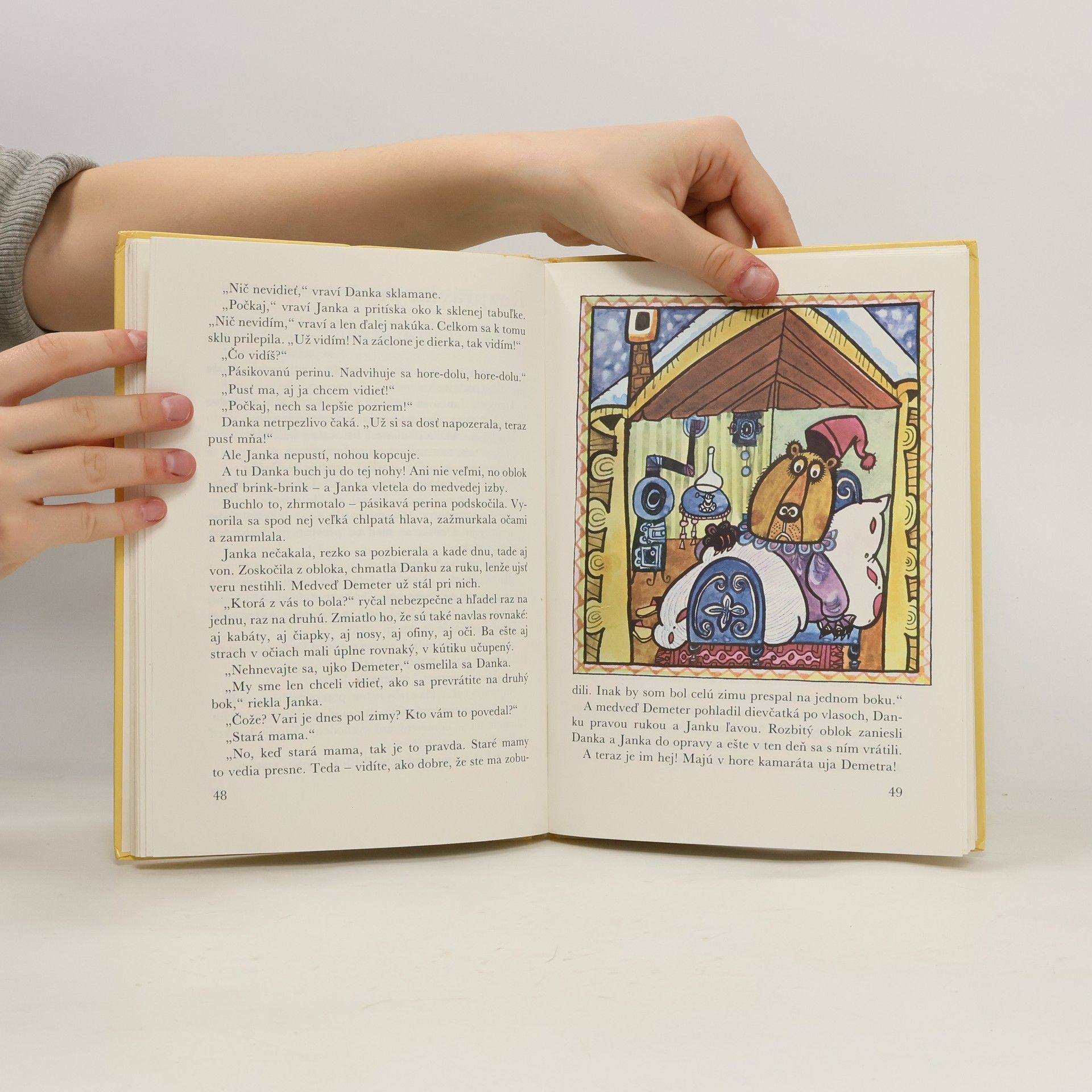 Danka a Janka Botkové, žiačky 1.B sú navlas rovnaké: oči celkom hnedé a veselé ako gaštanček, plavé vlasy , ostrihané na ofinu, nosy trošku vyhrnuté a veľmi všetečné. Mama ich rozozná vždy, otec niekedy a brat Miško málokedy. Sú celkom rovnaké, tak keď sa Janka pozrie do zrkadla, nie si je istá, či vidí seba alebo sestru Danku a keď sa Danka pozrie na Janku, nevie naisto, či to vidí sestru alebo seba v zrkadle. A rozprávky milujú rovnako vášnivo. Hocikedy sa vyberú do rozprávky. Chytia sa za ruky, spravia hop a sú v rozprávke. Spoznajú tak medveďa Demetera, Gevenduchu, Človiečika z budíka, sloní korienok, slimačí domček, zázračný klobúčik, všadebola a iné rozprávkovo-zázračné veci, ktoré sú vďaka ilustráciám Boženy Plocháňovej ešte čarovnejšie. Kniha se skládá ze dvou původně samostatných knih: Danka a Janka, Danka a Janka v rozprávke. 3. spoločné vydanie