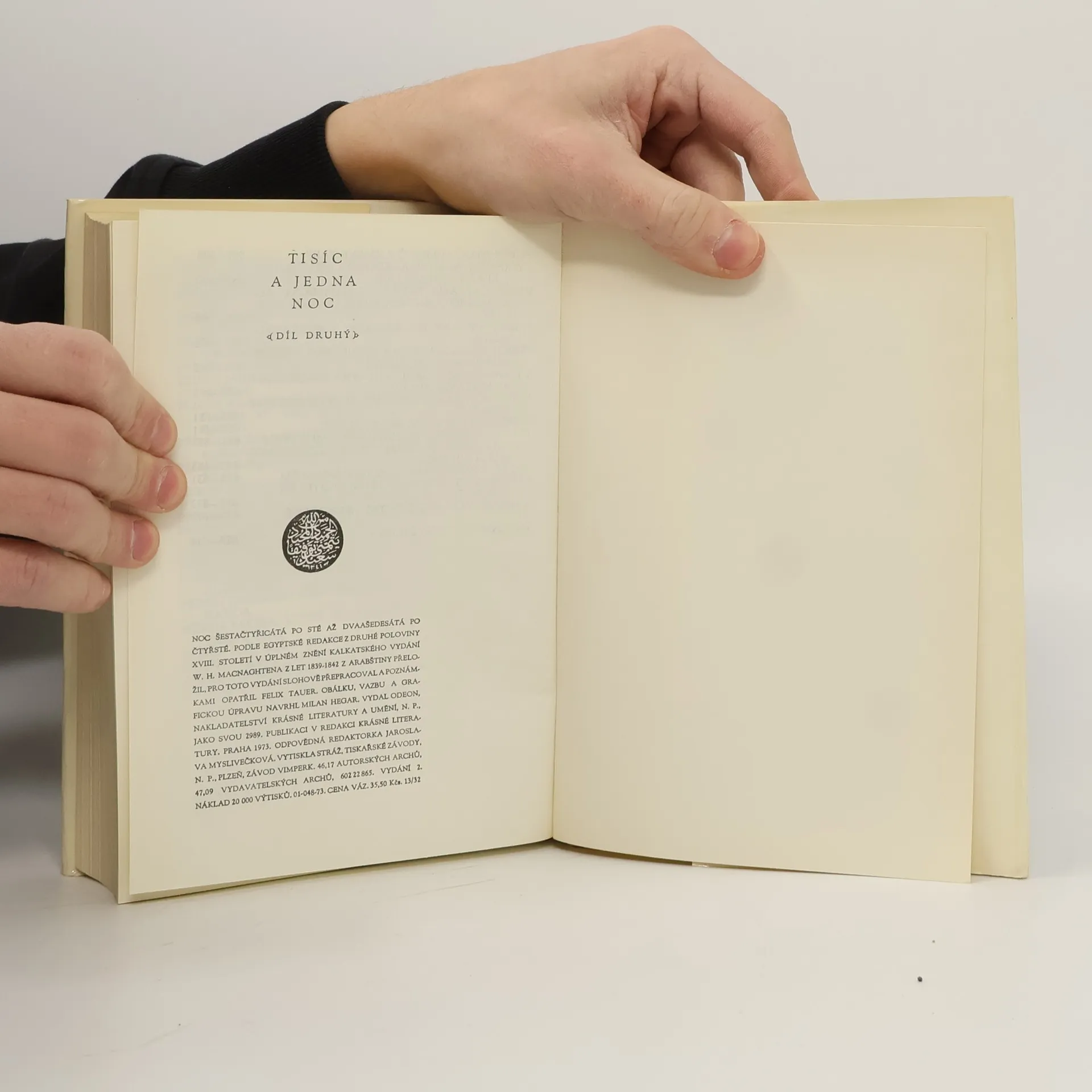 Druhá kniha z pěti. Příběhy, které vyprávěla Šahrazáda králi Šahzamánovi – druhý svazek obsahuje vyprávění noci 146 až 462 – podle egyptské redakce z druhé poloviny 18. století v úplném znění kalkatského vydání – vyprávění, která se stala nedílnou součástí světového literárního dědictví a současně i inspirací pro další díla.