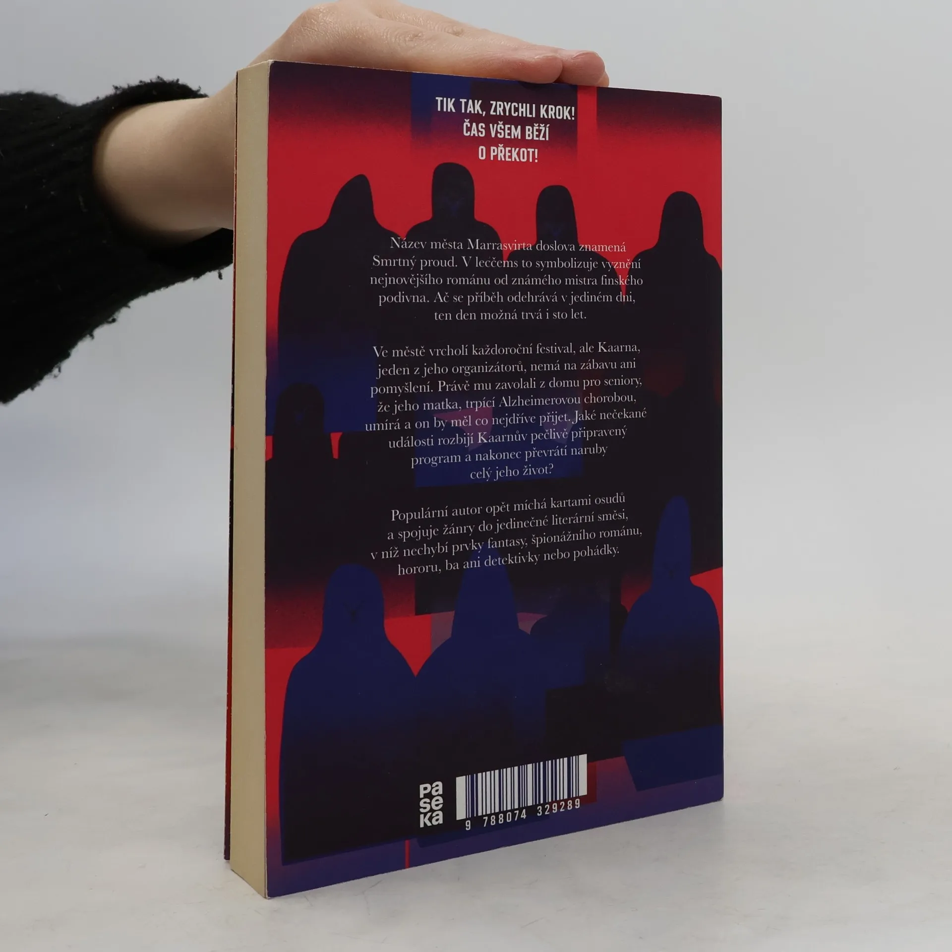 Název finského města Marrasvirta doslova znamená Smrtný proud, což v lecčems symbolizuje vyznění nejnovějšího románu od známého mistra finského podivna. Ač se příběh odehrává v jediném dni, ten den možná trvá i 100 let. Ve městě vrcholí každoroční festival, ale Kaarna, jeden z jeho organizátorů, nemá na zábavu ani pomyšlení. Právě mu zavolali z domu pro seniory, že jeho matka, trpící Alzheimerovou chorobou, umírá a on by měl co nejdříve přijet. Jaké nečekané události rozbijí Kaarnův pečlivě připravený program a nakonec převrátí naruby celý jeho život? Populární autor opět míchá kartami osudů a spojuje žánry do jedinečného finského podivna, v němž nechybí prvky fantasy, špionážního románu, hororu, ba ani detektivky nebo pohádky.