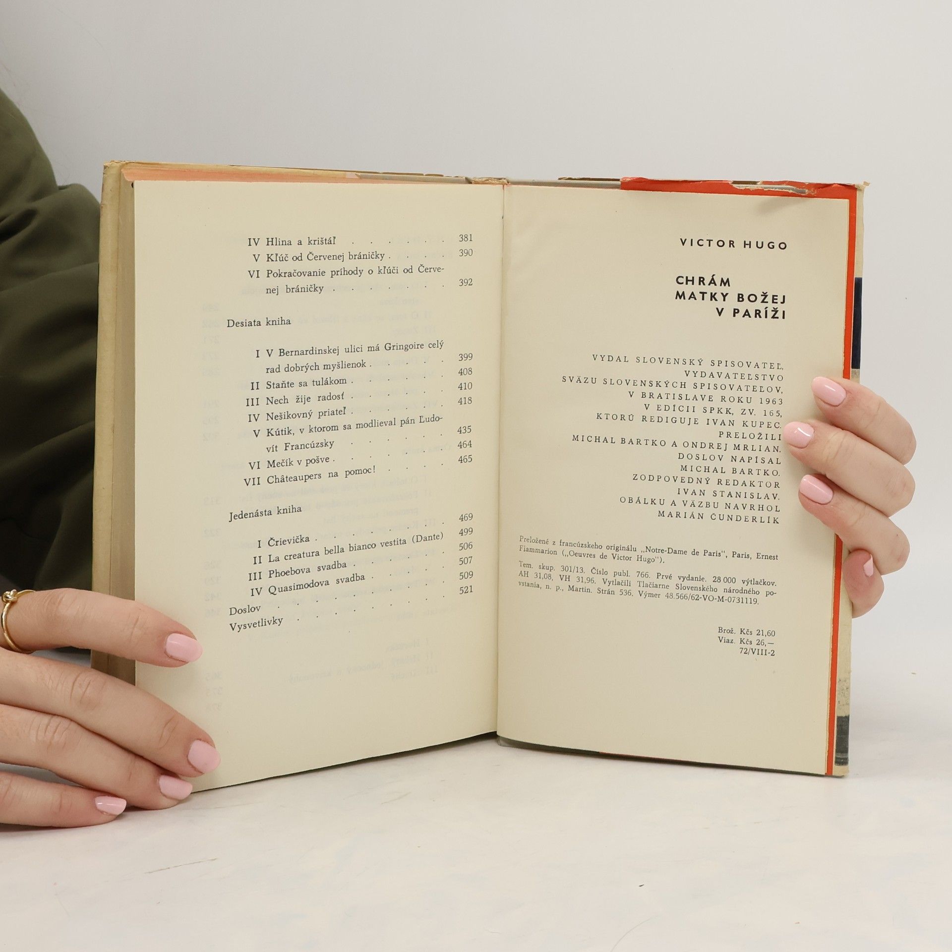 "Victor Hugo, jeden z najslávnejších predstaviteľov svetovej literatúry, sa do sŕdc miliónov čitateľov zapísal ako autor mnohých vynikajúcich prozaických, básnických i dramatických diel. Azda najznámejšie z nich je jeho historický román Chrám Matky Božej v Paríži (1831), ktorý po rokoch ponúkame slovenským čitateľom v novom vydaní. V monumentálnej románovej freske ožíva pred našimi očami nielen tragický príbeh znetvoreného zvonára Quasimoda a krásnej Cigánky Esmeraldy, ale aj sám Paríž pätnásteho storočia – stredoveké mesto so svojou magickou atmosférou, úzkymi uličkami a námestiami, nespočetnými vežami a kostolmi, medzi ktorými dominuje Chrám Matky Božej, nádherná majestátna katedrála, s ktorou sú nerozlučne späté osudy hlavných hrdinov. Ich príbeh dotvára množstvo epizód, kde sa vystrieda veľa postáv z najrozličnejších spoločenských vrstiev vrátane tých najvyšších. Do centra románu sa však postupne dostáva ľud – parížska chudoba, živelne sa búriaca proti cirkevnej tyranii a objavujúca svoje ušľachtilé jadro, lásku a ľudskosť uprostred stredovekej krutosti a tmy. Hugov nesmrteľný román nepochybne upúta i dnešného čitateľa svojou dramatickosťou, dejom plným neočakávaných zvratov a najrozmanitejších prekvapení." (Anotácia vydavateľstva) Siedme (hoci uvedené ako prvé - pravdepodobne prvé v danom vydavateľstve) slovenské vydanie v tomto preklade.... celý text