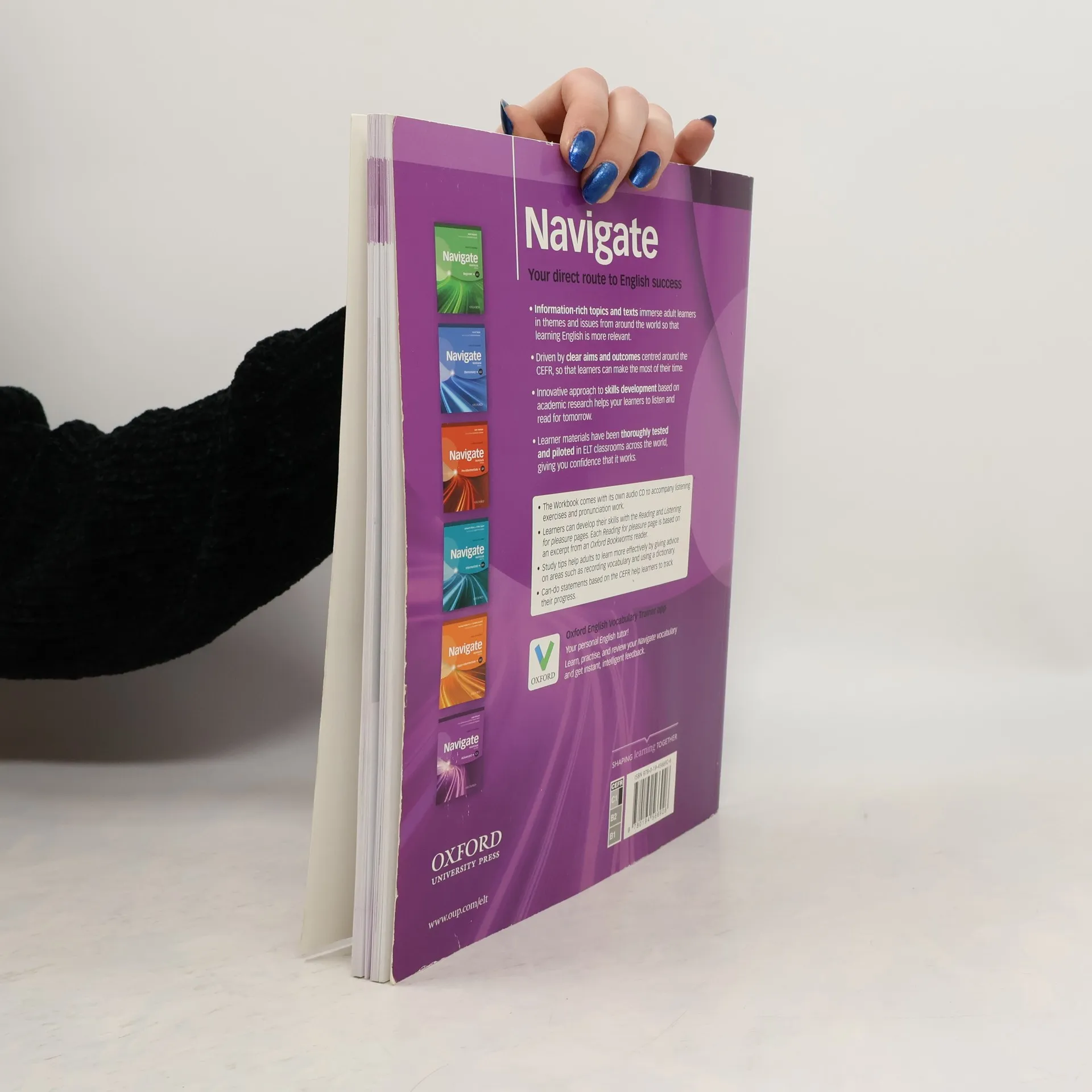 Navigate is a brand new, six-level General English course tailored exclusively to adults. The course takes an innovative approach to reading and listening based on academic research as to how adults best learn languages. It teaches reading and listening from the bottom up, giving learners the skills they need to understand the next text they will read and hear, not just the one they are reading or hearing now. The content has been extensively piloted and reviewed in ELT classrooms across the world, giving teachers the confidence that it really works. About the course: Innovative skills strand takes a bottom-up decoding approach to listening and reading. Equal weight given to grammar and vocabulary learning with clear on-the-page practice. Vocabulary based on the Oxford 3000 and levelled against the CEFR, giving learners the relevant language they need to communicate in the world today. Clear aims and outcomes linked to the CEFR throughout the course. Learners are immersed in themes and issues from around the world through content-rich, authentic texts that are really relevant to adult learners. Focus on vocabulary systems and vocabulary- building techniques. Real world video content provides integrated listening practice – video lesson in every unit plus vox pops throughout the course. Speaking practice throughout each lesson to help learners become more confident at using new language in the real world.