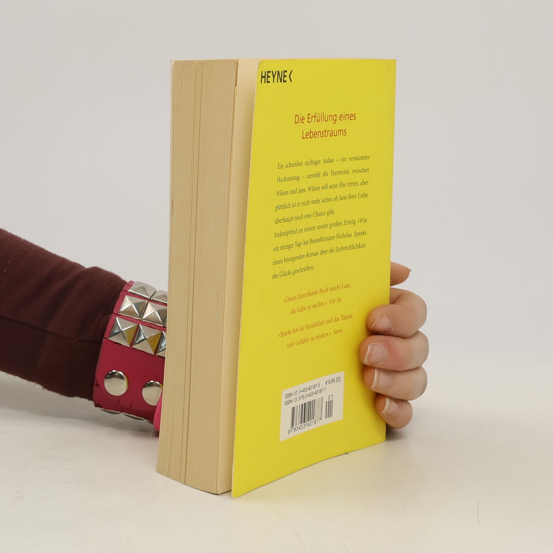 Ein scheinbar nichtiger Anlass - ein versäumter Hochzeitstag - zerreisst die Harmonie zwischen Wilson und Jane. Wilson will seine Ehe retten, aber plötzlich ist er nicht mehr sicher, ob Jane ihrer Liebe überhaupt noch eine Chance gibt. Anknüpfend an seinen ersten grossen Erfolg 'Wie ein einziger Tag' hat Bestsellerautor Nicholas Sparks einen bewegenden Roman über die Kraft der Liebe und die Zerbrechlichkeit des Glücks geschrieben. Nicholas Sparks, 1965 in Nebraska geboren, lebt zusammen mit seiner Frau und den gemeinsamen fünf Kindern in North Carolina. Mit seinen Romanen, die ausnahmslos die Bestsellerlisten eroberten und weltweit in 47 Ländern erscheinen, gilt Sparks als einer der meistgelesenen Autoren der Welt. Mehrere seiner Bestseller wurden erfolgreich verfilmt. Alle seine Bücher sind bei Heyne erschienen, zuletzt 'Kein Ort ohne dich'