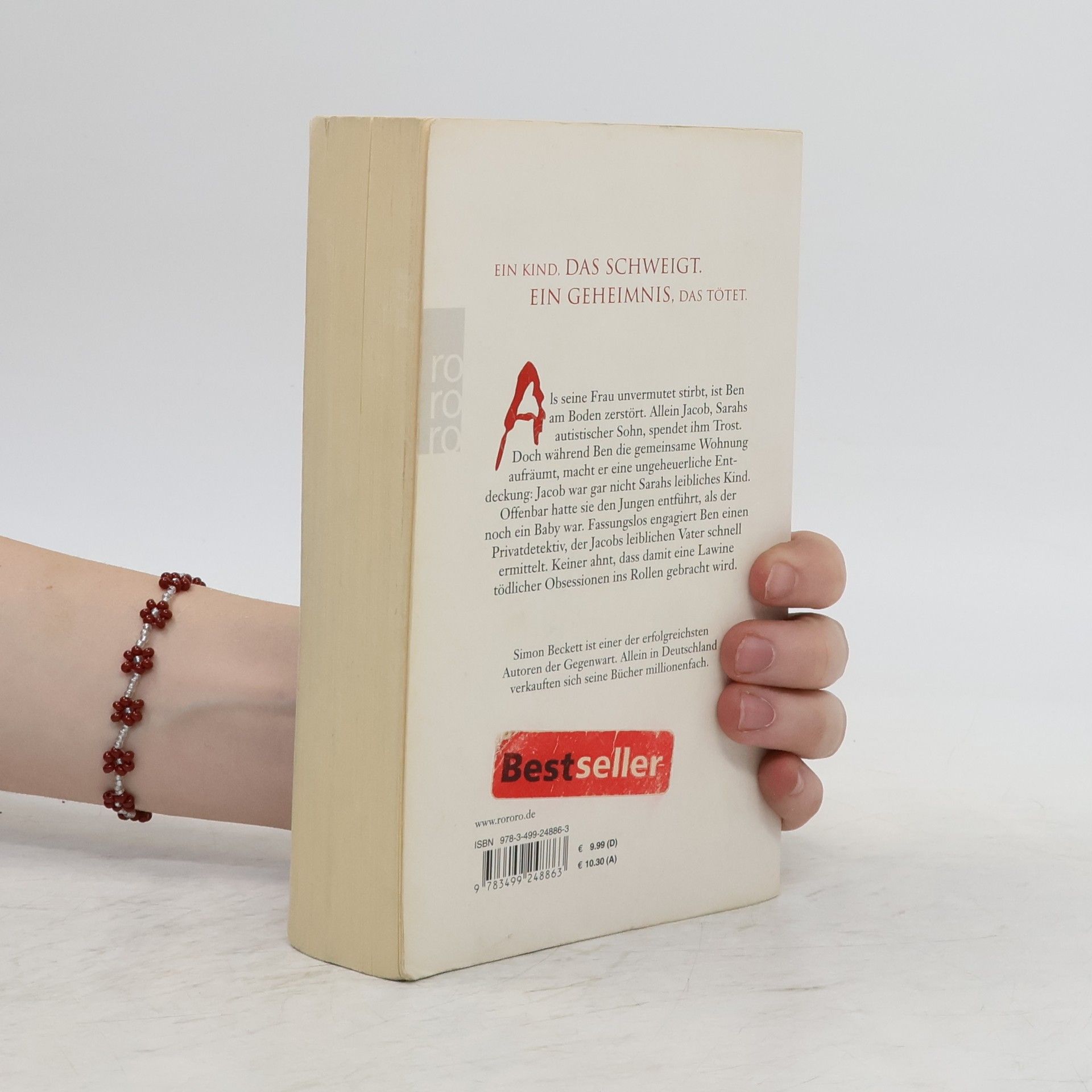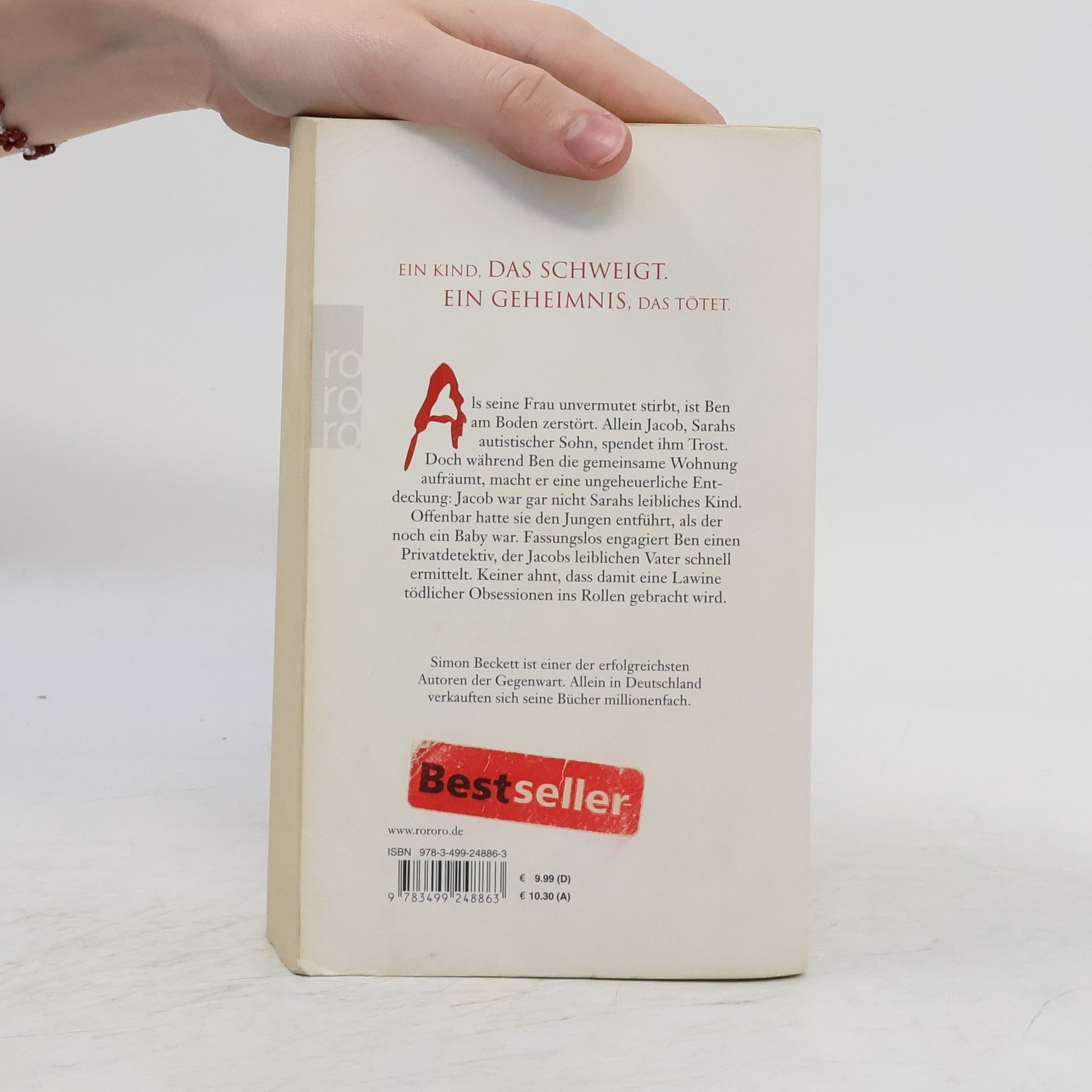 Ein Kind, das schweigt. Ein Geheimnis, das tötet.Als seine Frau unvermutet stirbt, ist Ben am Boden zerstört. Allein Jacob, Sarahs autistischer Sohn, spendet ihm Trost. Doch während Ben die gemeinsame Wohnung aufräumt, macht er eine ungeheuerliche Entdeckung: Jacob war gar nicht Sarahs leibliches Kind. Offenbar hatte sie den Jungen entführt, als der noch ein Baby war. Fassungslos engagiert Ben einen Privatdetektiv, der Jacobs leiblichen Vater schnell ermittelt. Keiner ahnt, dass damit eine Lawine tödlicher Obsessionen ins Rollen gebracht wird. Simon Beckett ist einer der erfolgreichsten Autoren der Gegenwart. Allein in Deutschland verkauften sich seine Bücher millionenfach.