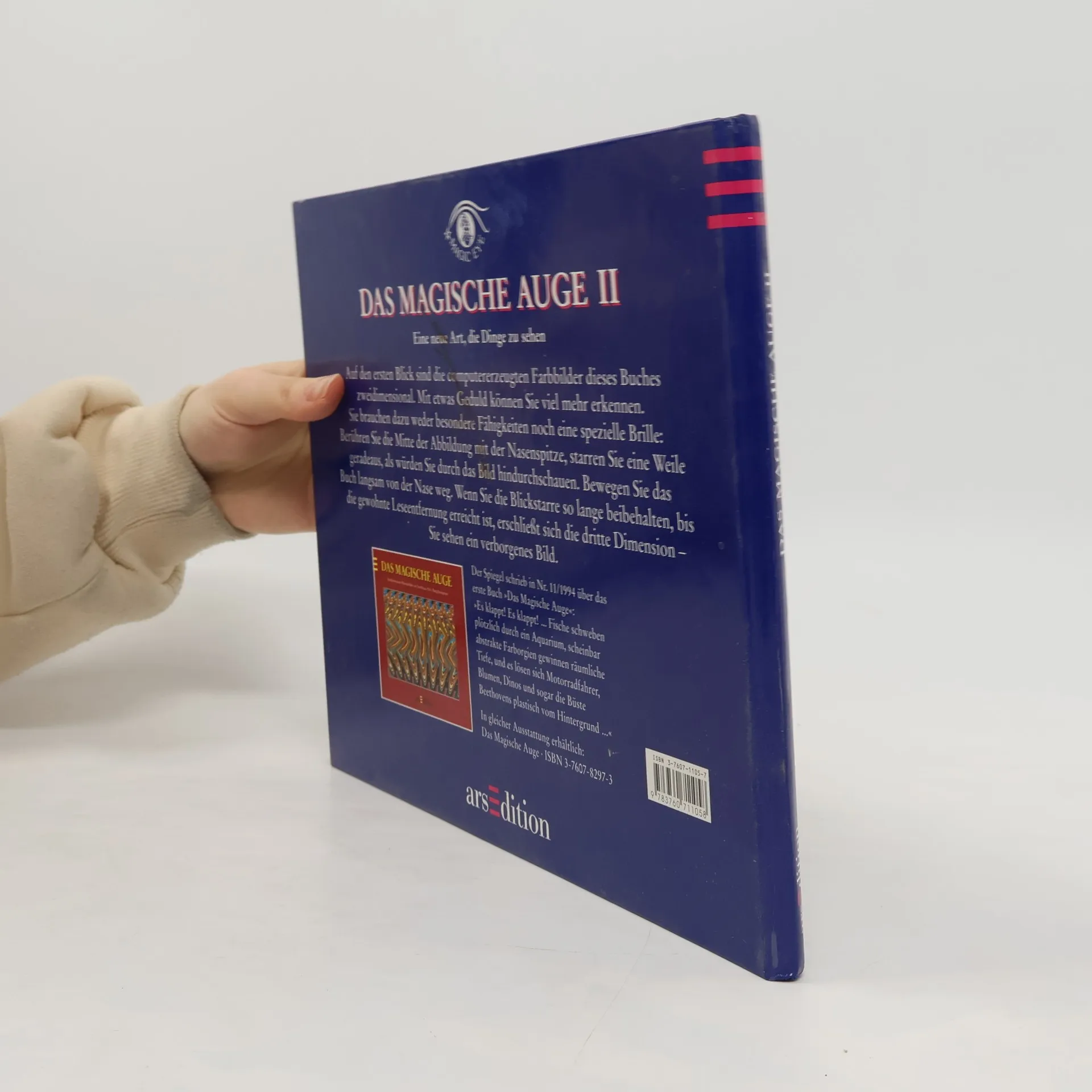 Bereits kurz nach Erscheinen ist auch dieser zweite Band mit dreidimensionalen Bildern ganz oben auf den Bestsellerlisten. Wie Rezensent Lobeck zu Band 1 schrieb (vgl. BA 8/94), liegt die Faszination dieser Bücher im "Aha-Erlebnis": wenn man ein Bild entsprechend der Anleitung betrachtet (es gibt 2 Möglichkeiten, die 1. Methode scheint bei den meisten Leuten zu funktionieren), weitet es sich irgendwann ins Räumliche, und man sieht ein neues, eben das "magische" Bild. Hilfestellung gibt die "Auflösung" auf den letzten Seiten. Wieder ein Schauvergnügen, das Bibliotheken Benutzern jeden Alters anbieten sollten. (1)