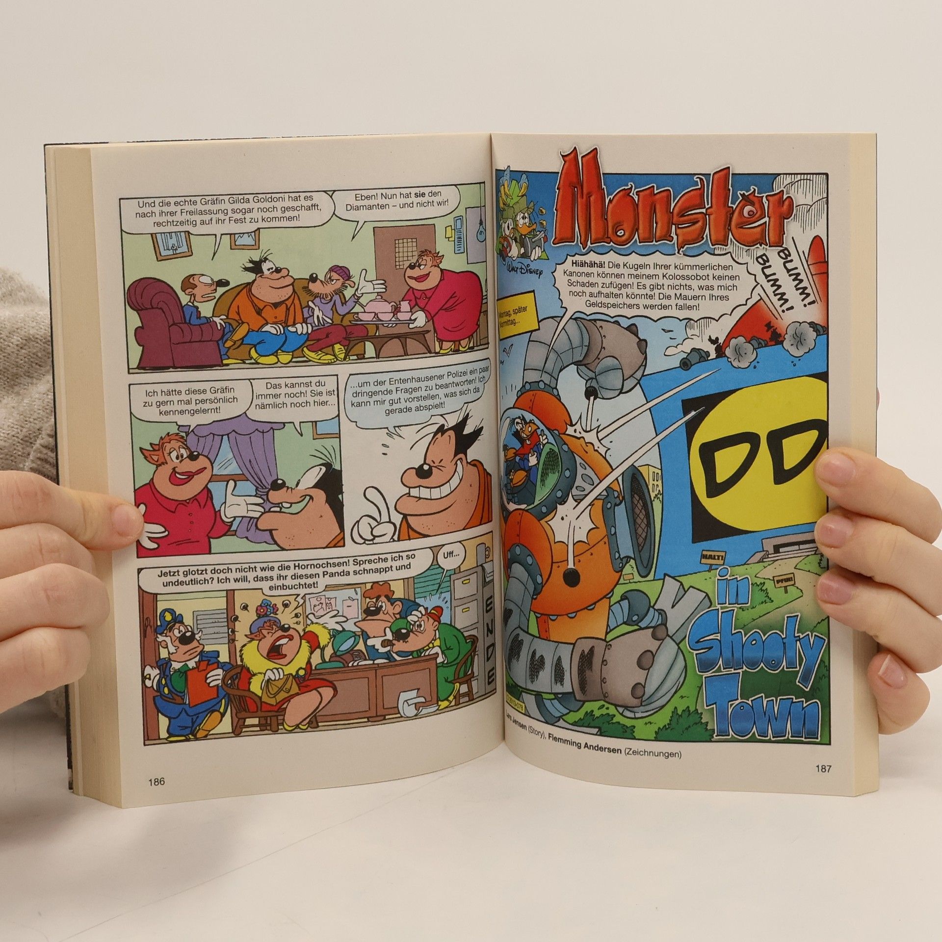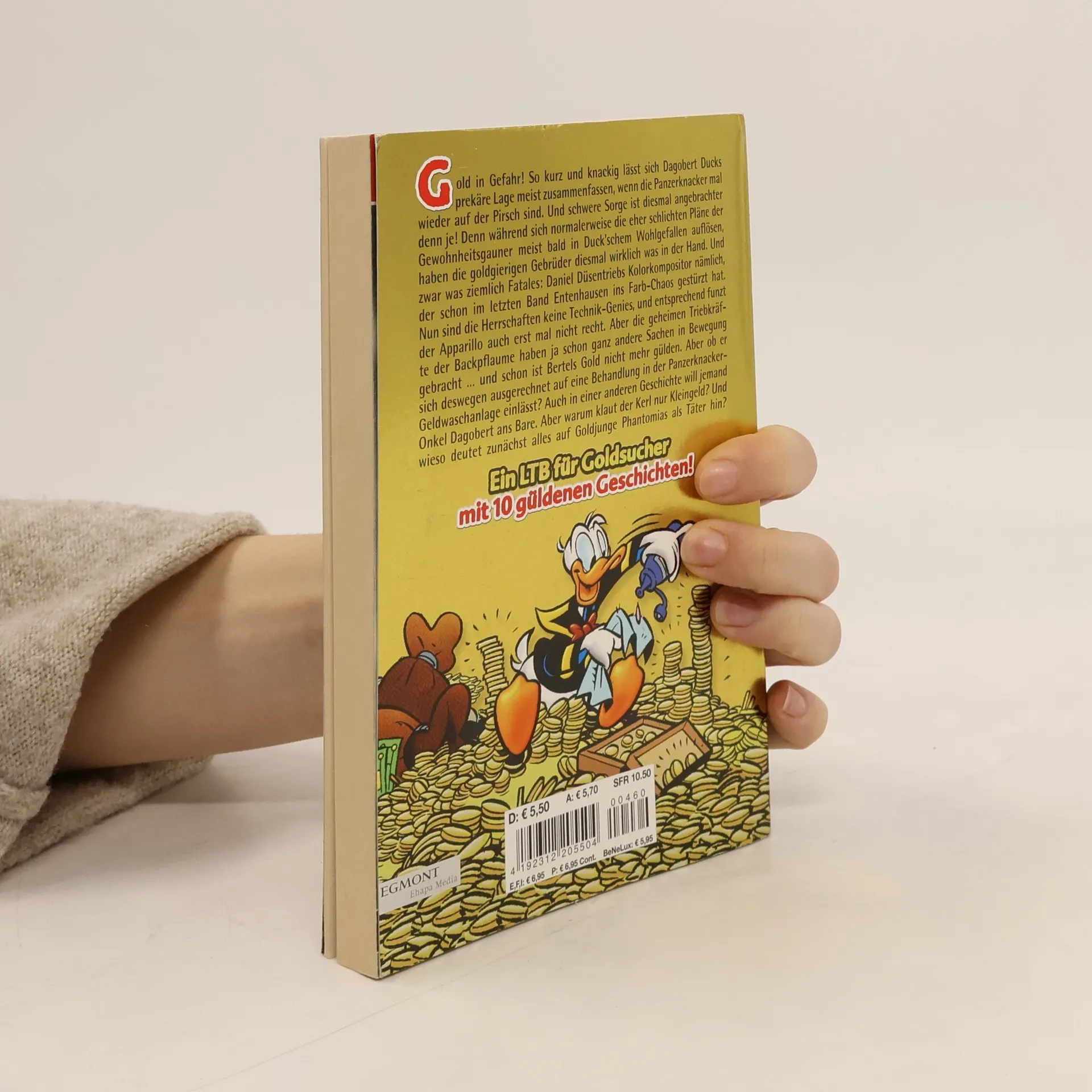 Gold in Gefahr! So kurz und knackig lässt sich Dagobert Ducks prekäre Lage meist zusammenfassen, wenn die Panzerknacker mal wieder auf der Pirsch sind. Und schwere Sorge ist diesmal angebrachter denn je! Denn während sich normalerweise die eher schlichten Pläne der Gewohnheitsgauner meist bald in Duck’schem Wohlgefallen auflösen,haben die goldgierigen Gebrüder diesmal wirklich was in der Hand. Und zwar was ziemlich Fatales: Daniel Düsentriebs Kolorkompositor nämlich, der schon im letzten Band Entenhausen ins Farb-Chaos gestürzt hat. Nun sind die Herrschaften keine Technik-Genies, und entsprechend funzt der Apparillo auch erst mal nicht recht. Aber die geheimen Triebkräfte der Backpflaume haben ja schon ganz andere Sachen in Bewegung gebracht … und schon ist Bertels Gold nicht mehr gülden. Aber ob er sich deswegen ausgerechnet auf eine Behandlung in der Panzerknacker-Geldwaschanlage einlässt? Auch in einer anderen Geschichte will jemandOnkel Dagobert ans Bare. Aber warum klaut der Kerl nur Kleingeld? Und wieso deutet zunächst alles auf Goldjunge Phantomias als Täter hin?