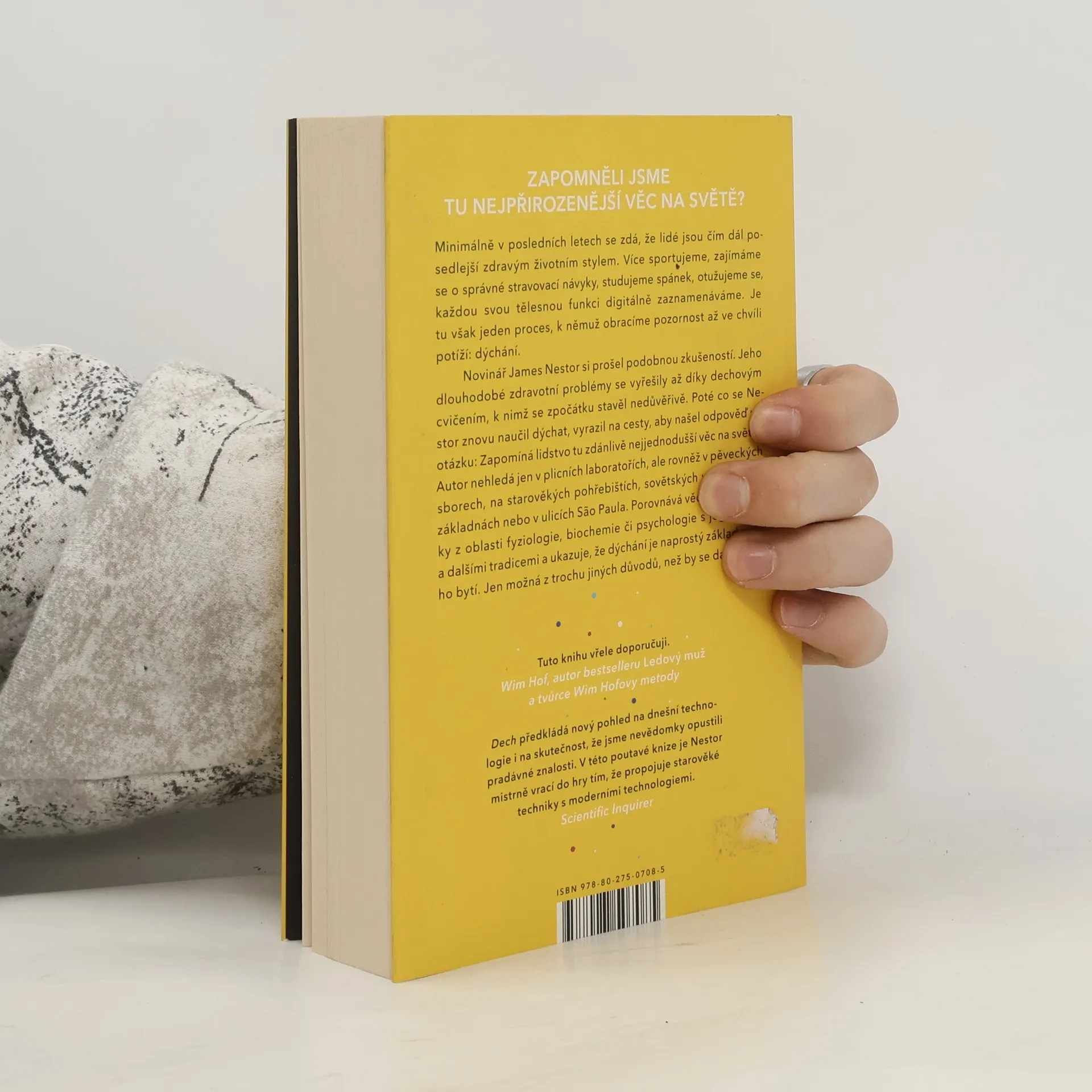 Nádech, výdech a znovu. Zapomněli jsme tu nejpřirozenější věc na světě? Minimálně v posledních letech se zdá, že lidé jsou čím dál posedlejší zdravým životním stylem. Více sportujeme, zajímáme se o správné stravovací návyky, studujeme spánek, otužujeme se, každou tělesnou funkci digitálně zaznamenáváme. Je tu však jeden proces, k němuž obracíme pozornost až ve chvíli potíží: dýchání. Novinář James Nestor si prošel podobnou zkušeností. Jeho dlouhodobé zdravotní problémy se vyřešily až díky dechovým cvičením, k nimž se zpočátku stavěl nedůvěřivě. Poté co se Nestor znovu naučil dýchat, vyrazil na cesty, aby našel odpověď na otázku: Zapomíná lidstvo tu zdánlivě nejjednodušší věc na světě? Autor nehledá jen v plicních laboratořích, ale rovněž u pěveckých sborů, na starověkých pohřebištích, sovětských výzkumných základnách nebo v ulicích Săo Paula. Porovnává vědecké poznatky z oblasti fyziologie, biochemie či psychologie s jogínskými a dalšími tradicemi a ukazuje, že dýchání je naprostý základ našeho bytí. Jen možná trochu jinak, než by se dalo čekat.