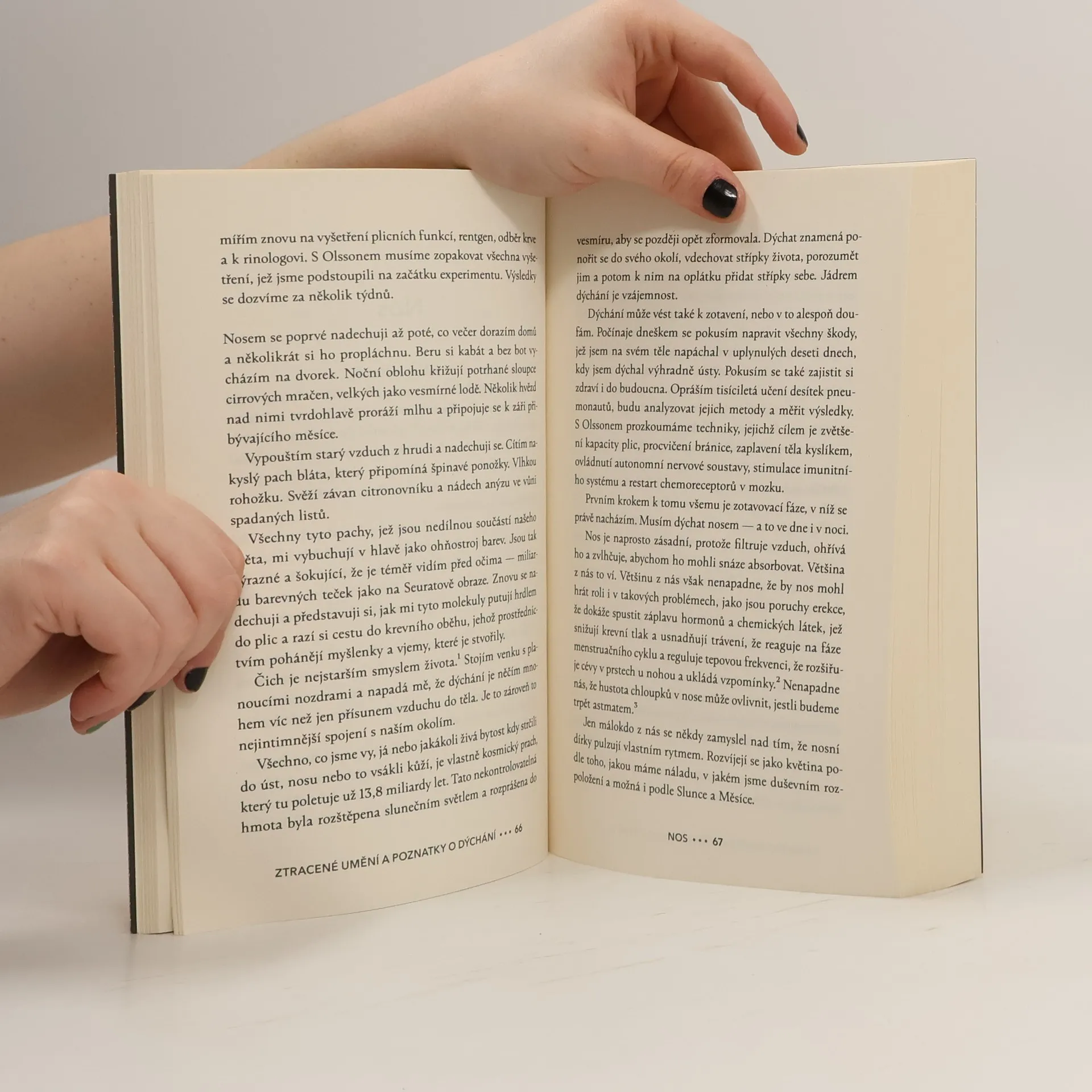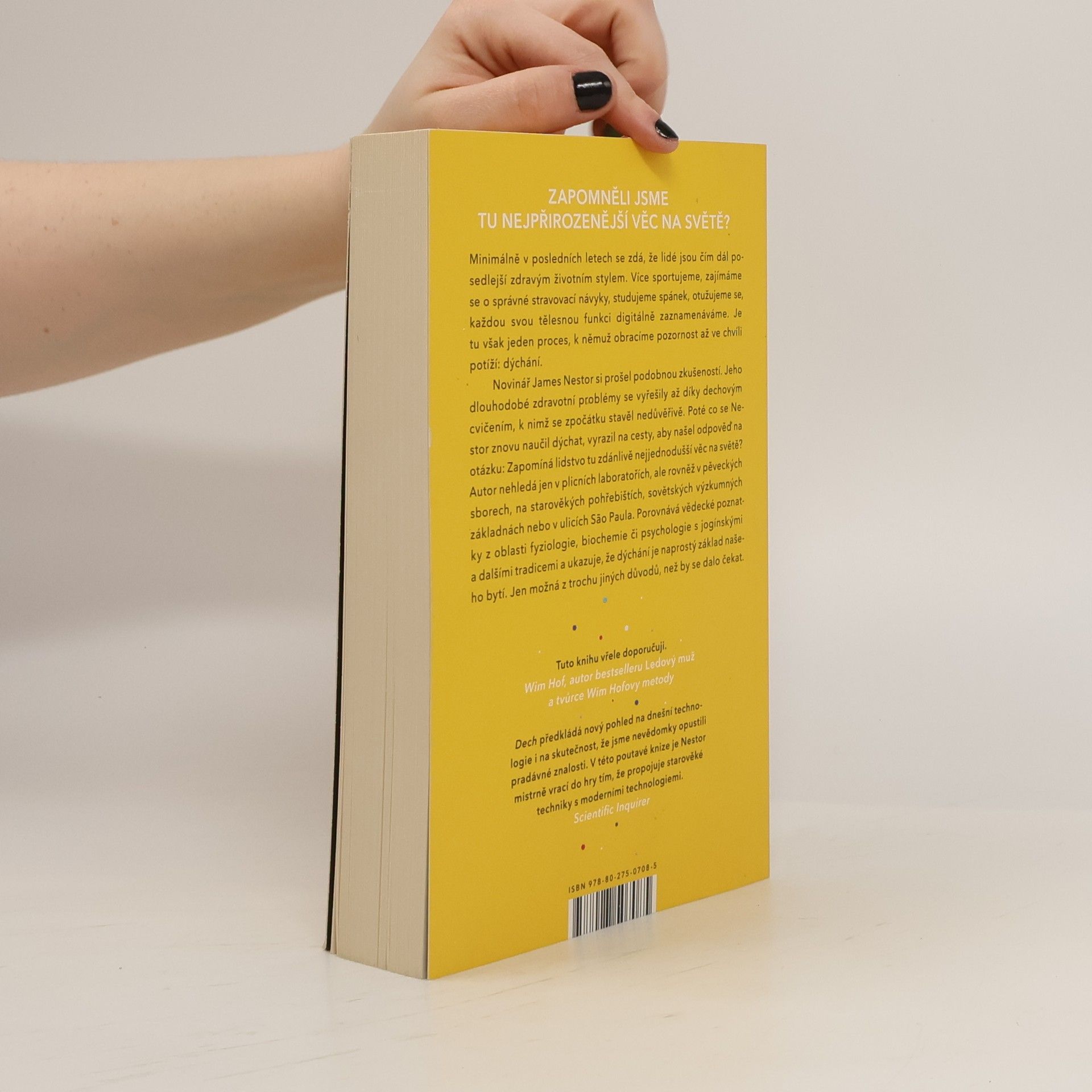 Nádech, výdech a znovu. Zapomněli jsme tu nejpřirozenější věc na světě? Minimálně v posledních letech se zdá, že lidé jsou čím dál posedlejší zdravým životním stylem. Více sportujeme, zajímáme se o správné stravovací návyky, studujeme spánek, otužujeme se, každou tělesnou funkci digitálně zaznamenáváme. Je tu však jeden proces, k němuž obracíme pozornost až ve chvíli potíží: dýchání. Novinář James Nestor si prošel podobnou zkušeností. Jeho dlouhodobé zdravotní problémy se vyřešily až díky dechovým cvičením, k nimž se zpočátku stavěl nedůvěřivě. Poté co se Nestor znovu naučil dýchat, vyrazil na cesty, aby našel odpověď na otázku: Zapomíná lidstvo tu zdánlivě nejjednodušší věc na světě? Autor nehledá jen v plicních laboratořích, ale rovněž u pěveckých sborů, na starověkých pohřebištích, sovětských výzkumných základnách nebo v ulicích Săo Paula. Porovnává vědecké poznatky z oblasti fyziologie, biochemie či psychologie s jogínskými a dalšími tradicemi a ukazuje, že dýchání je naprostý základ našeho bytí. Jen možná trochu jinak, než by se dalo čekat.