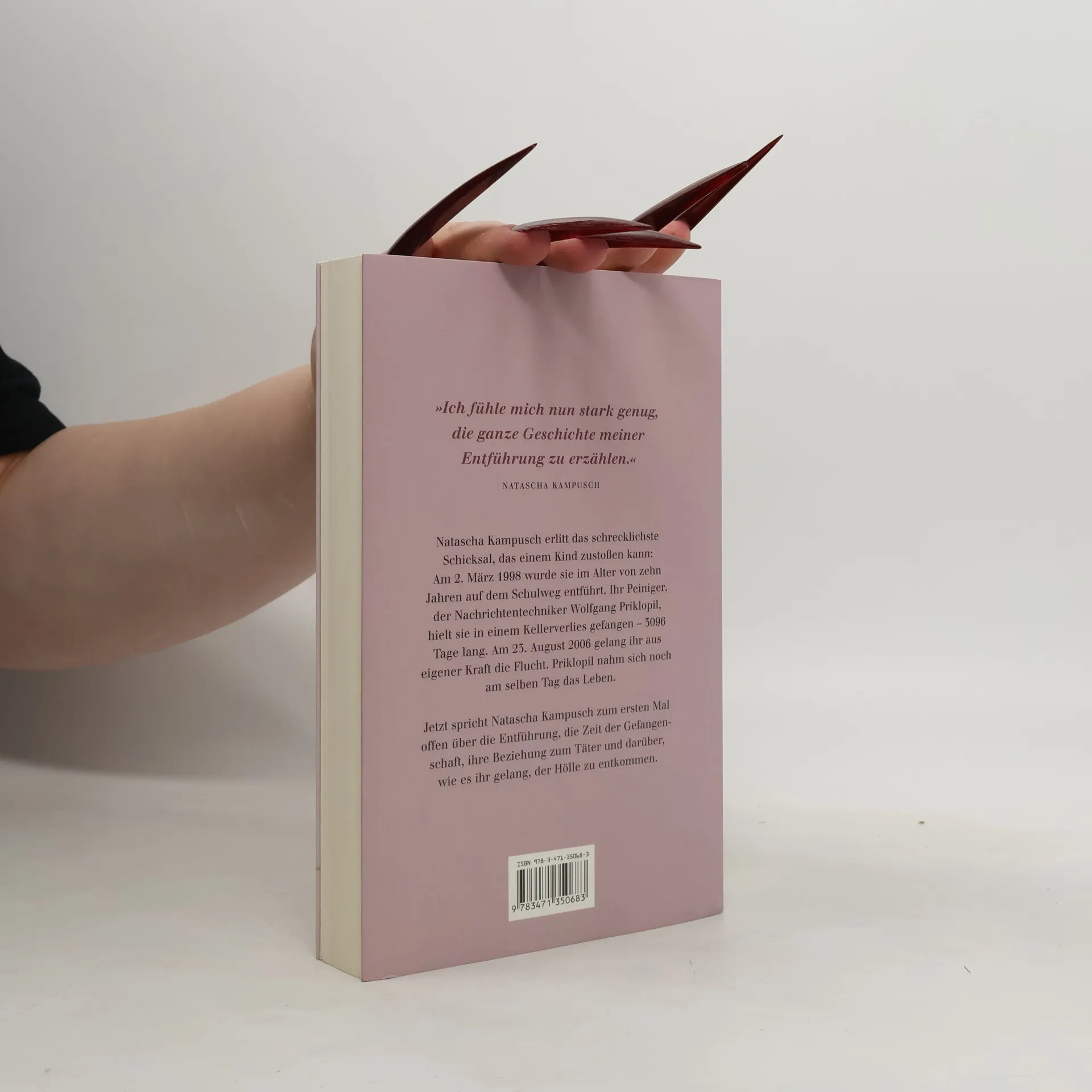 Natascha Kampusch erlitt das schrecklichste Schicksal, das einem Kind zustoßen kann: Am 2. März 1998 wurde sie im Alter von zehn Jahren auf dem Schulweg entführt. Ihr Peiniger, der Nachrichtentechniker Wolfgang Priklopil, hielt sie in einem Kellerverlies gefangen - 3096 Tage lang. Am 23. August 2006 gelang ihr aus eigener Kraft die Flucht. Priklopil nahm sich noch am selben Tag das Leben. Jetzt spricht Natascha Kampusch zm ersten Mal offen über ihre Entführung, die Zeit der Gefangenschaft, ihre Beziehung zum Täter und darüber, wie es ihr gelang, der Hölle zu entkommen.