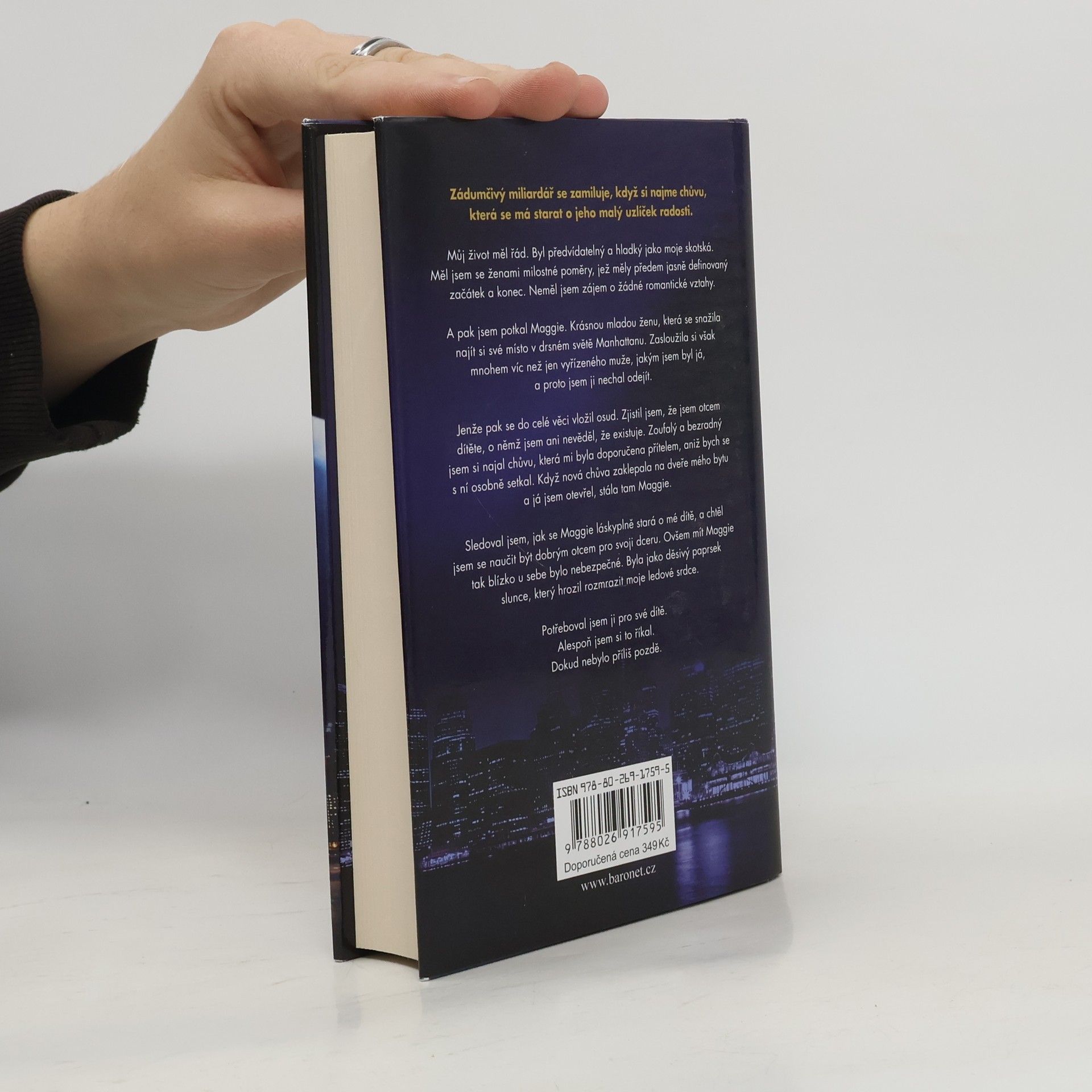 Zádumčivý miliardář se zamiluje, když si najme chůvu, která se má starat o jeho malý uzlíček radosti. Můj život měl řád. Byl předvídatelný a hladký jako moje skotská. Měl jsem se ženami milostné poměry, které měly předem jasně definovaný začátek a konec. Neměl jsem zájem o žádné romantické vztahy. A pak jsem potkal Maggie. Krásnou mladou ženu, která se snažila najít si své místo v drsném světě Manhattanu. Zasloužila si však mnohem víc než jen vyřízeného muže, jakým jsem byl já, a proto jsem ji nechal odejít. Ale do celé věci se vložil osud. Zjistil jsem, že jsem otcem dítěte, o kterém jsem ani nevěděl, že existuje. Zoufalý a bezradný jsem si najal chůvu, která mi byla doporučena přítelem, aniž bych se s ní osobně setkal. Když nová chůva zaklepala na dveře mého bytu a já jsem otevřel, stála tam Maggie. Sledoval jsem, jak se Maggie láskyplně stará o mé dítě, a chtěl jsem se naučit být dobrým otcem pro svoji dceru. Ale mít Maggie tak blízko u sebe bylo nebezpečné. Byla jako děsivý paprsek slunce, který hrozil rozmrazit moje ledové srdce. Potřeboval jsem ji pro své dítě. Alespoň jsem si to říkal. Dokud nebylo příliš pozdě.