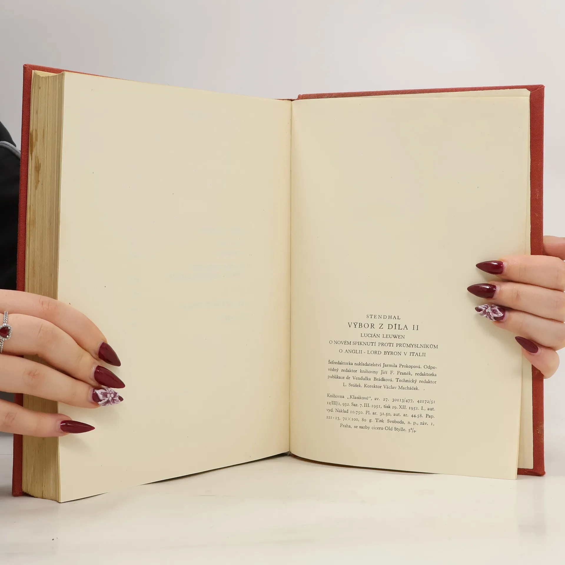 Kromě stati o charakteru průmyslníků ("O novém spiknutí proti průmyslníkům") a dvou črt: "O Anglii" a "Lord Byron v Italii" je v tomto 2. svazku vybraných děl velkého realisty pozoruhodný román "Lucien Leuwen", zřejmě opět s prvky autobiografickými. Je to práce nedokončená (chybí 3. část),která svým podtitulem "Rudá a bílá" (tj. barva revoluce a barva legitimistické reakce) je myšlena jako pendant k "Červené a černé" téhož autora. Hrdina L.L. je mladý muž a má o životě ideály, jež nemůže uskutečnit. Jako voják a jako tajemník ministra vnitra vidí, jaká je Francie za kapitalismu, který je největší překážkou hrdinovým ideálům, jaké jsou provokace tamní vlády, jaké její volební podvody a jak ve Francii vládou skutečnou je finanční klika.