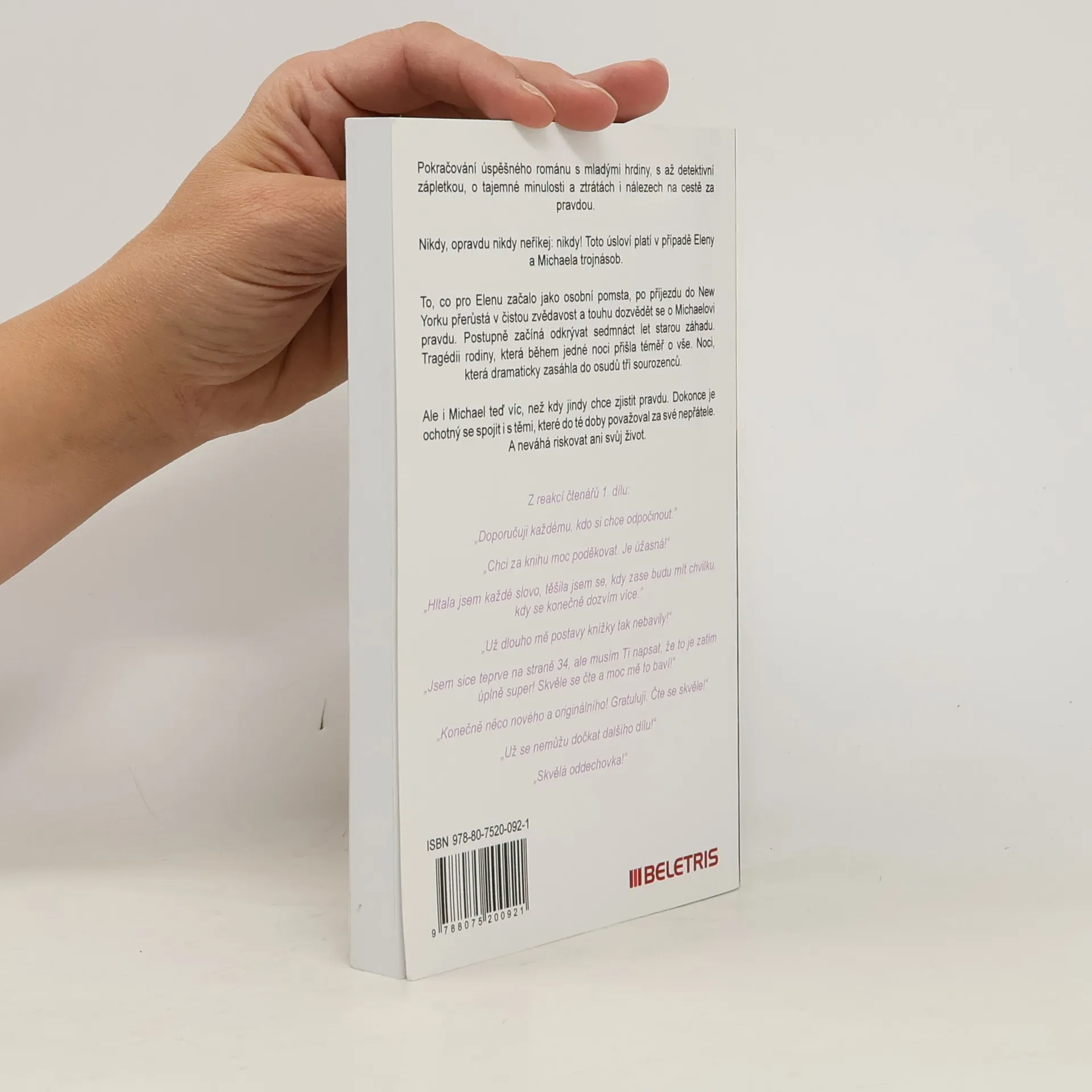 Pokračování úspěšného románu s mladými hrdiny, s až detektivní zápletkou, o tajemné minulosti a ztrátách i nálezech na cestě za pravdou. Nikdy, opravdu nikdy neříkej: nikdy! Toto úsloví platí v případě Eleny a Michaela trojnásob. To, co pro Elenu začalo jako osobní pomsta, po příjezdu do New Yorku přerůstá v čistou zvědavost a touhu dozvědět se o Michaelovi pravdu. Postupně začíná odkrývat sedmnáct let starou záhadu. Tragédii rodiny, která během jedné noci přišla téměř o vše. Noci, která dramaticky zasáhla do osudů tří sourozenců. Ale i Michael teď víc, než kdy jindy chce zjistit pravdu. Dokonce je ochotný se spojit i s těmi, které do té doby považoval za své nepřátele. A neváhá riskovat ani svůj život.