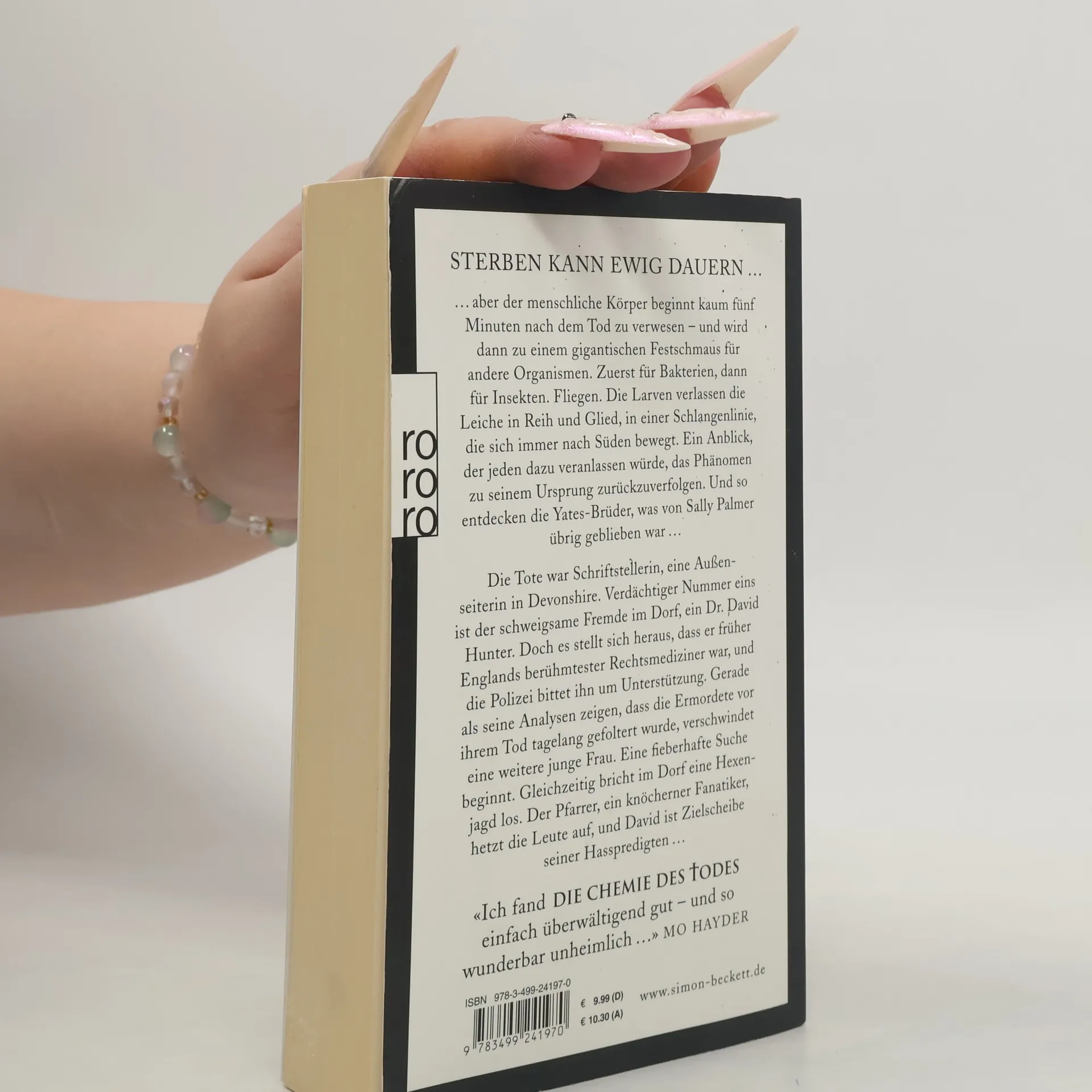 STERBEN KANN EWIG DAUERN ...... aber der menschliche Körper beginnt kaum fünf Minuten nach dem Tod zu verwesen – und wird dann zu einem gigantischen Festschmaus für andere Organismen. Zuerst für Bakterien, dann für Insekten. Fliegen. Die Larven verlassen die Leiche in Reih und Glied, in einer Schlangenlinie, die sich immer nach Süden bewegt. Ein Anblick, der jeden dazu veranlassen würde, das Phänomen zu seinem Ursprungzurückzuverfolgen. Und so entdecken die Yates-Brüder, was von Sally Palmer übrig geblieben war ...Die Tote war Schriftstellerin, eine Außenseiterin in Devonshire. Verdächtiger Nummer eins ist der schweigsame Fremde im Dorf, ein Dr. David Hunter. Doch es stellt sich heraus, dass er früher Englands berühmtester Rechtsmediziner war, und die Polizei bittet ihn um Unterstützung. Gerade als seine Analysen zeigen, dass die Ermordete vor ihrem Tod tagelang gefoltert wurde, verschwindet eine weitere junge Frau. Eine fieberhafte Suche beginnt. Gleichzeitig bricht im Dorf eine Hexenjagd los. Der Pfarrer, ein knöcherner Fanatiker, hetzt die Leute auf, und David ist Zielscheibe seiner Hasspredigten ...«Ich fand die Chemie des Todes einfach überwältigend gut – und so wunderbar unheimlich ...» MO HAYDER