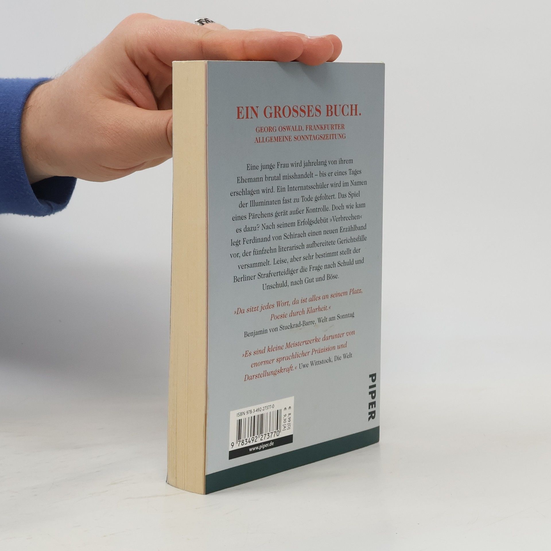 Eine junge Frau wird jahrelang von ihrem Ehemann brutal misshandelt – bis er eines Tages erschlagen wird. Ein Internatsschüler wird im Namen der Illuminaten fast zu Tode gefoltert. Das Spiel eines Pärchens gerät außer Kontrolle. Doch wie kam es dazu? Nach seinem Erfolgsdebüt »Verbrechen« legt Ferdinand von Schirach einen neuen Erzählband vor, der 15 literarisch aufbereitete Gerichtsfälle versammelt. Leise, aber sehr bestimmt stellt der Berliner Strafverteidiger die Frage nach Schuld und Unschuld, nach Gut und Böse.