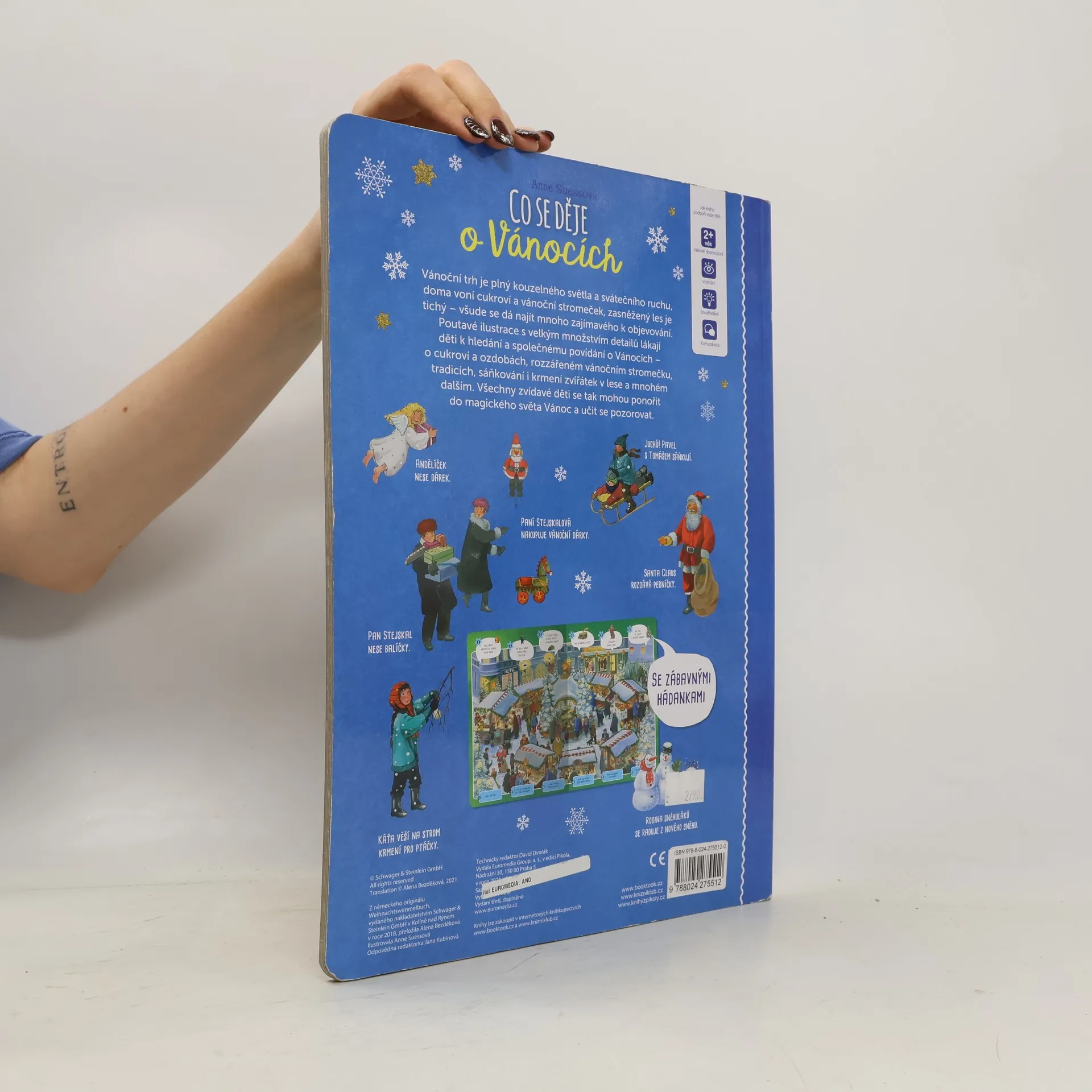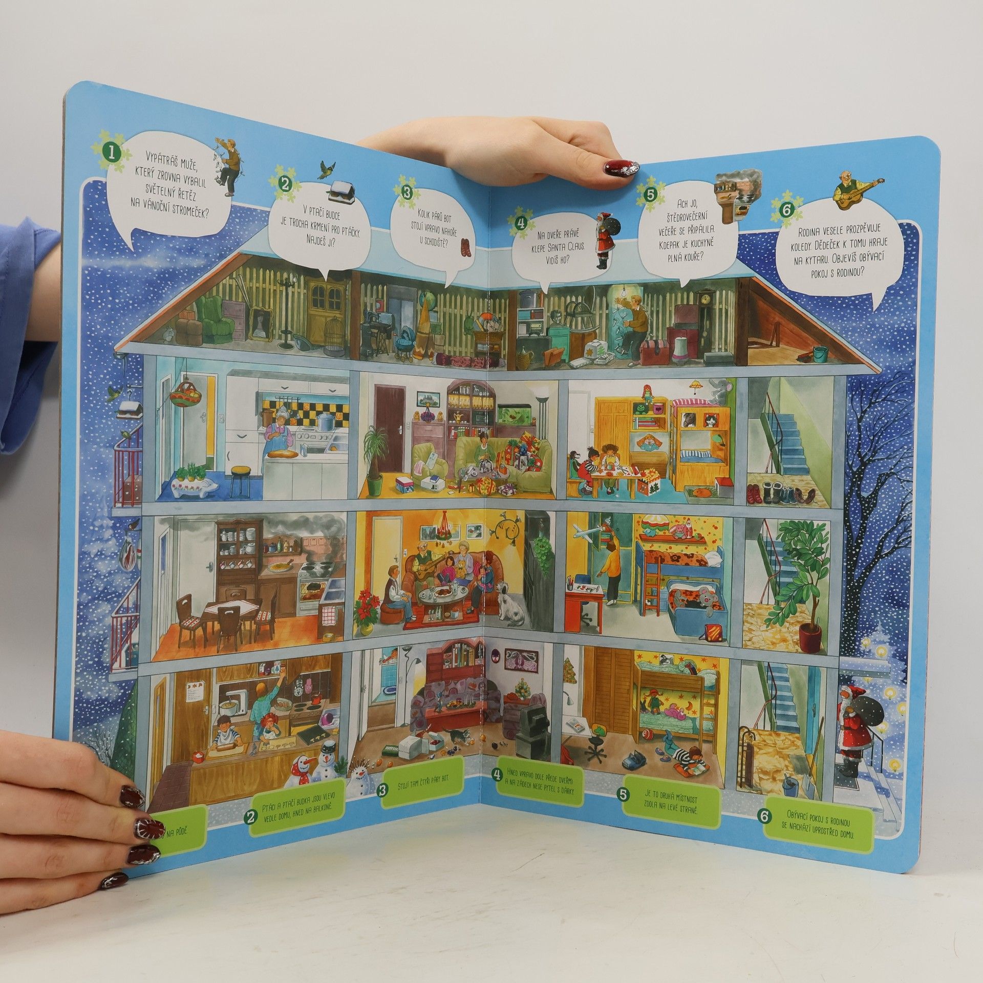 Vánoční trh je plný kouzelného světla a svátečního ruchu, doma voní cukroví a vánoční stromeček, zasněžený les je tichý – všude se dá najít mnoho zajímavého k objevování. Poutavé ilustrace s velkým množstvím detailů lákají děti k hledání a společnému povídání o Vánocích, o cukroví a ozdobách, rozzářeném vánočním stromečku, tradicích, sáňkování i krmení zvířátek v lese a mnohém dalším. Všichni malí čtenáři se tak mohou ponořit do magického světa Vánoc a učit se pozorovat. Pro děti od 2 let.