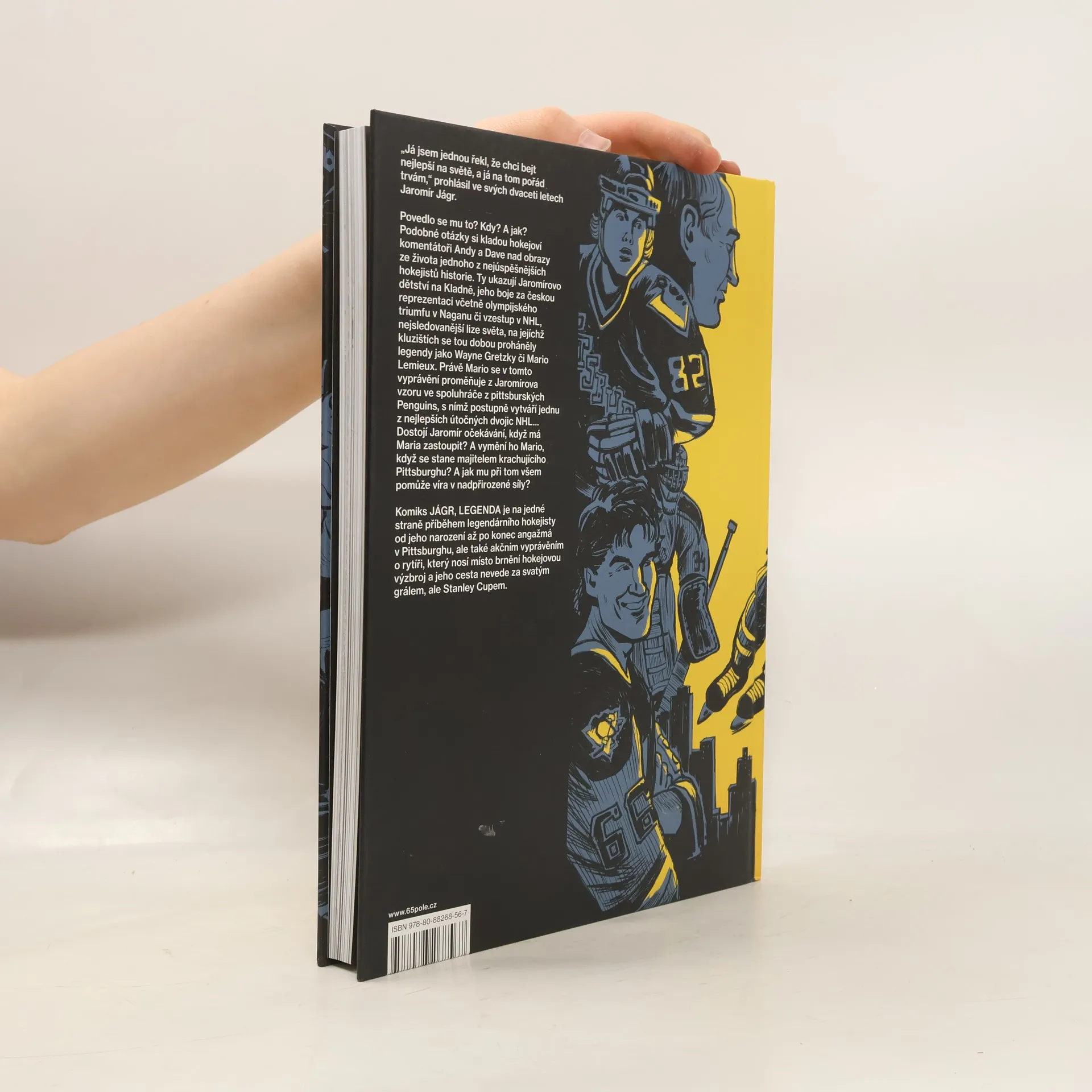 „Já jsem jednou řekl, že chci bejt nejlepší na světě, a já na tom pořád trvám,“ prohlásil ve svých dvaceti letech Jaromír Jágr. Povedlo se mu to? Kdy? A jak? Podobné otázky si kladou hokejoví komentátoři Andy a Dave nad obrazy ze života jednoho z nejúspěšnějších hokejistů historie. Ty ukazují Jaromírovo dětství na Kladně, jeho boje za českou reprezentaci včetně olympijského triumfu v Naganu či vzestup v NHL, nejsledovanější lize světa, na jejíchž kluzištích se tou dobou proháněly legendy jako Wayne Gretzky či Mario Lemieux. Právě Mario se v tomto vyprávění proměňuje z Jaromírova vzoru ve spoluhráče z pittsburských Penguins, s nímž postupně vytváří jednu z nejlepších útočných dvojic NHL… Dostojí Jaromír očekávání, když má Maria zastoupit? A vymění ho Mario, když se stane majitelem krachujícího Pittsburghu? A jak mu při tom všem pomůže víra v nadpřirozené síly? Komiks Jágr, Legenda je na jedné straně příběhem legendárního hokejisty od jeho narození až po konec angažmá v Pittsburghu, ale také akčním vyprávěním o rytíři, který nosí místo brnění hokejovou výzbroj a jeho cesta nevede za svatým grálem, ale Stanley Cupem.