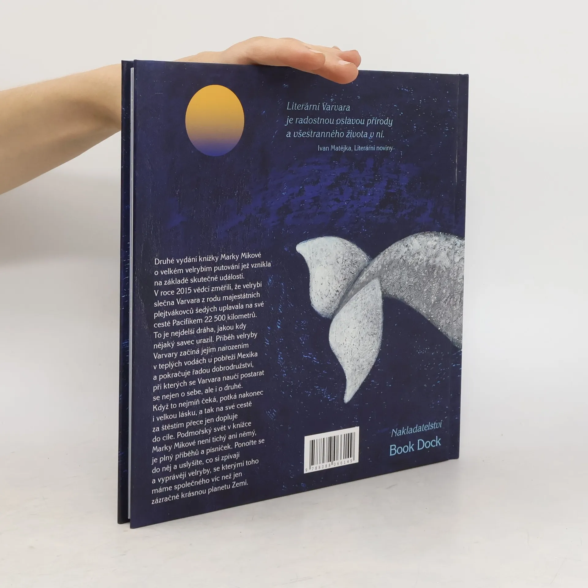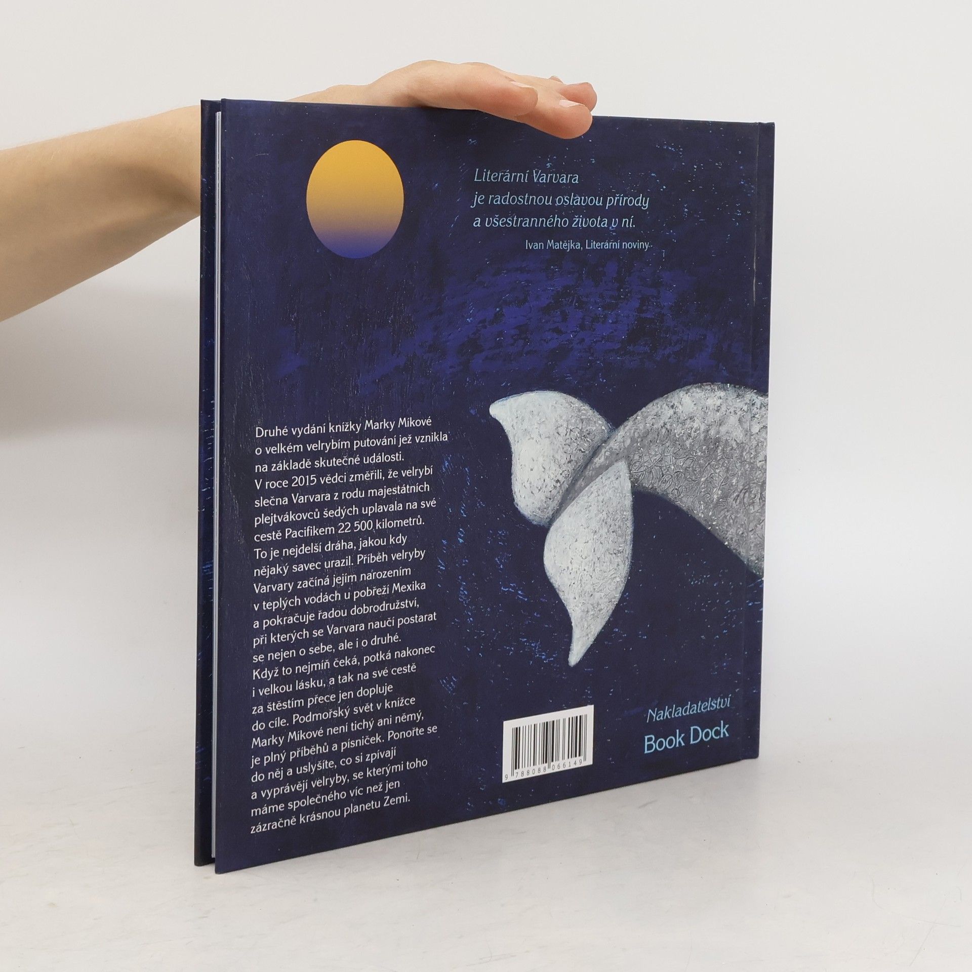 Nejdřív nebyla nic. Jen taková kapka vody. Potom se to s ní začalo motat a točit a mrskat a prskat a bublat a ona vykřikla ze všech sil něco jako: „Já? jsem!“ Pak uslyšela mámin smích a tátův gejzír, jak tryská k obloze, a šplouchání a veselý zpěv…Knížka Marky Míkové o velkém velrybím putování vznikla na základě skutečné události. V roce 2015 vědci změřili, že velrybí slečna Varvara z rodu majestátních plejtvákovců šedých uplavala na své cestě Pacifikem 22 500 km, což je nejdelší dráha, jakou kdy nějaký savec urazil. Příběh velryby Varvary začíná jejím narozením v teplých vodách u pobřeží Kalifornie a pokračuje řadou dobrodružství, při kterých se Varvara naučí starat se nejen o sebe, ale i o druhé. Když to nejmíň čeká, potká nakonec i velkou lásku, a tak na své cestě za štěstím přece jen dopluje do cíle. Podmořský svět v knížce Marky Míkové není tichý ani němý, je plný příběhů a písniček. Ponořte se do něj a uslyšíte, co si zpívají a vyprávějí velryby, se kterými toho máme společného víc než jen zázračně krásnou planetu Zemi.
