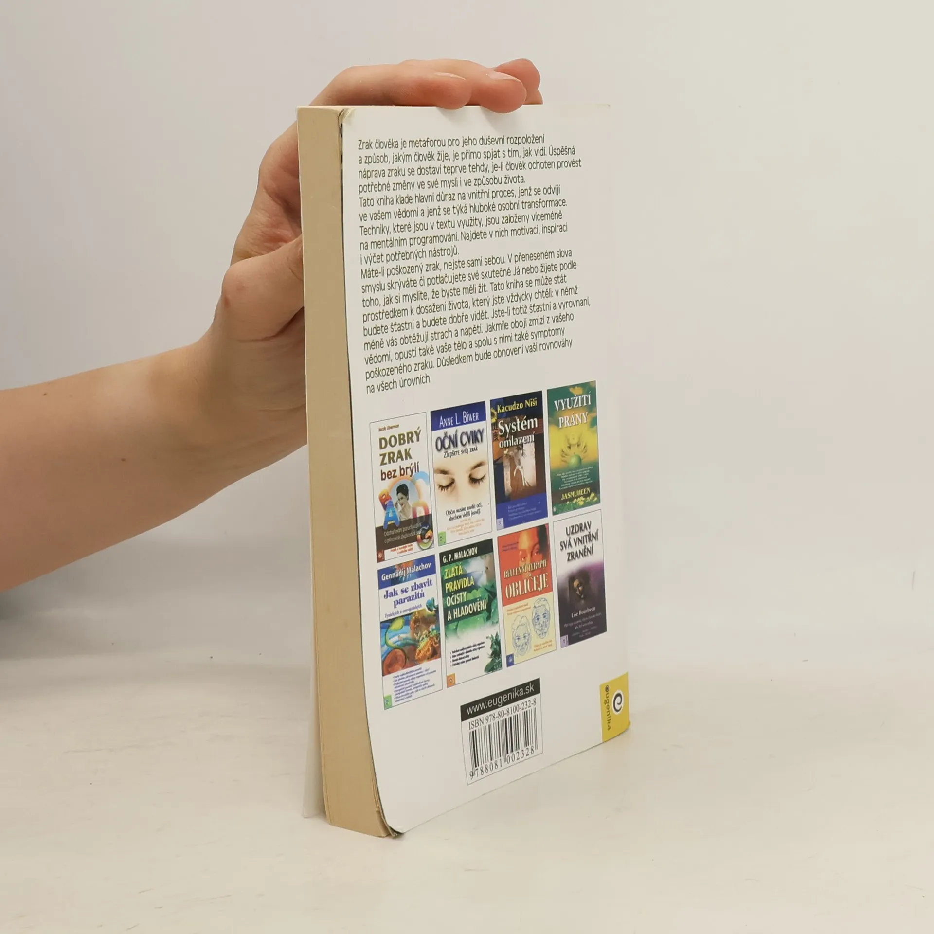Vidíme tak, jak žijeme Zrak člověka je metaforou pro jeho duševní rozpoložení a způsob, jakým člověk žije, je přímo spjat s tím, jak vidí. Úspěšná náprava zraku se dostaví teprve tehdy, je-li člověk ochoten provést potřebné změny ve své mysli i ve způsobu života. Tato kniha klade hlavní důraz na vnitřní proces, jenž se odvíjí ve vašem vědomí a jenž se týká hluboké osobní transformace. Techniky, které jsou v textu využity, jsou založeny víceméně na mentálním programování. Najdete v nich motivaci, inspiraci i konkrétní návody.