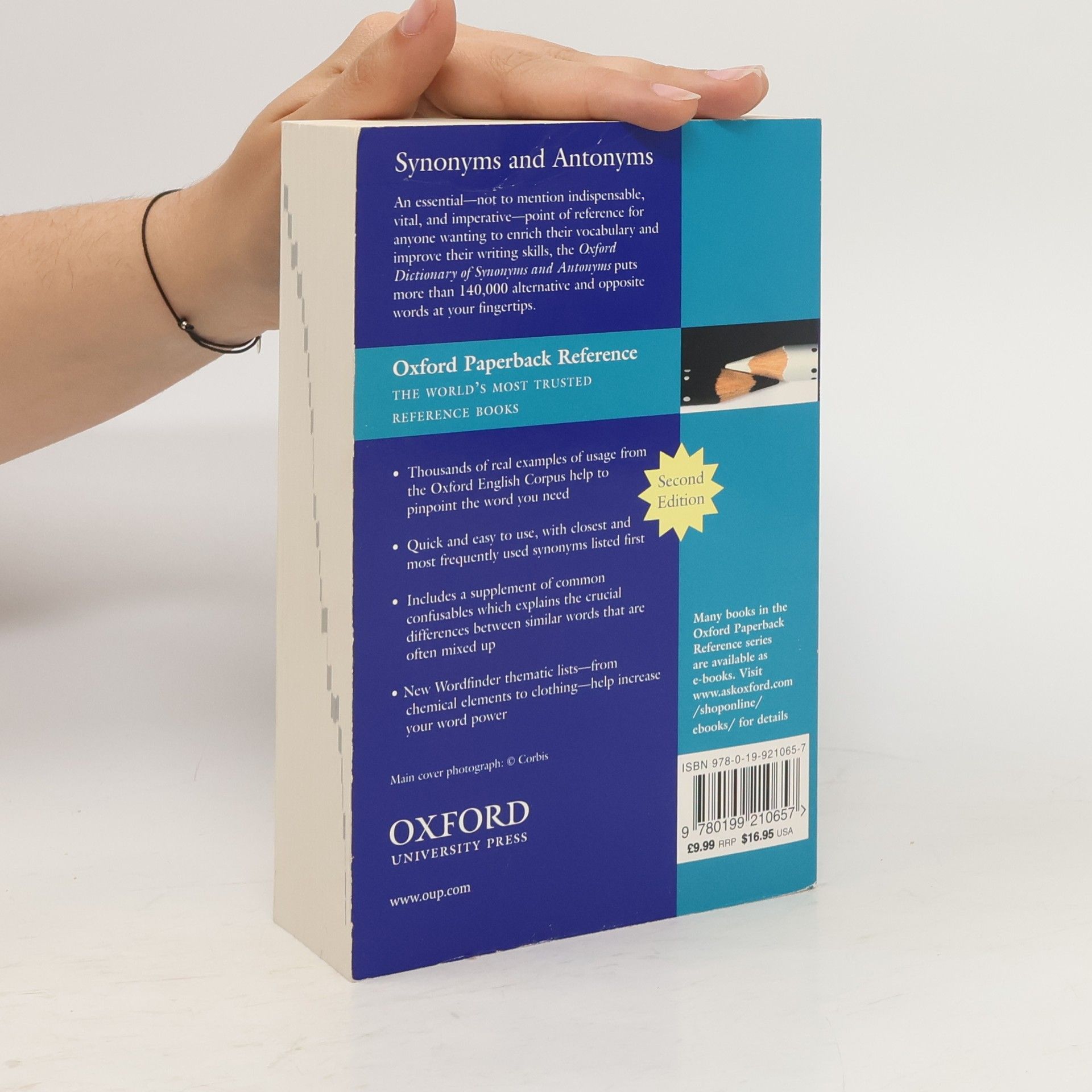 Authoritative, accessible, and completely up to date, this new edition of the popular Oxford Dictionary of Synonyms and Antonyms is an invaluable guide for anyone wanting to build their vocabulary and invigorate their writing skills.Over 140,000 alternative and opposite words are given with the closest, most frequently used synonyms listed first. In addition, thousands of real-life examples of usage from the Oxford English Corpus put the words in the context of sentences, which helps the reader to pinpoint the rightword quickly and easily (and avoid embarrassing mistakes). Also included are some useful appendices designed to improve your knowledge of the language: a new Wordfinder section offers a selection of thematic lists--from chemical elements and clothing to phobias and flowers--and a Common Confusablessupplement highlights the crucial differences between similar words that are often mixed up.Anyone wanting a practical and accessible language guide that will expand their vocabulary and sharpen their writing skills--including families, wordgame buffs, and students learning English as a foreign language--will want this dictionary on their reference shelf.