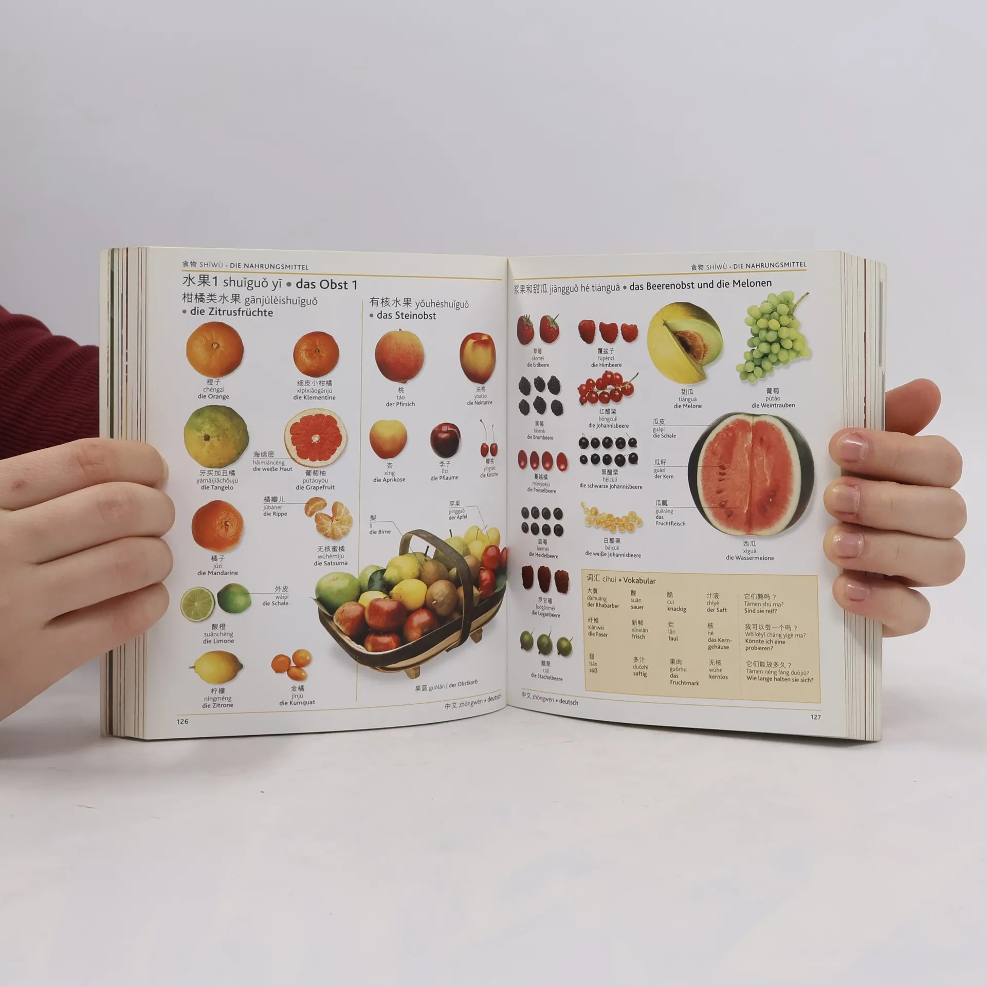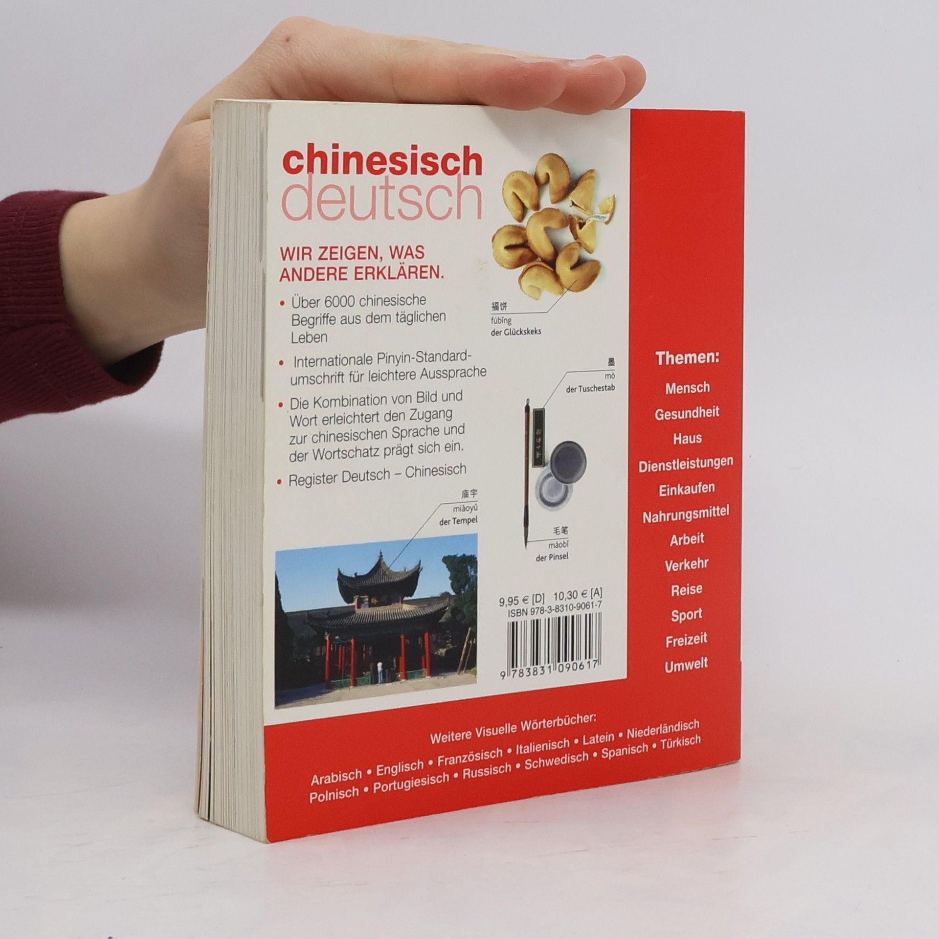 Dieses kompakte Bildwörterbuch stellt über 6000 chinesische Begriffe und deren deutsche Übersetzung vor. Für eine einfache Aussprache sind die chinesischen Vokabeln (Mandarin) sowohl in chinesischen Schriftzeichen als auch in der standardisierten Pinyin-Umschrift angegeben. Über 1600 farbige Fotografien und Grafiken sowie eine systematische Gliederung in verschiedene Bereiche des alltäglichen Lebens ermöglichen einen schnellen und lebendigen Zugang zur chinesischen Sprache. Informationskästen mit grammatischen Erläuterungen runden das Buch ab. Ein anschaulicher, praktischer und kompetenter Begleiter für Reise, Beruf und zum Nachschlagen zu Hause.