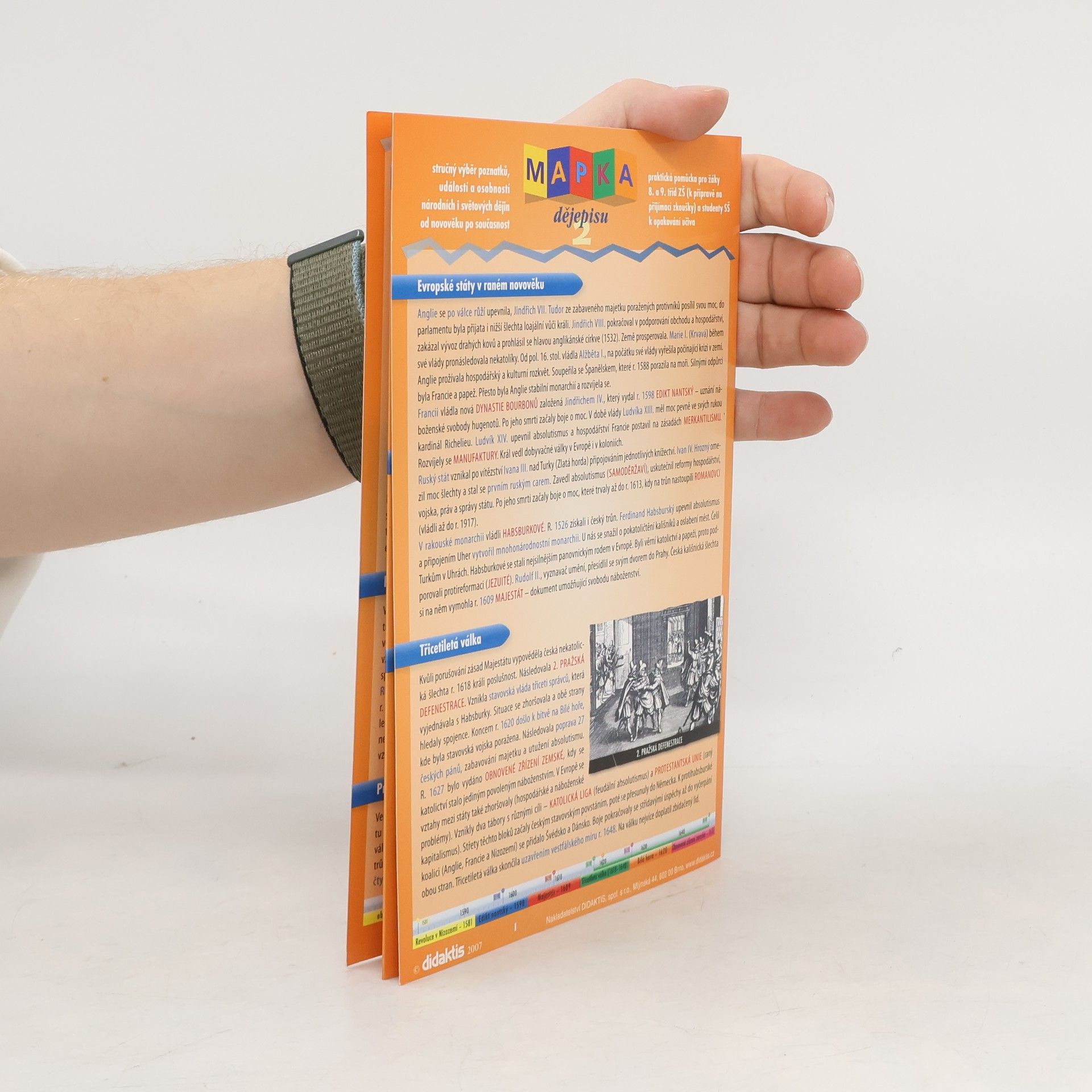 Jedinečná učební pomůcka ve formátu harmoniky nahrazující zdlouhavé vyhledávání poznámek v sešitech dějepisu, je určena především žákům 2. stupně ZŠ, ale i studentům prvních ročníků SŠ. 8 přehledně zpracovaných stran předkládá základní poznatky a pojmy týkající se historického vývoje od novověku až po nejnovější dějiny.