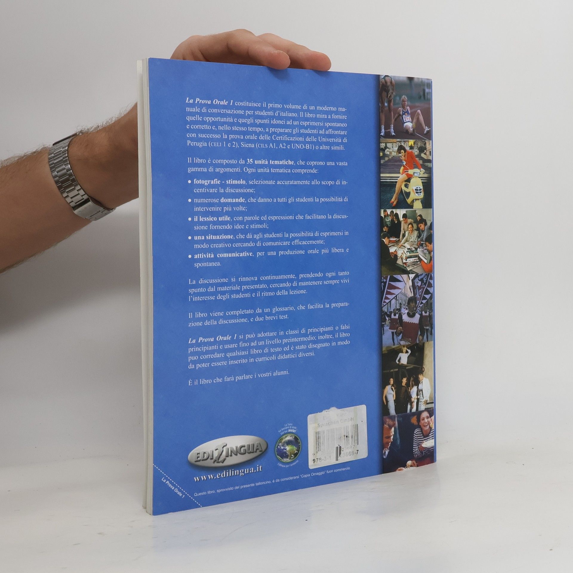 Temel ve orta seviyede (A1-B1) Italyanca ogrenimi icin, konusma becerilerini gelistirmek icin konusma calismalari ve testleri.Materiale per lo sviluppo dell'abilità di produzione orale. Livello elementare-preintermedio (A1-B1)La Prova Orale 1 costituisce il primo volume di un moderno manuale di conversazione che mira a fornire quelle opportunità e quegli spunti necessari ad esprimersi in modo spontaneo e corretto. e, nello stesso tempo, a preparare gli studenti ad affrontare con successo la prova orale delle certificazioni delle Università di Perugia (Celi 1 e 2) e Siena (Cils A1, A2 e Uno-B1), Plida (A1, A2 e B1) o altri diplomi.Il libro è composto da 35 unità tematiche, che coprono una vasta gamma di argomenti. Ogni unità tematica fotografie-stimolo, numerose domande, il lessico utile, attività comunicative e un role-play. La discussione si rinnova continuamente, prendendo ogni tanto spunto dal materiale presentato, cercando di mantenere sempre vivi l'interesse degli studenti e il ritmo della lezione. Il libro viene completato da un glossario e due brevi test.La Prova Orale 1 si può adottare in classi di principianti o falsi principianti e usare fino a un livello preintermedio; inoltre, il libro è stato disegnato in modo da poter essere inserito in curricoli didattici diversi.(Tanitim Bulteninden)Sayfa 88Baski 2010 Nuans