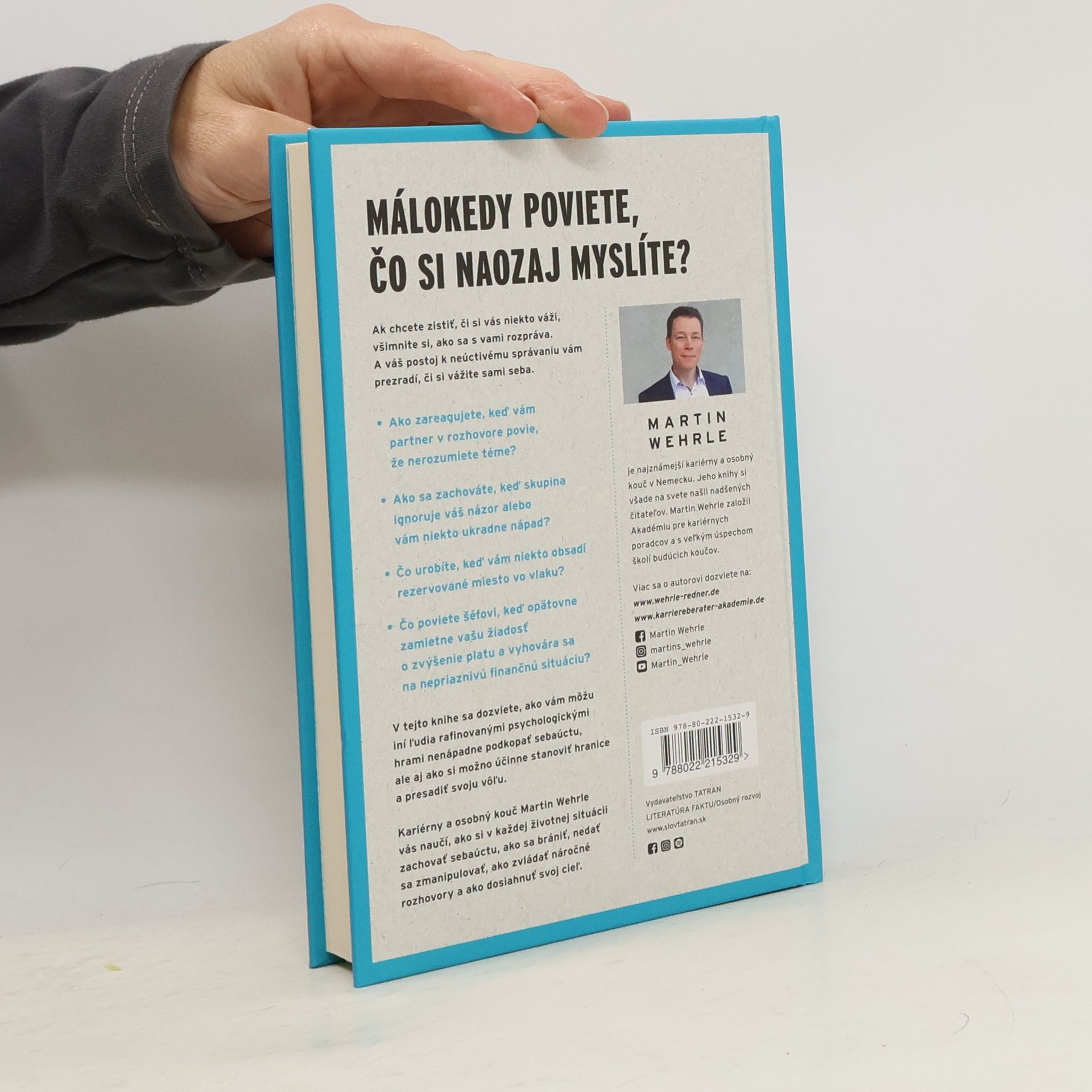 Povedz, čo si myslíš, a získaj, čo si zaslúžiš. Málokedy poviete, čo si naozaj myslíte? Ak chcete zistiť, či si vás niekto váži, všimnite si, ako sa s vami rozpráva. A váš postoj k neúctivému správaniu vám prezradí, či si vážite sami seba. - Ako zareagujete, keď vám partner v rozhovore povie, že nerozumiete téme? - Ako sa zachováte, keď skupina ignoruje váš názor alebo vám niekto ukradne nápad? - Čo urobíte, keď vám niekto obsadí rezervované miesto vo vlaku? - Čo poviete šéfovi, keď opätovne zamietne vašu žiadosť o zvýšenie platu a vyhovára sa na nepriaznivú finančnú situáciu? V tejto knihe sa dozviete, ako vám môžu iní ľudia rafinovanými psychologickými hrami nenápadne podkopať sebaúctu, ale aj ako si možno účinne stanoviť hranice a presadiť svoju vôľu. Kariérny a osobný kouč Martin Wehrle vás naučí, ako si v každej životnej situácii zachovať sebaúctu, ako sa brániť, nedať sa zmanipulovať, ako zvládať náročné konverzácie a ako dosiahnuť svoje ciele.