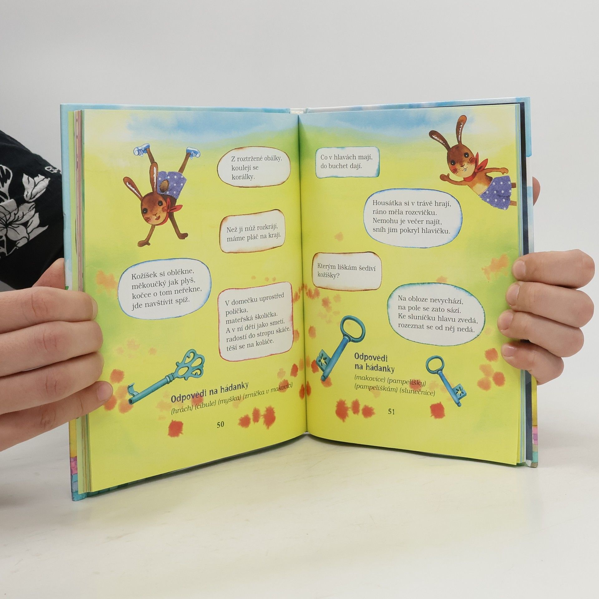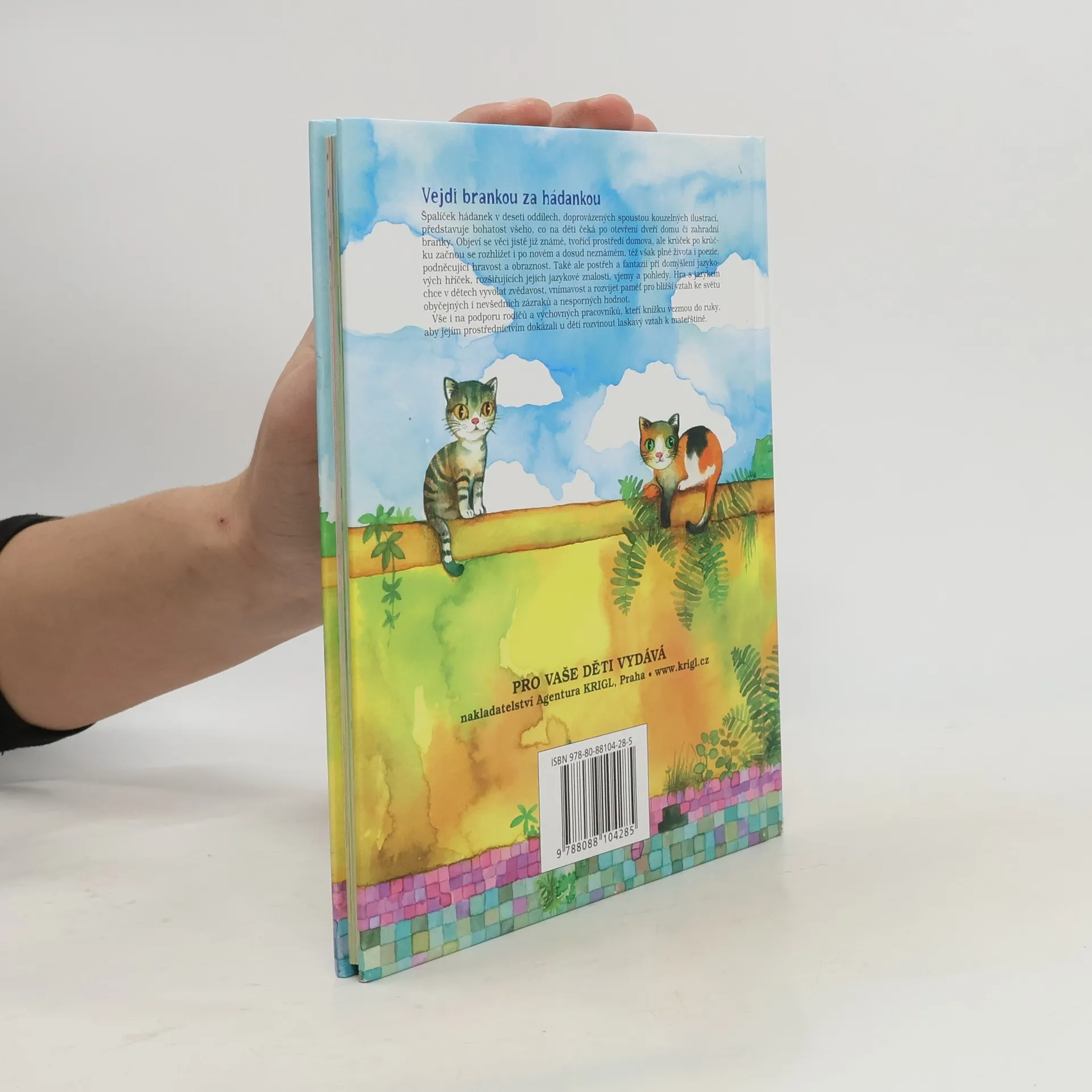 Špalíček hádanek v deseti oddílech, doprovázených spoustou kouzelných ilustrací, představuje bohatost všeho, co na děti čeká po otevření dveří domu či zahradní branky. Objeví se věci jistě již známé, tvořící prostředí domova, ale krůček po krůčku začnou se rozhlížet i po novém a dosud neznámém, též však plné života i poezie, podněcující hravost a obraznost. Také ale postřeh a fantazii při domýšlení jazykových hříček, rozšiřujících jejich jazykové znalosti, vjemy a pohledy. Hra s jazykem chce v dětech vyvolat zvědavost, vnímavost a rozvíjet paměť pro bližší vztah ke světu obyčejných i nevšedních zázraků a nesporných hodnot. Vše i na podporu rodičů a výchovných pracovníků, kteří knížku vezmou do ruky, aby jejím prostřednictvím dokázali u dětí rozvinout laskavý vztah k mateřštině.