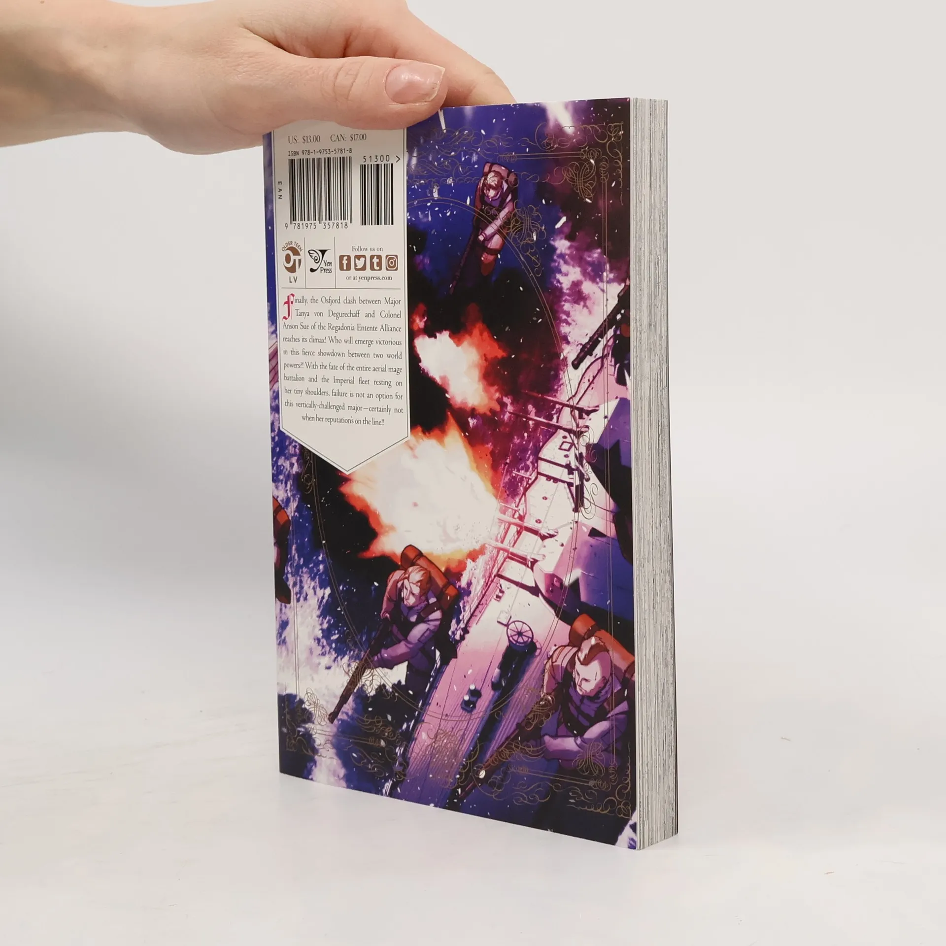 "Finally, the Osfjord clash between Major Tanya von Degurechaff and Colonel Anson Sue of the Regadonia Entente Alliance reaches its climax! Who will emerge victorious in this fierce showdown between two world powers? With the fate of the entire aerial mage battalion and the Imperial fleet resting on her tiny shoulders, failure is not an option for this vertically-challenged major -- certainly not when her reputations' on the line"--Page 4 of cover