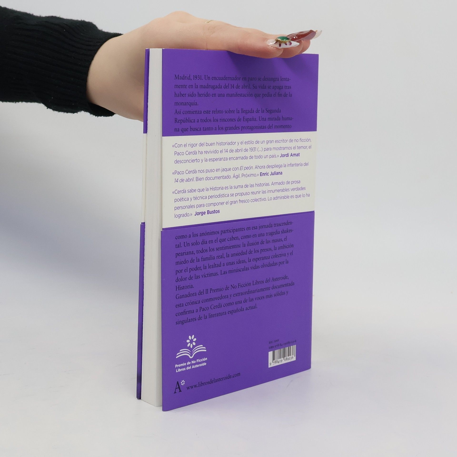 Obra ganadora del II Premio de No Ficción Libros del Asteroide. Una crónica épica de la proclamación de la República a partir de la mirada a los olvidados de la Historia. Madrid, 1931. Un encuadernador en paro se desangra lentamente en la madrugada del 14 de abril. Su vida se apaga tras haber sido herido en una manifestación que pedía el fin de la monarquía. Así comienza este relato sobre la llegada de la Segunda República a todos los rincones de España. Una mirada humana que busca tanto a los grandes protagonistas del momento como a los anónimos participantes en esa jornada trascendental. Un solo día en el que caben, como en una tragedia shakespeariana, todos los sentimientos: la ilusión de las masas, el miedo de la familia real, la ansiedad de los presos, la ambición por el poder, la lealtad a unas ideas, la esperanza colectiva y el dolor de las víctimas. Las minúsculas vidas olvidadas por la Historia. Ganadora del II Premio de No Ficción Libros del Asteroide, esta crónica conmovedora y extraordinariamente documentada confirma a Paco Cerdà como una de las voces más sólidas y singulares de la literatura española actual. [Texto de la editorial]