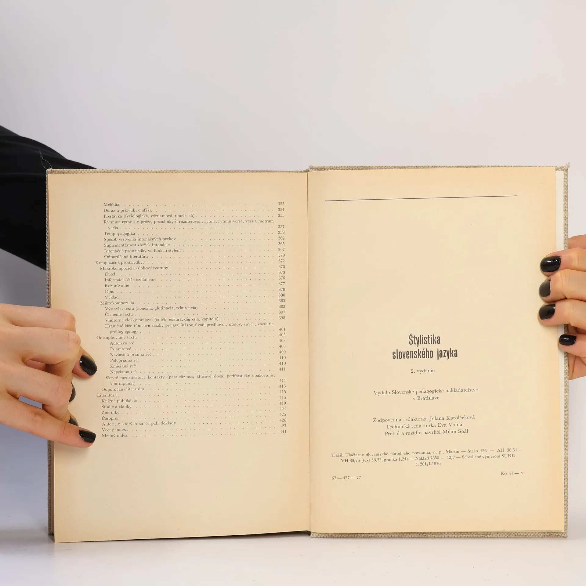 Dejiny štylistiky, štýlotvorné činitele, proces štylistickej diferenciácie, analýza štýlov, štylistické prostriedky. Odborná literatúra, vecný index, menný index. Prvé vydanie.