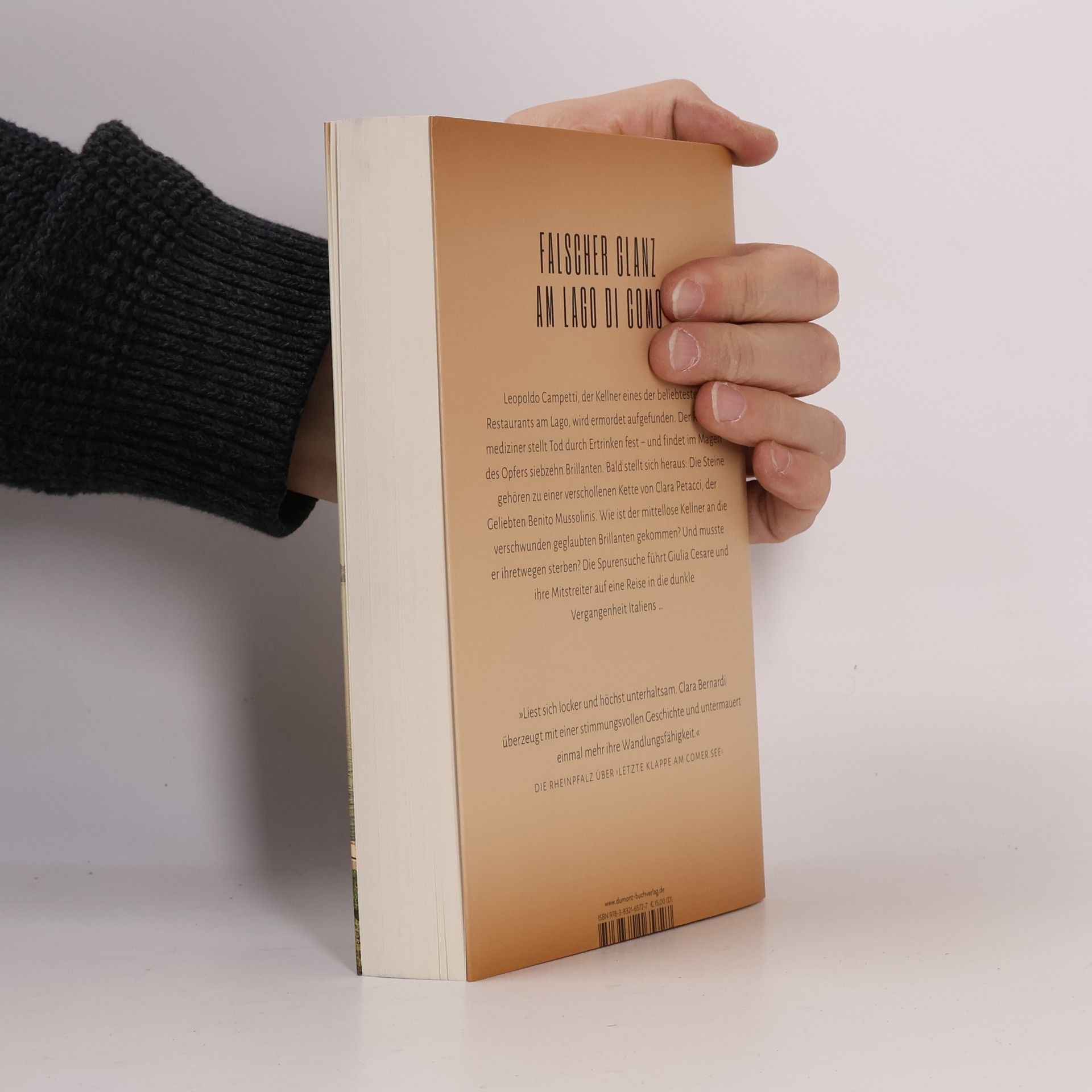 Menaggio am Comer See: ockerfarbene Palazzi, enge Gassen und eine üppig bepflanzte Uferpromenade, die sich entlang der pastellfarbenen Häuserfassaden windet – die perfekte Postkartenidylle. Doch die Idylle wird zum Tatort. Leopoldo Campetti, erster Kellner im Ristorante di Paolo, einem der beliebtesten und angesagtesten Restaurants im Ort, schwimmt tot im Lago, angebunden an ein Motorboot. Der Rechtsmediziner stellt Tod durch Ertrinken fest − und findet im Magen des Opfers siebzehn wertvolle Brillanten. Anhand der Goldfassung und des Schliffes lässt sich feststellen, dass die Steine aus den 1930er-Jahren stammen müssen, und bald wird klar: Sie gehören zu einer verschwundenen Kette von Clara Petacci. Die langjährige Geliebte Benito Mussolinis wurde gemeinsam mit dem Duce im April 1945 am Comer See von Partisanen gefangen genommen und schließlich ermordet. Wie ist der mittellose Kellner an die kostbaren, verschollen geglaubten Steine gekommen? Und musste er wegen der Brillanten sterben? Giulia Cesare ermittelt gemeinsam mit ihrem Freund, dem Postboten Brutus, und ihre gefährliche Spurensuche führt sie tief in die dunkle Vergangenheit Italiens.