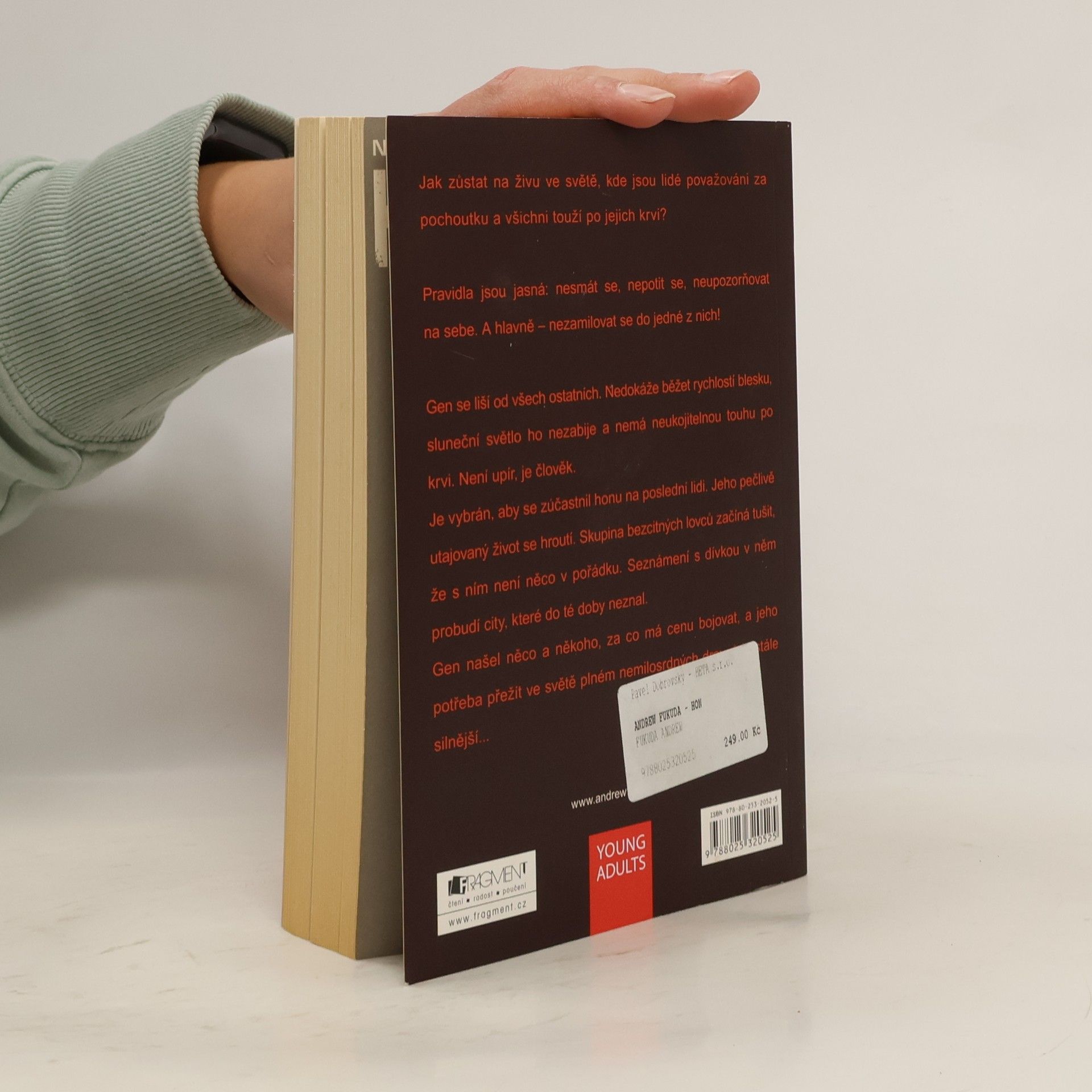 Jak zůstat na živu ve světě, kde jsou lidé považováni za pochoutku a všichni touží po jejich krvi? Pravidla jsou jasná: nesmát se, nepotit se, neupozorňovat na sebe. A hlavně – nezamilovat se do jedné z nich! Gen se liší od všech ostatních. Nedokáže běžet rychlostí blesku, sluneční světlo ho nezabije a nemá neukojitelnou touhu po krvi. Není upír, je člověk. Je vybrán, aby se zúčastnil honu na poslední lidi. Jeho pečlivě utajovaný život se hroutí. Skupina bezcitných lovců začíná tušit, že s ním není něco v pořádku. Seznámení s dívkou v něm probudí city, které do té doby neznal. Gen našel něco a někoho, za co má cenu bojovat, a jeho potřeba přežít ve světě plném nemilosrdných dravců je stále silnější... První vydání. -- zdroj: legie.info --