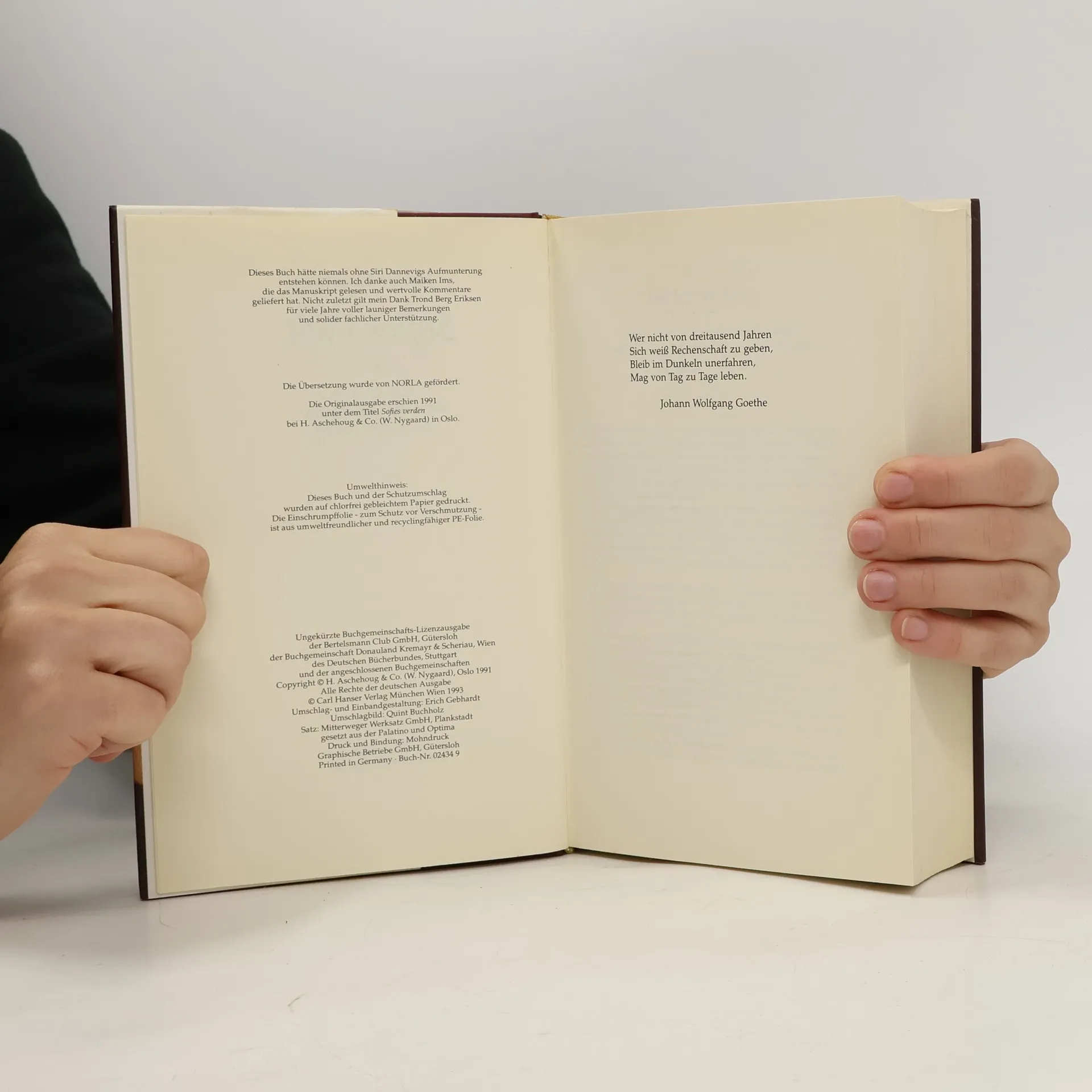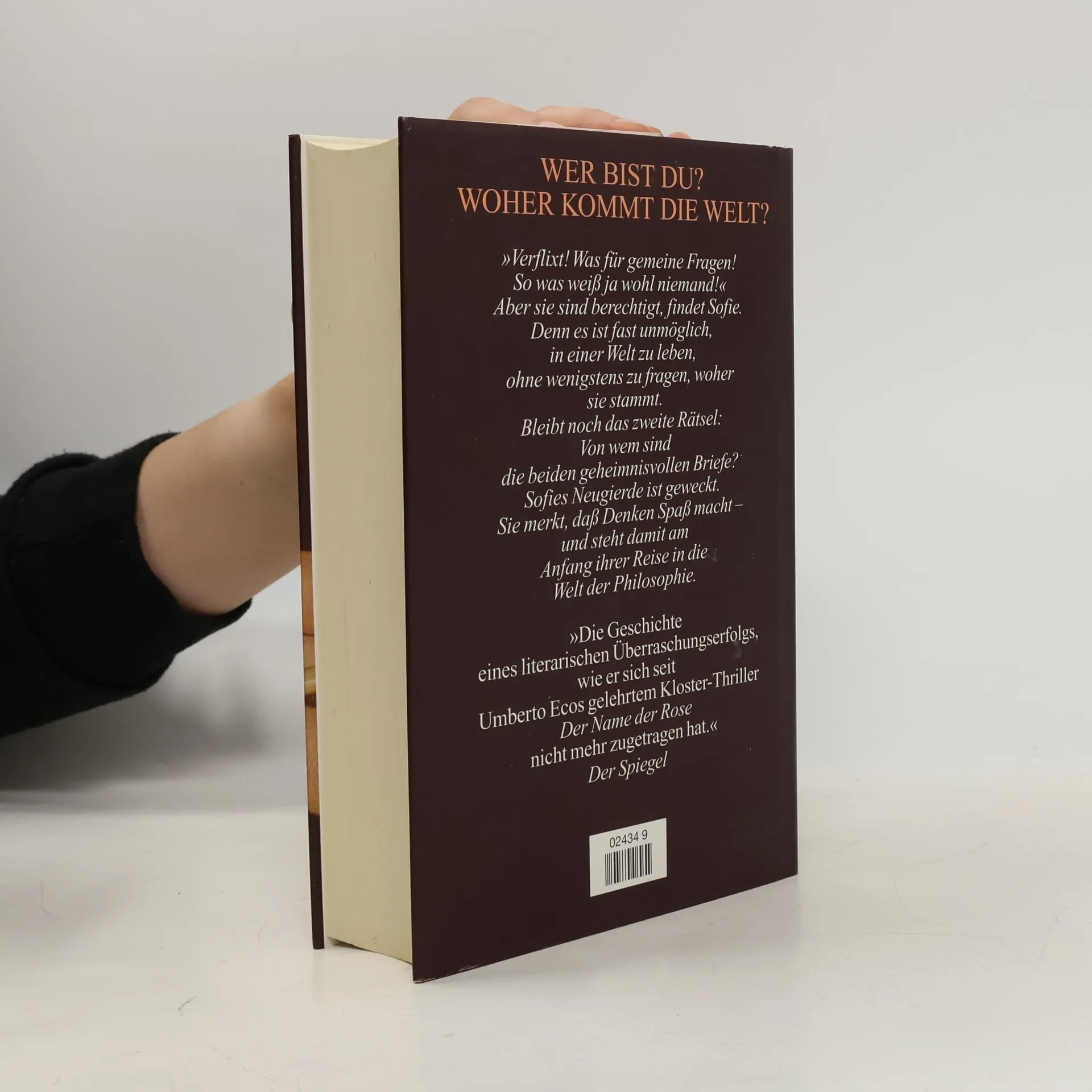 »Ein dickes Buch, mit spitzen Fingern angefaßt und mit Begeisterung zugeklappt: ein großer Wurf im wörtlichen wie übertragenen Sinn.« Die Zeit Mysteriöse Briefe landen im Briefkasten der 15jährigen Sofie Amundsen in Oslo. Was sollen diese Fragen: »Wer bist du?«, »Was ist ein Mensch?« und »Woher kommt die Welt?«. Sofie ist irritiert. Die Briefe werden ausführlicher und entführen sie in die abenteuerliche und geheimnisvolle Gedankenwelt der großen Philosophen. Ihr unbekannter Briefeschreiber erzählt Sofie die Geschichte Europas, der Antike, des Mittelalters und der Renaissance und dann nimmt die Geschichte eine unglaubliche Wendung.